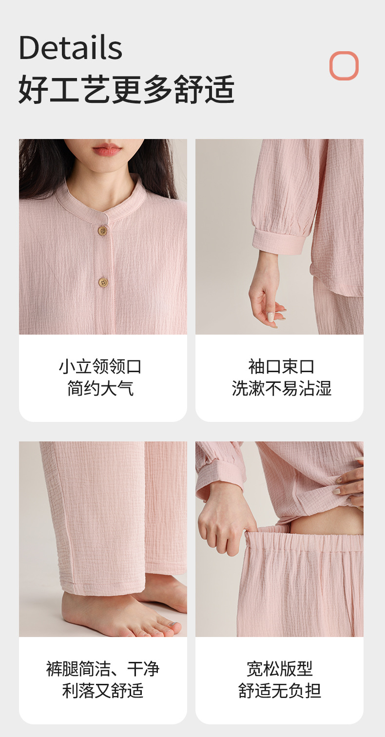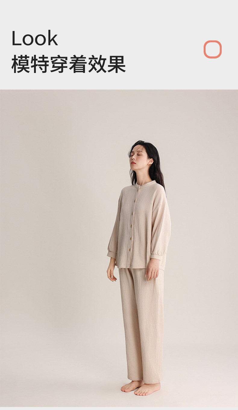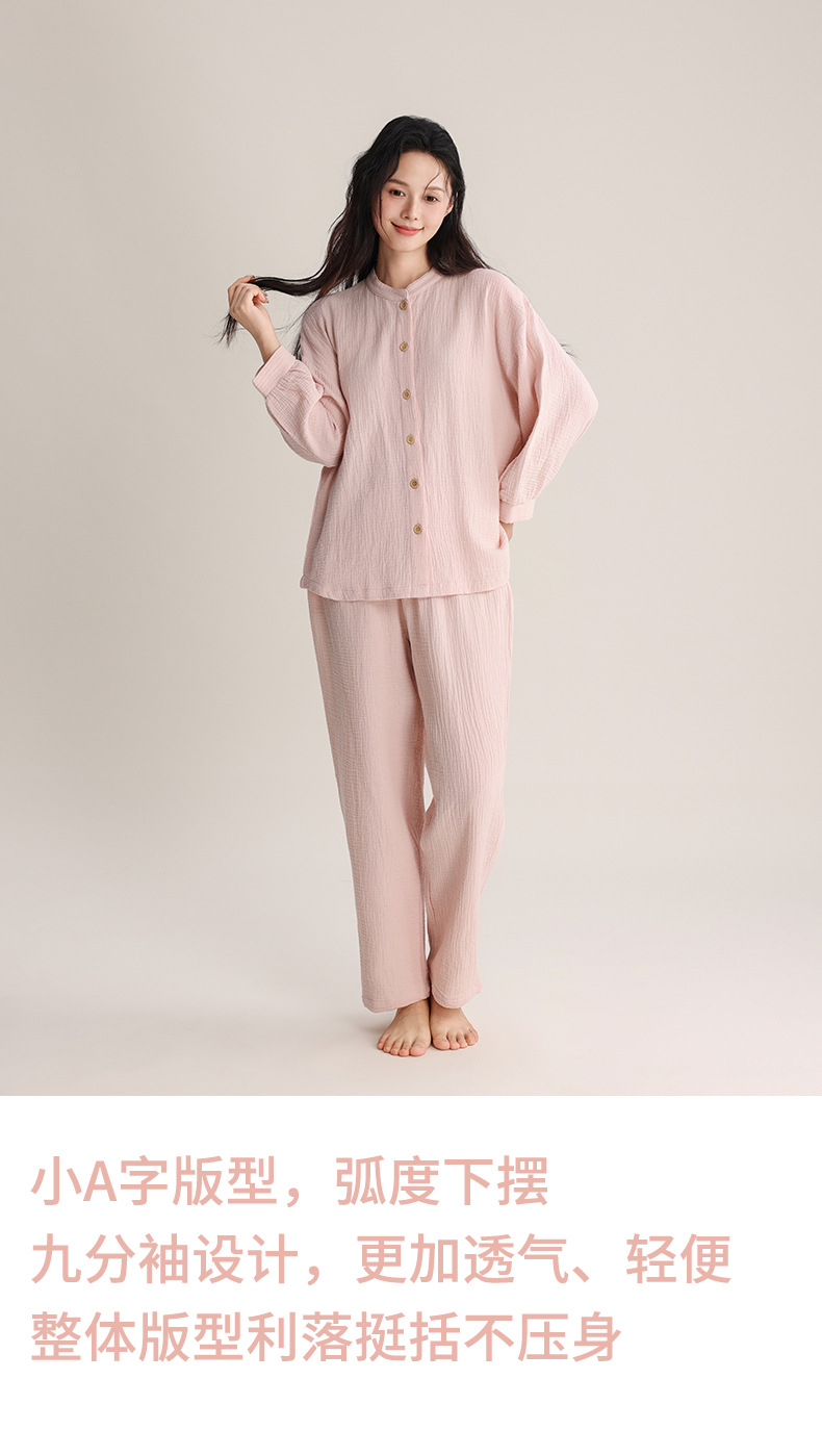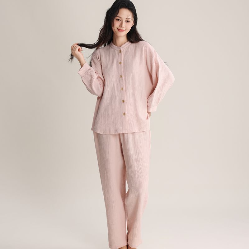 봄과 여름 잠옷 여성 더블 레이어 크레페 순수 코튼 비 인쇄 스타일 간단한 일본 스타일 작은 스탠드 칼라 겉옷 홈 의류 세트