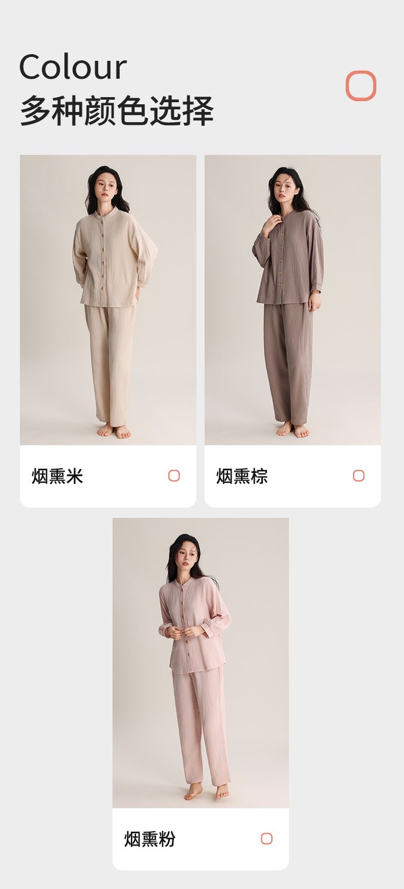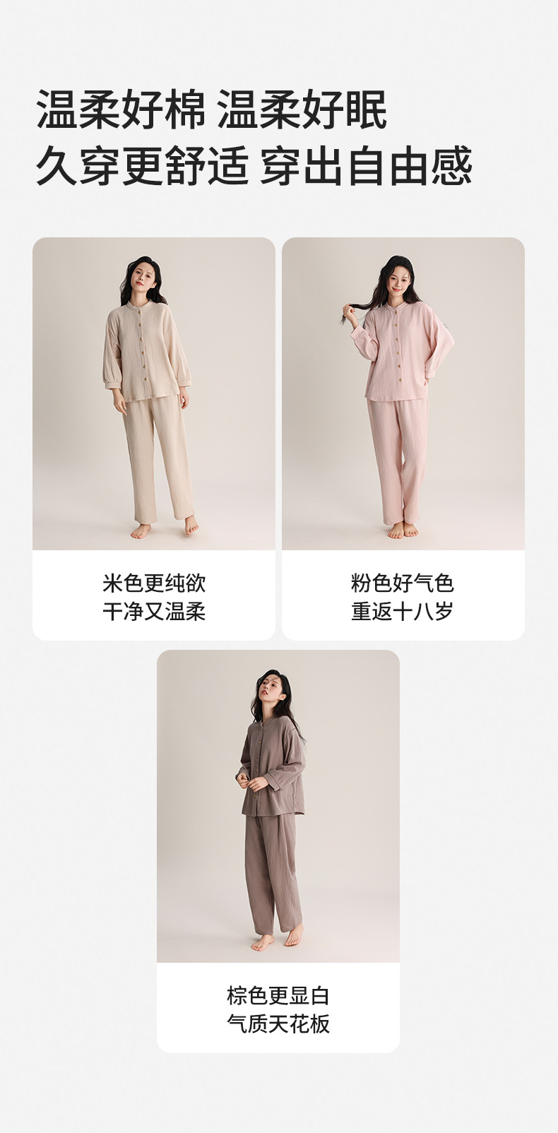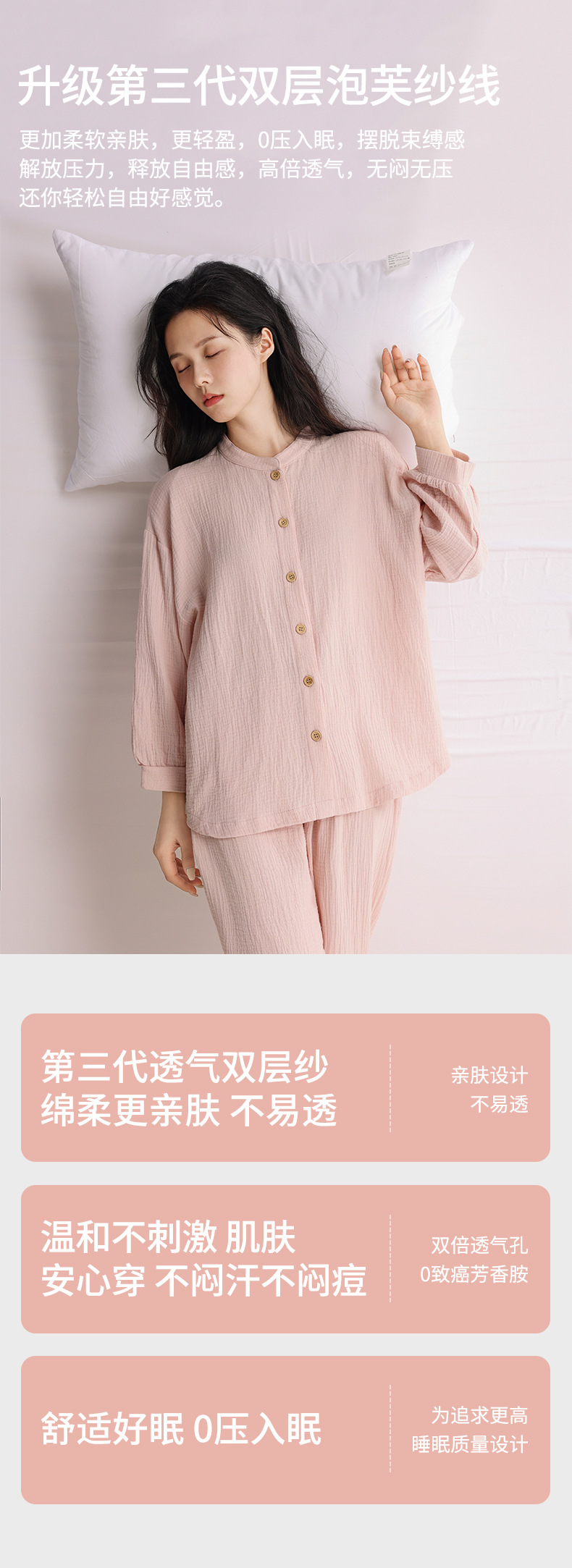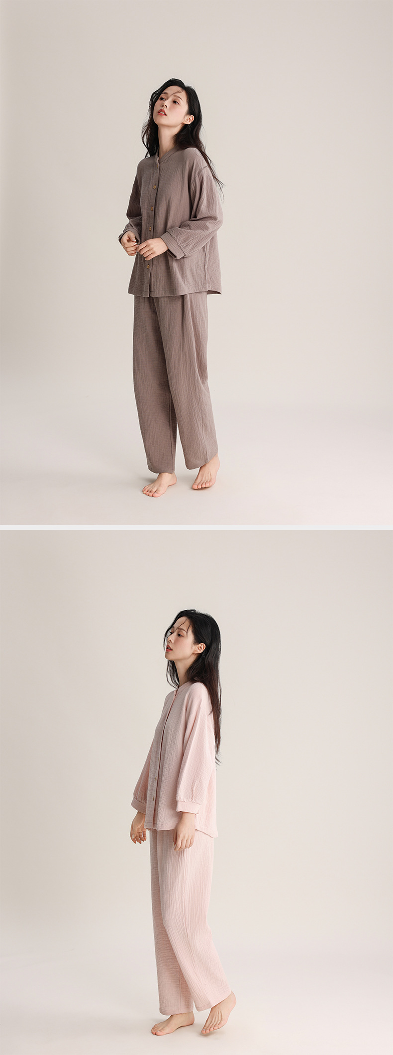 봄과 여름 잠옷 여성 더블 레이어 크레페 순수 코튼 비 인쇄 스타일 간단한 일본 스타일 작은 스탠드 칼라 겉옷 홈 의류 세트