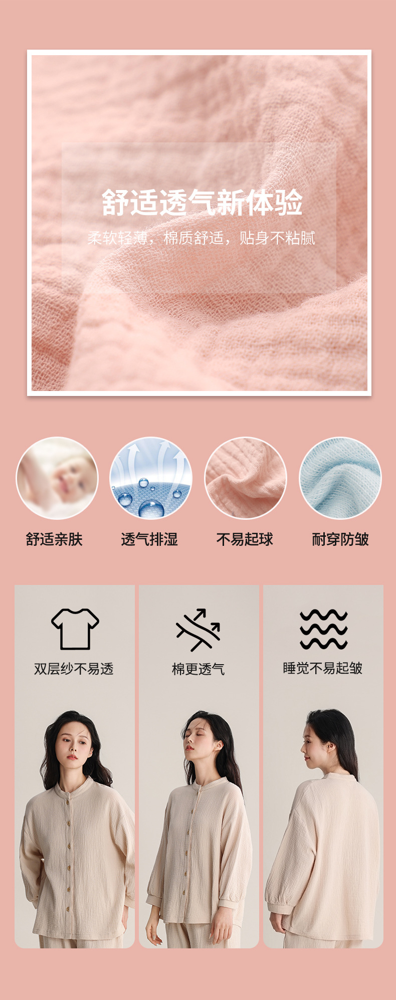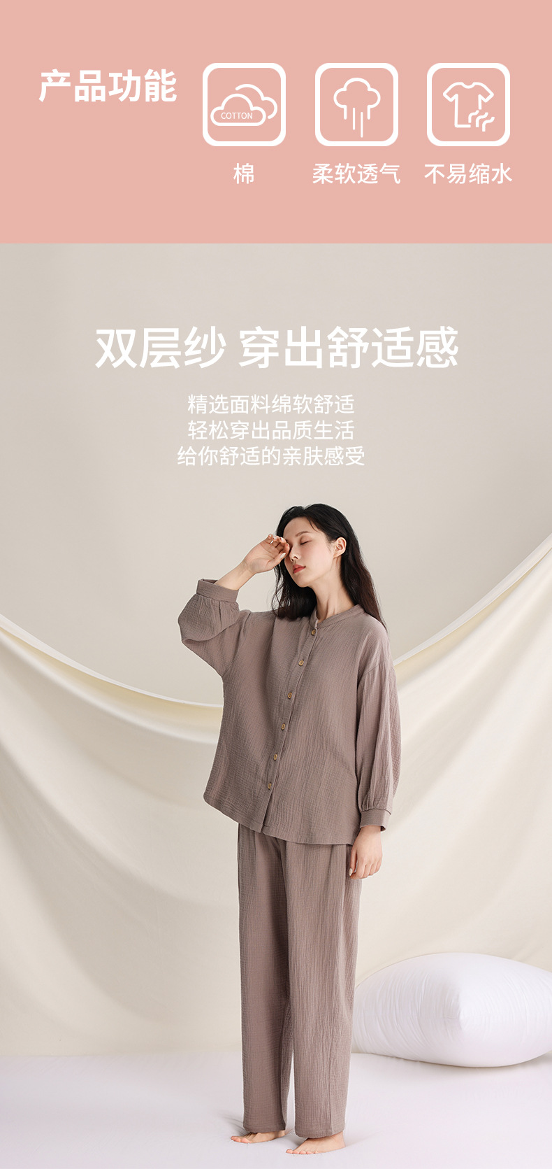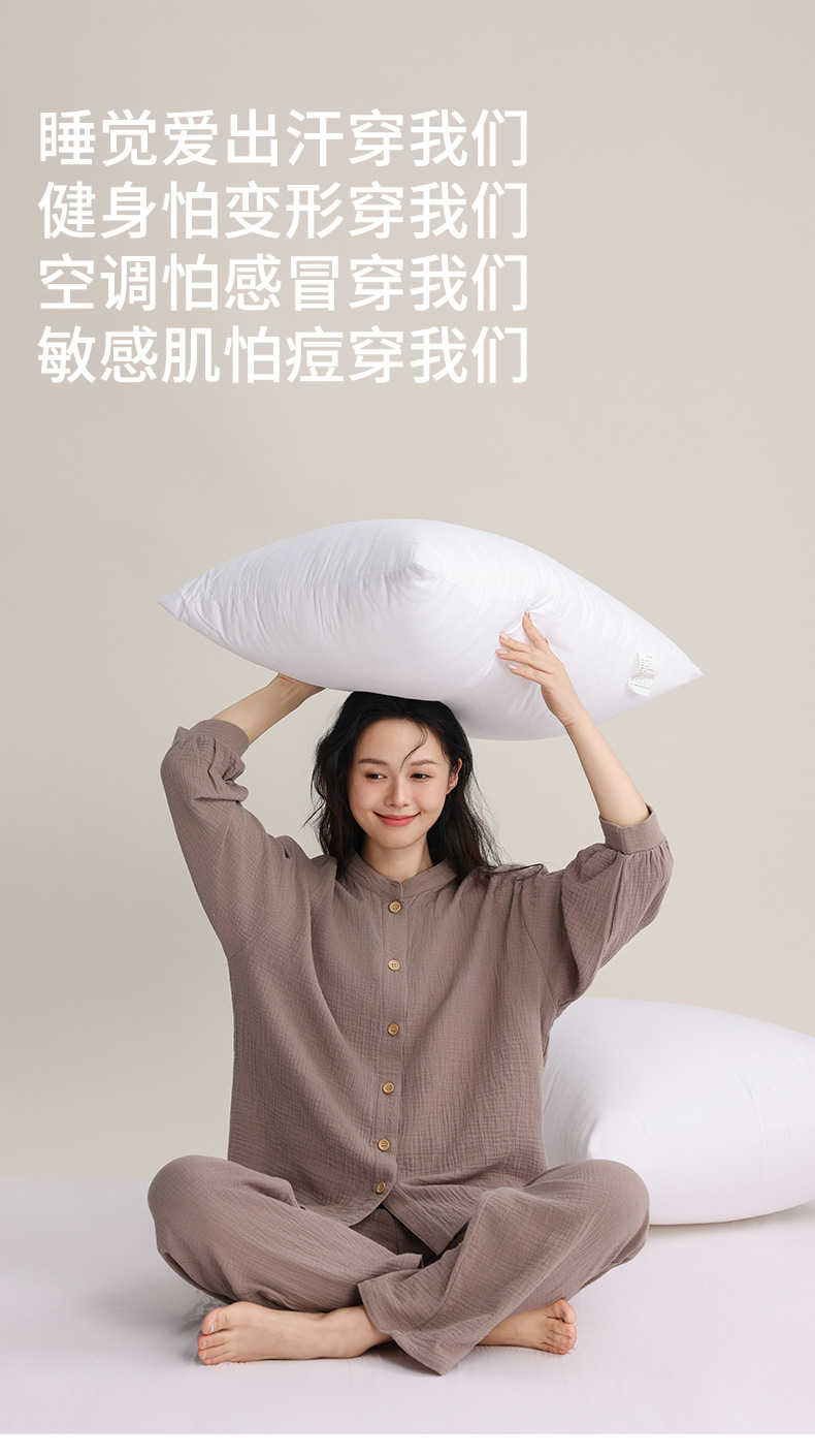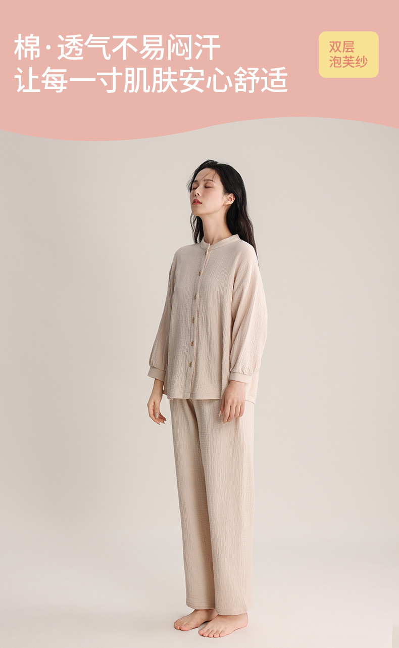 봄과 여름 잠옷 여성 더블 레이어 크레페 순수 코튼 비 인쇄 스타일 간단한 일본 스타일 작은 스탠드 칼라 겉옷 홈 의류 세트스토어 가기