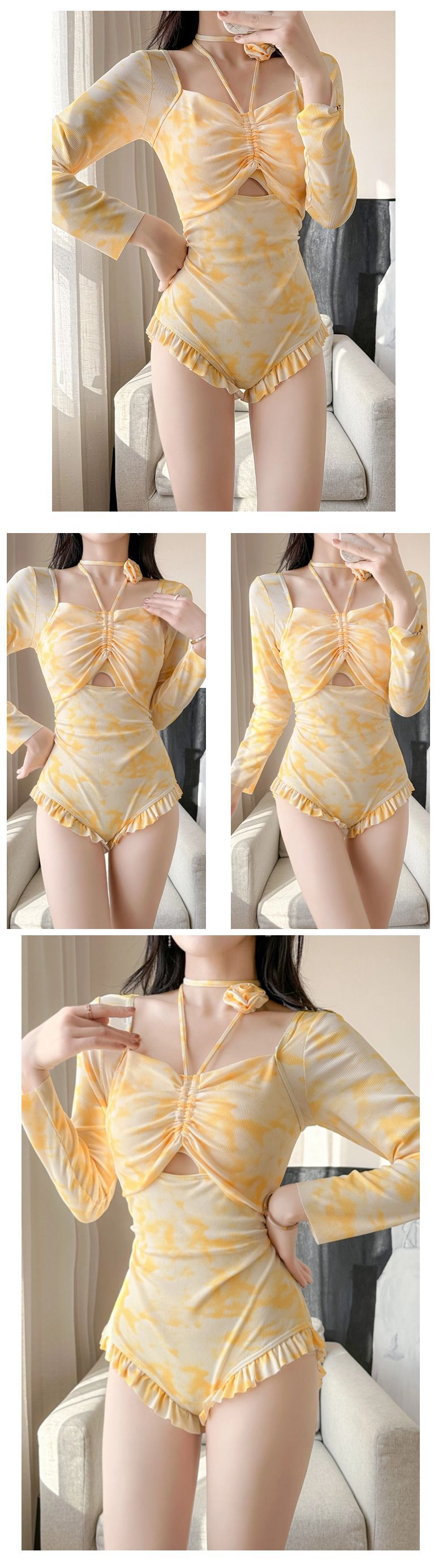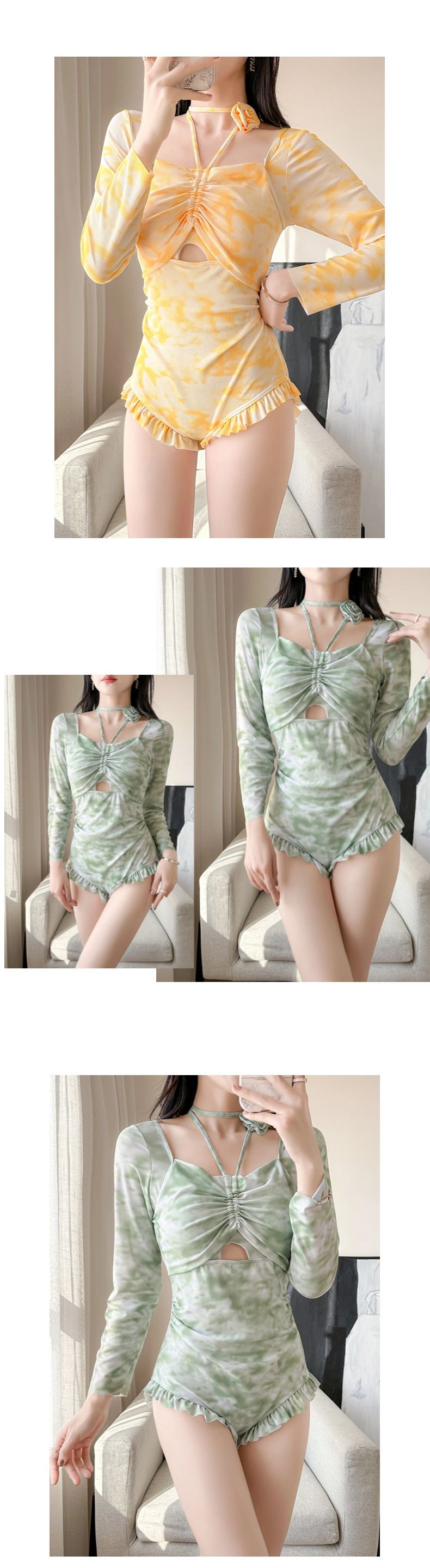2026년 신상 여성용 삼각형 원피스 수영복, 고급스러운 디자인, 긴팔, 청순하고 섹시한 스타일, 배를 가려주고 날씬해 보이는 온천용 원피스 수영복스토어 가기