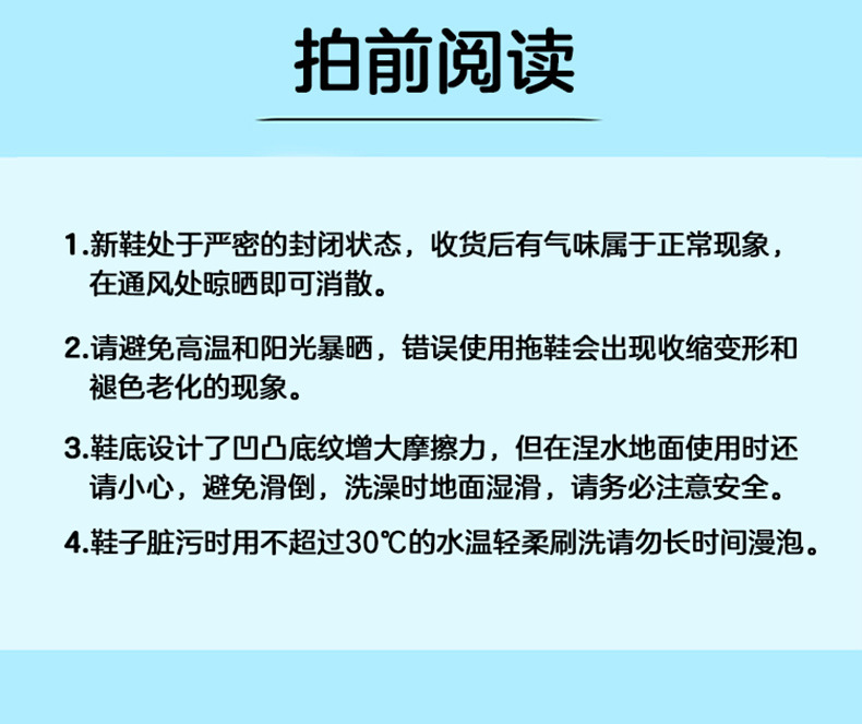 我们发货前都会检查仔细,万一有落网之鱼,请及时联系客服,把有问题的拖鞋拍照留底提交给我们,我们会妥善处理,由于生产过程中鞋处于密封包装,少许新鞋气味,放置通风出些许时间即可散发,产品生产均处于严格管控中,无毒无害放心使用!希望我们的全心全意跟努力能换回你们的5星好评!