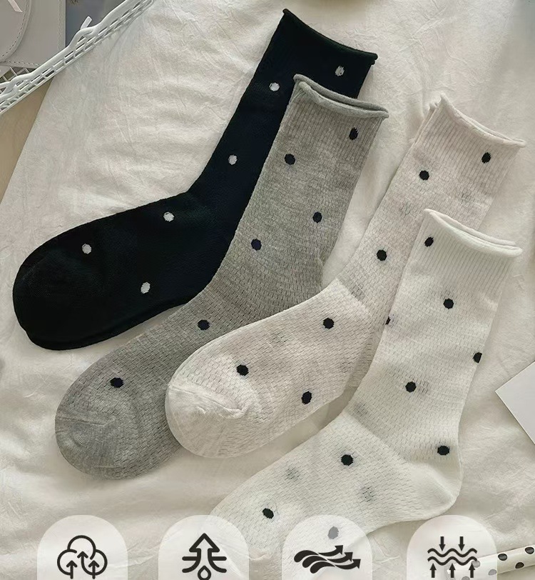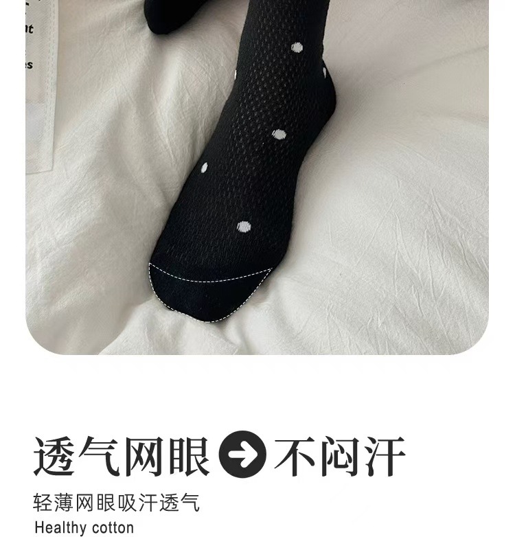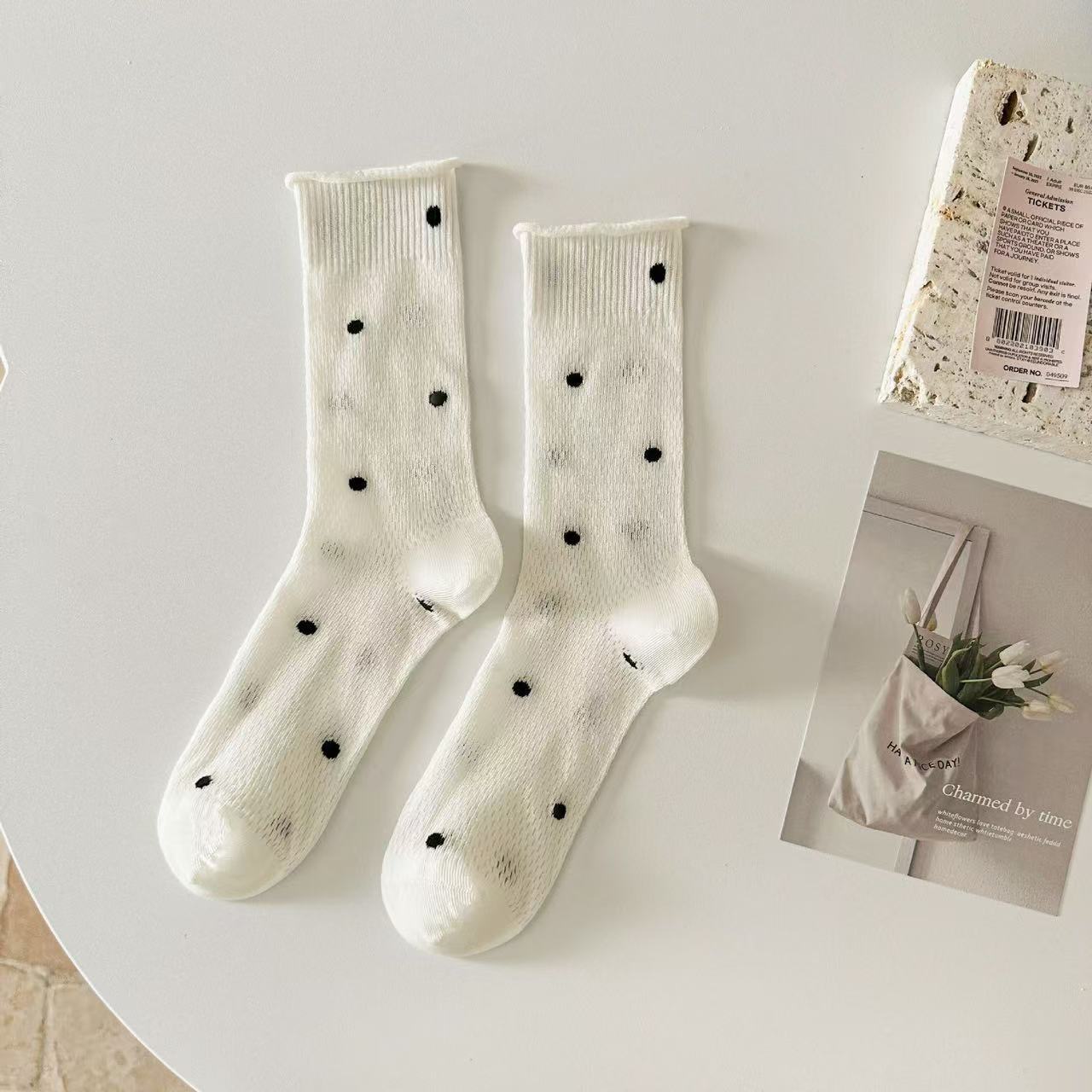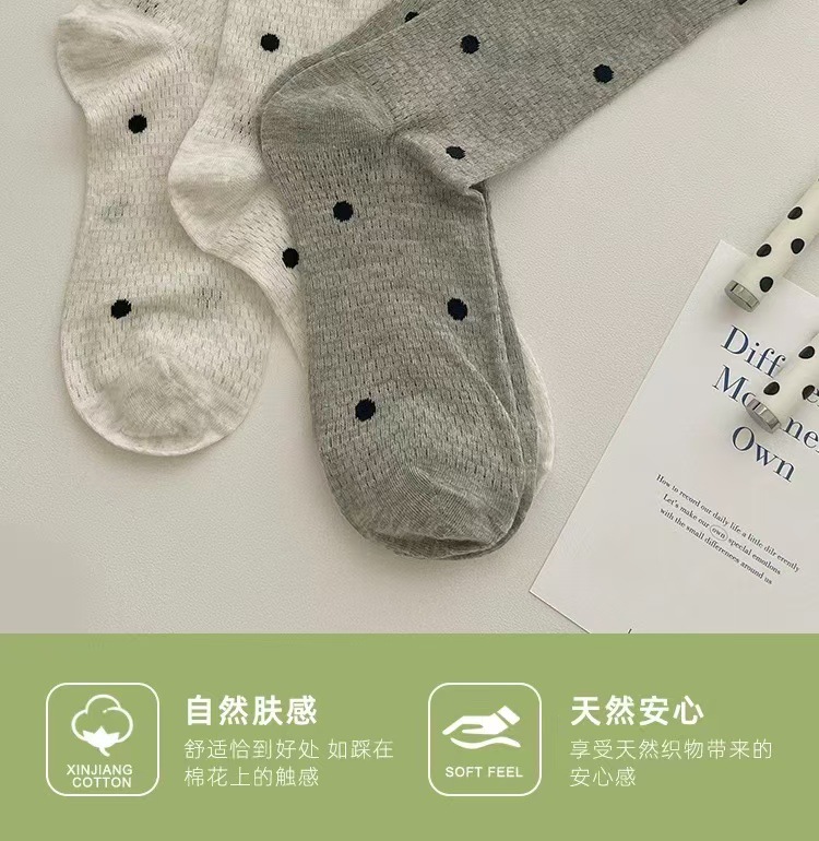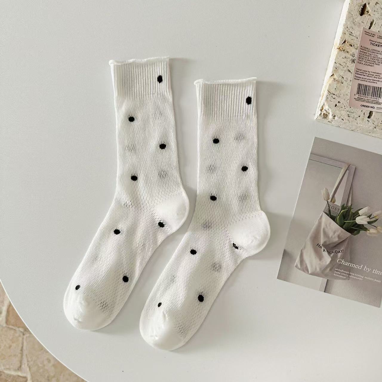 봄과 여름 Ins 스타일 달콤한 미드 튜브 여성용 양말 얇은 할로우 통기성 빗 코튼 커드 웨이브 도트 미드 튜브 스택 양말