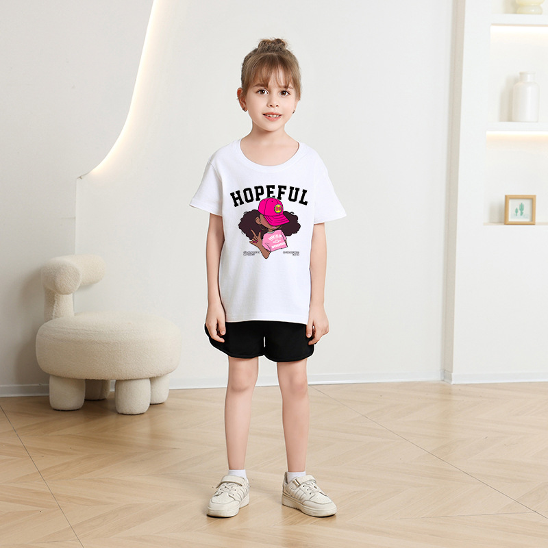 • 핑크 블랙 레터 핑크 모자 소녀 반팔