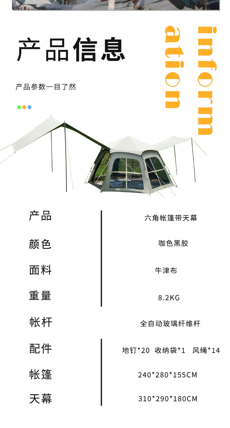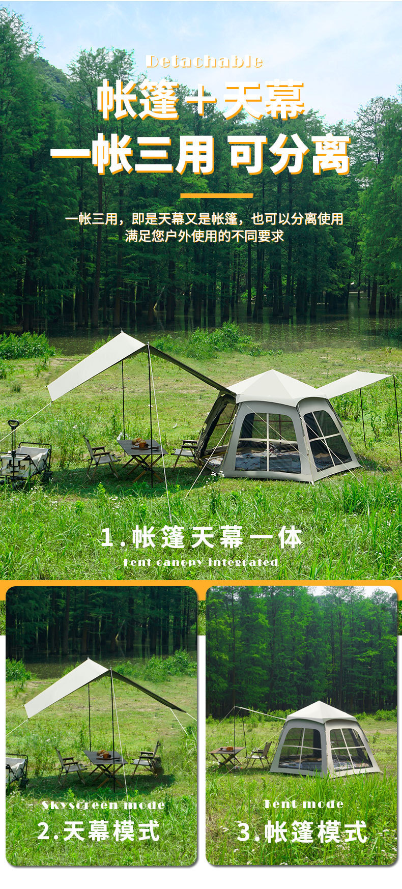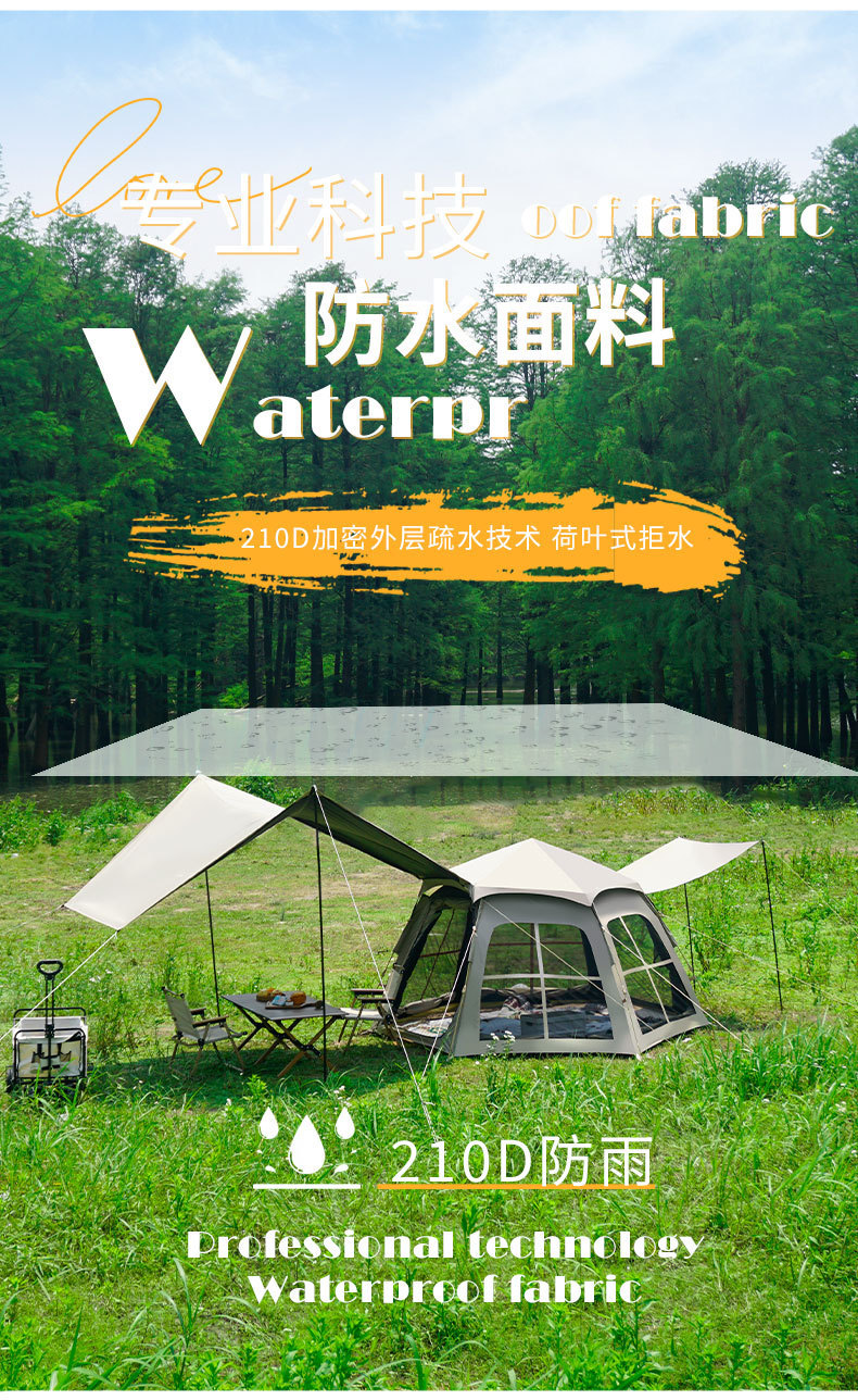 캐노피 캠핑 피크닉 블랙 고무 자외선 차단제 방수 바닥부터 천장까지 창문 텐트가있는 2 대 1 야외 완전 자동 육각형 텐트스토어 가기