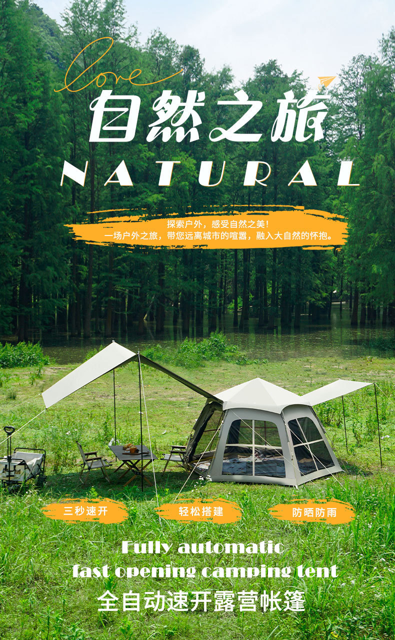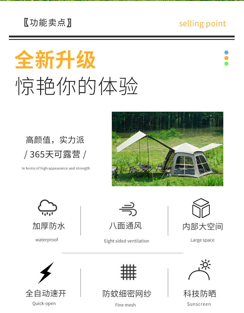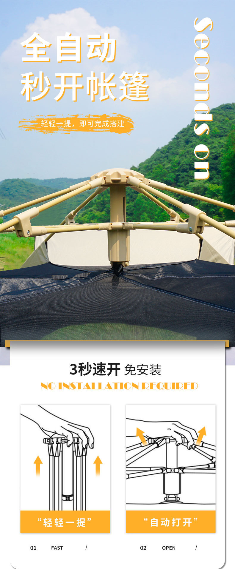 캐노피 캠핑 피크닉 블랙 고무 자외선 차단제 방수 바닥부터 천장까지 창문 텐트가있는 2 대 1 야외 완전 자동 육각형 텐트스토어 가기