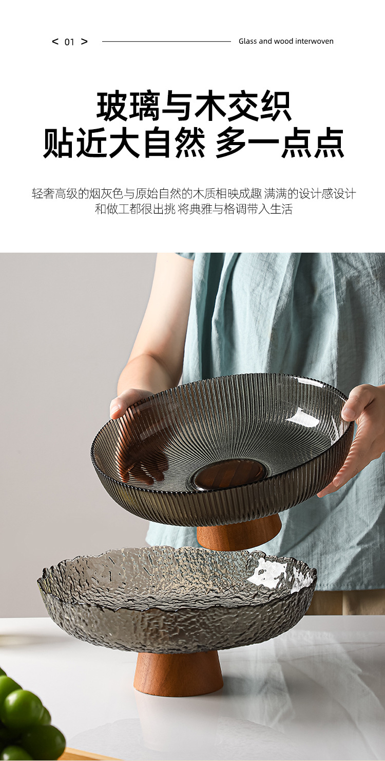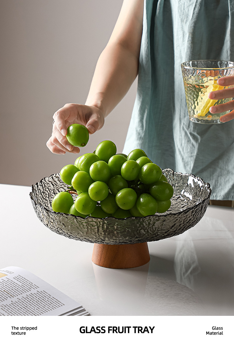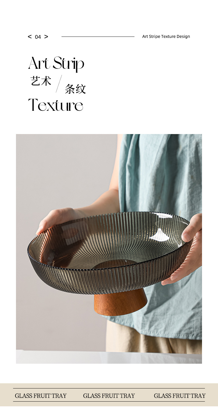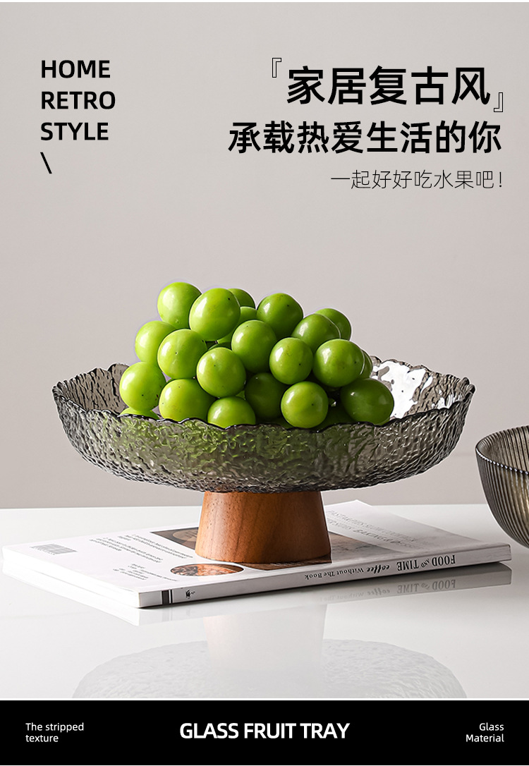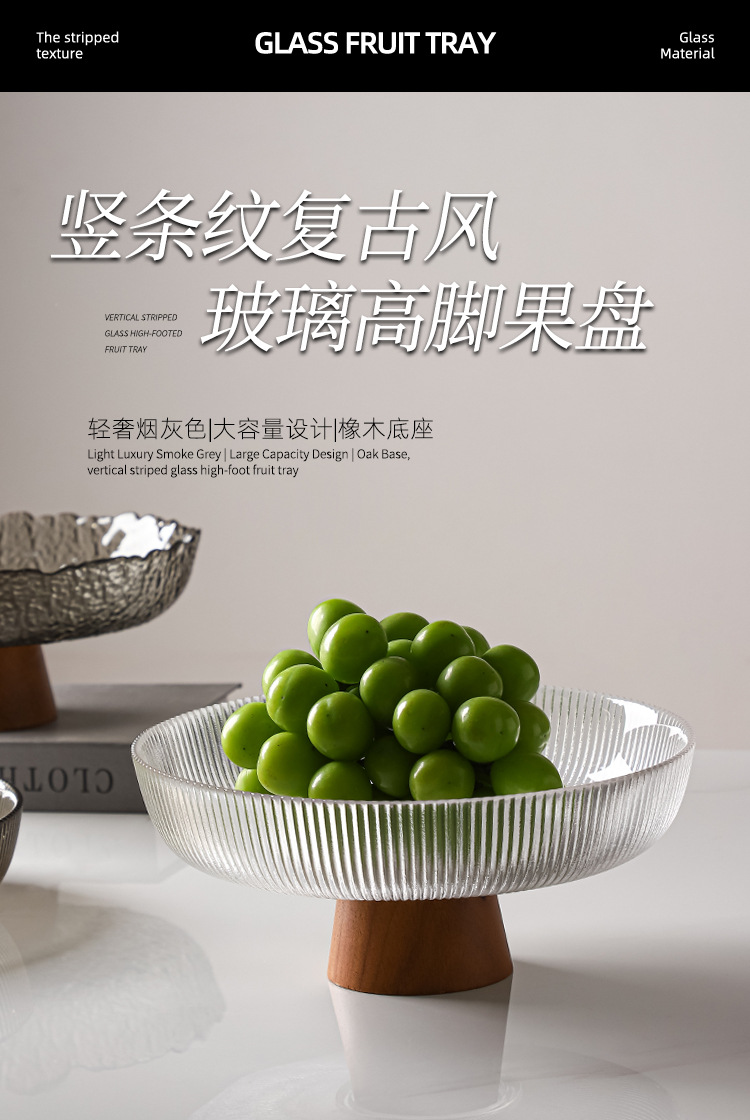 레트로 스타일 오크 베이스 스트라이프 유리 높은 발 과일 플레이트 거실 높은 색상 가치 예술적 스낵 말린 과일 플레이트 도매스토어 가기
