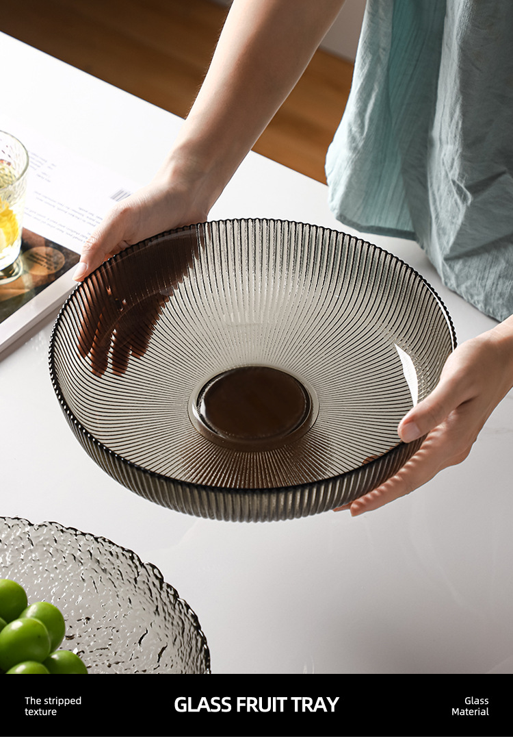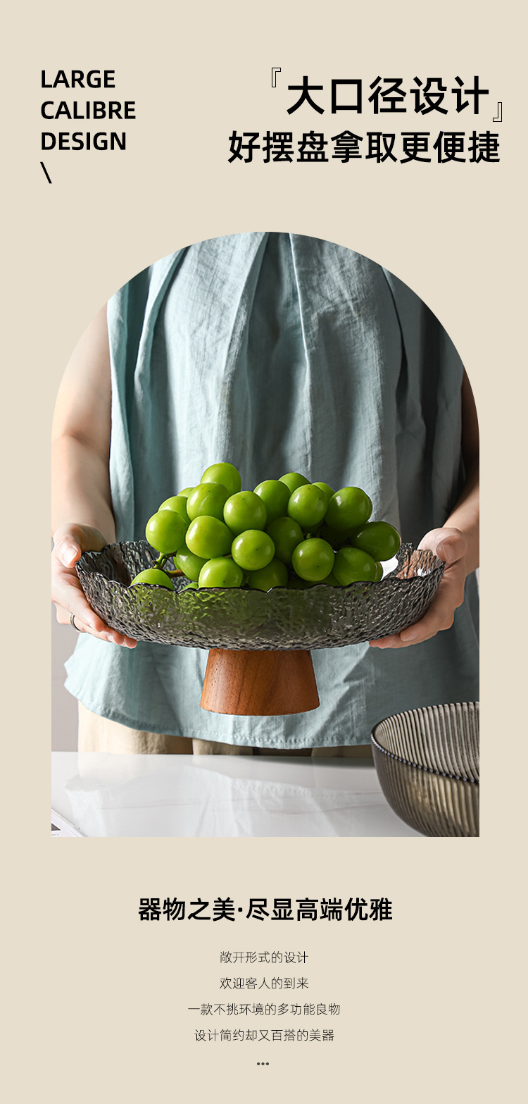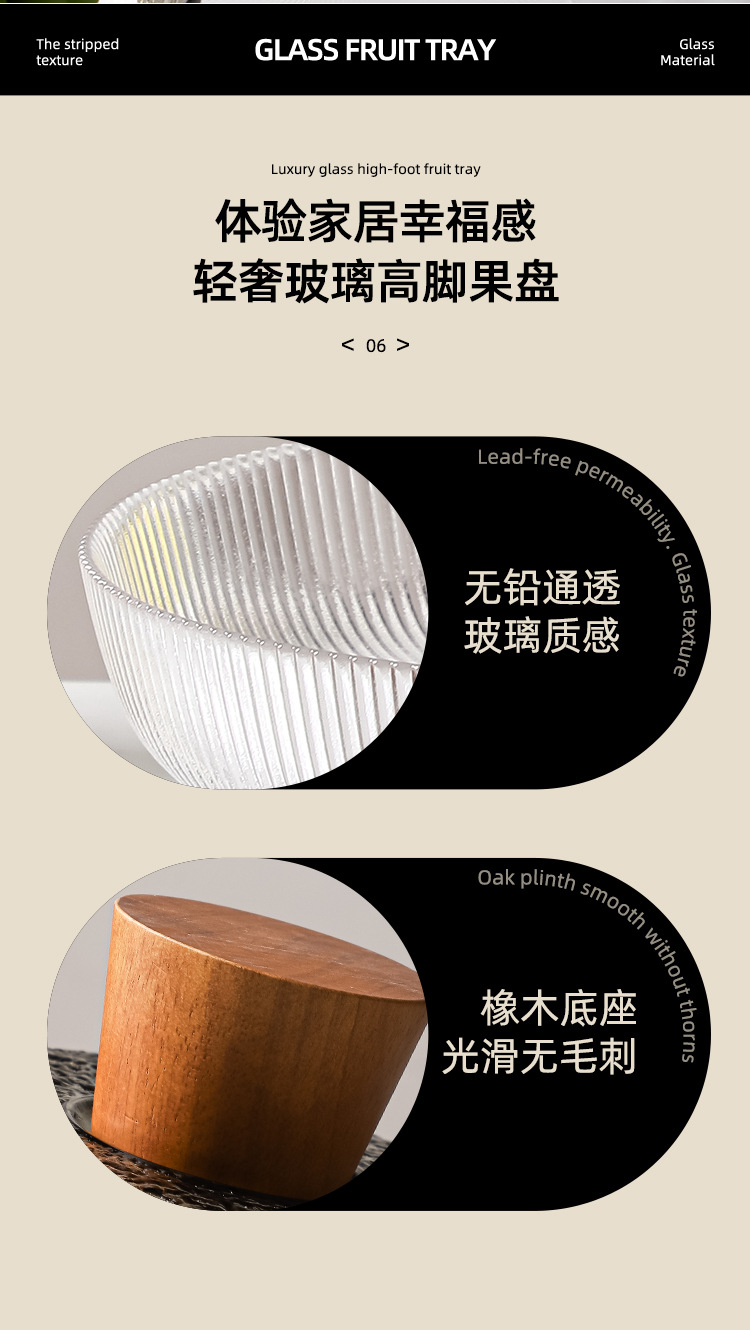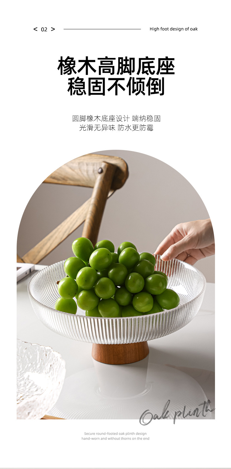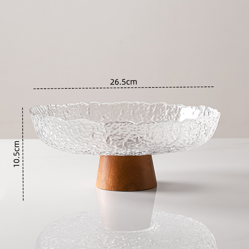 레트로 스타일 오크 베이스 스트라이프 유리 높은 발 과일 플레이트 거실 높은 색상 가치 예술적 스낵 말린 과일 플레이트 도매스토어 가기