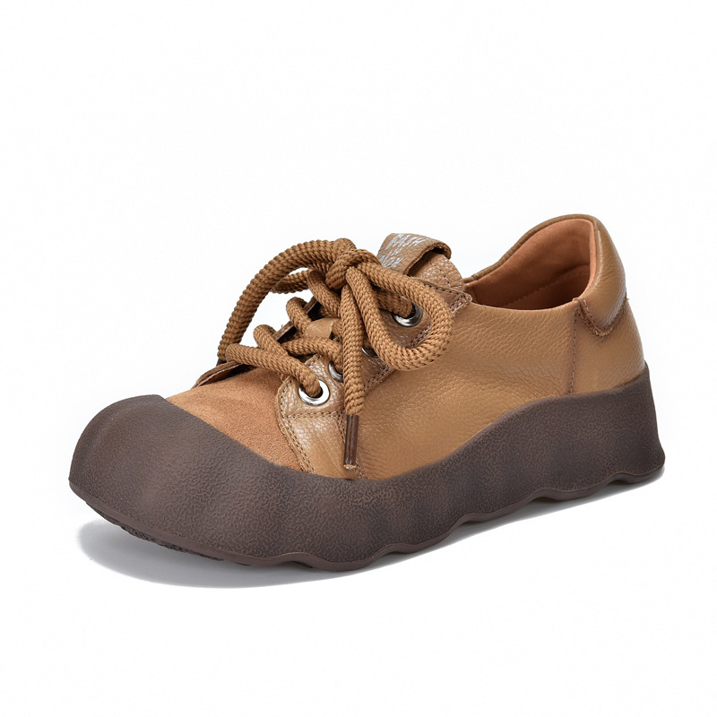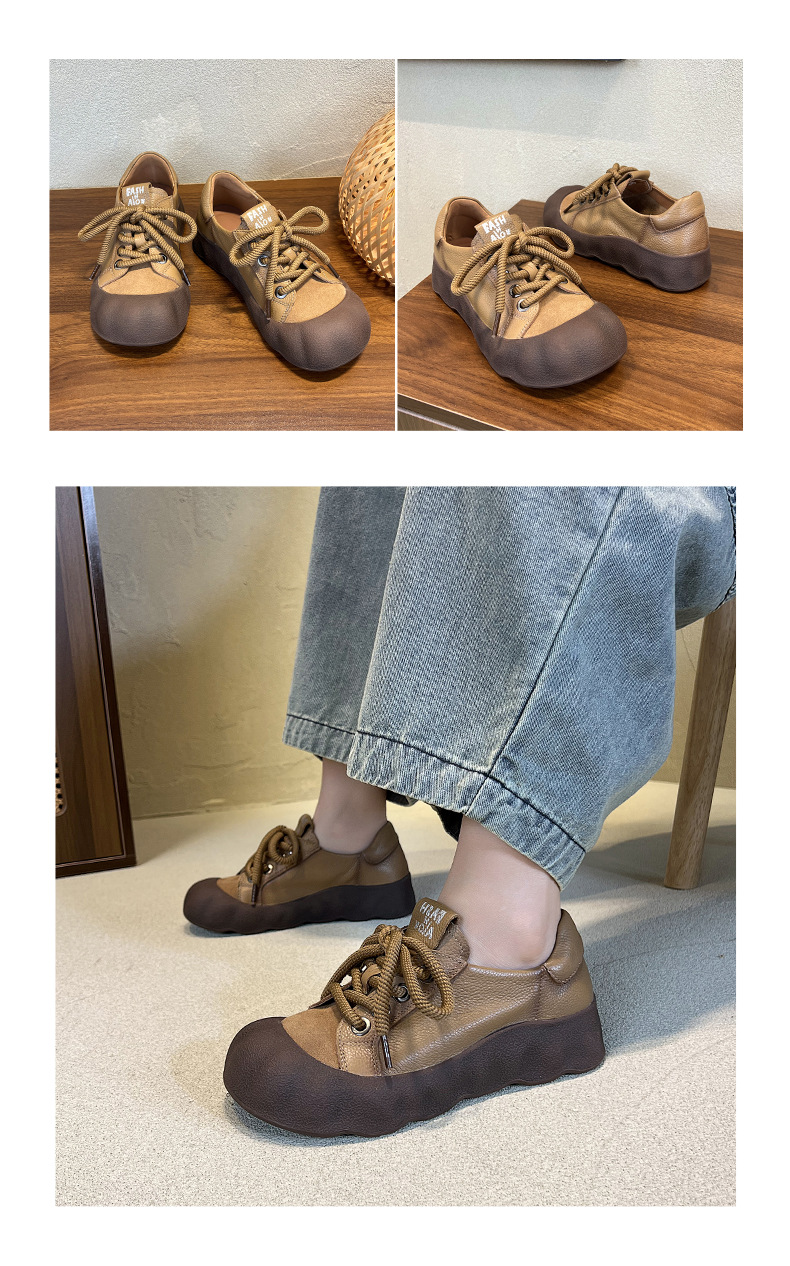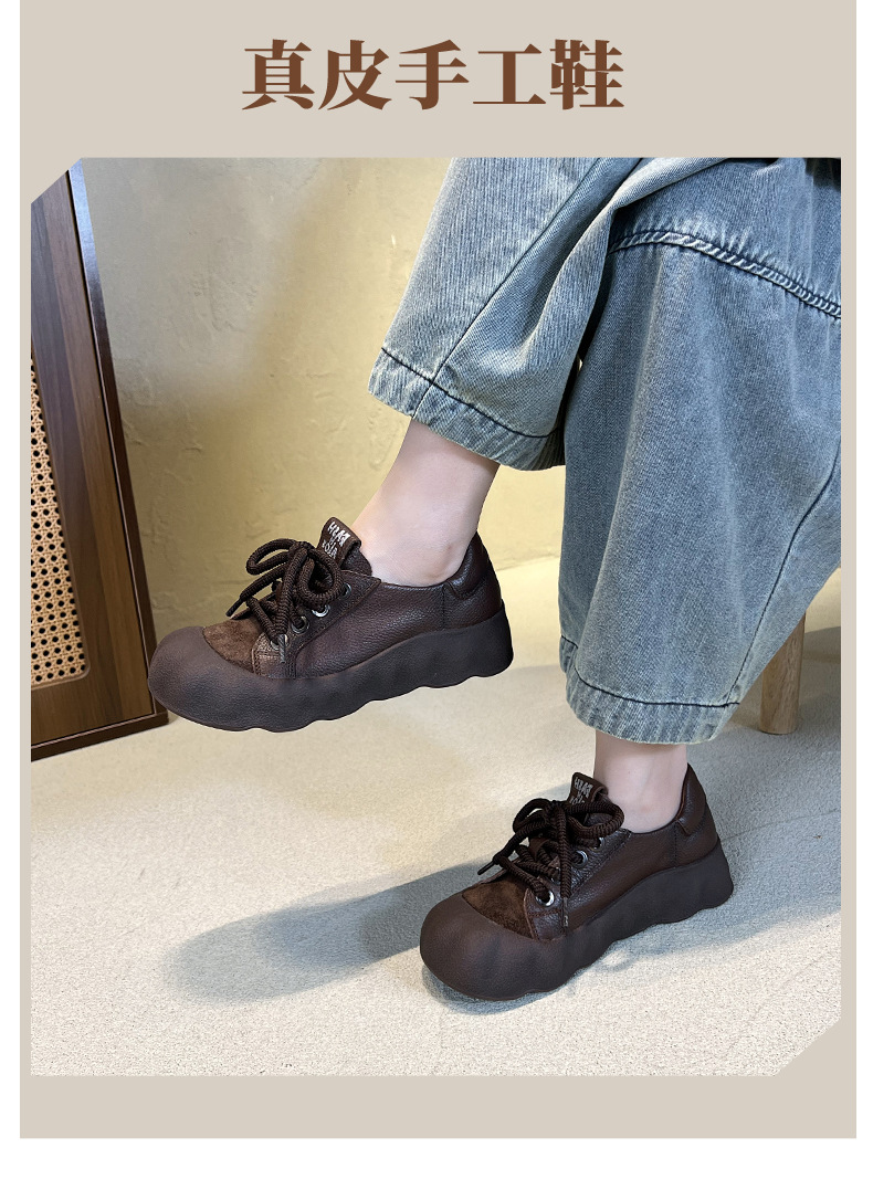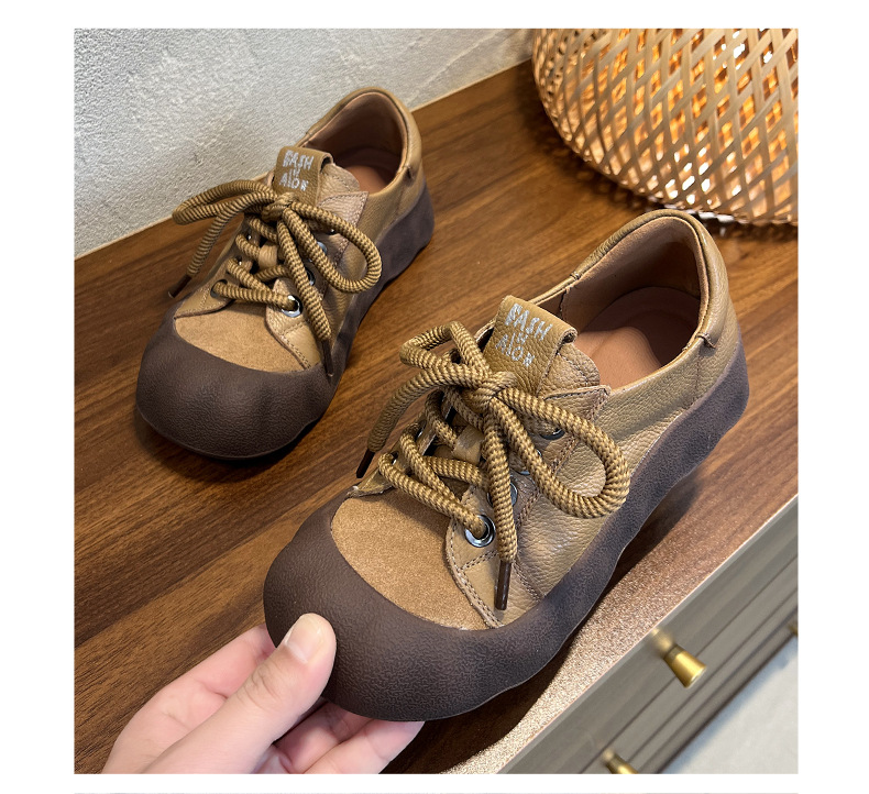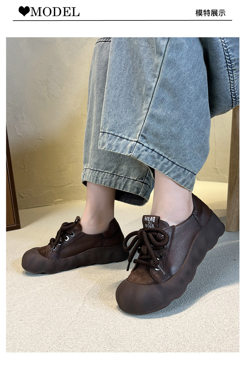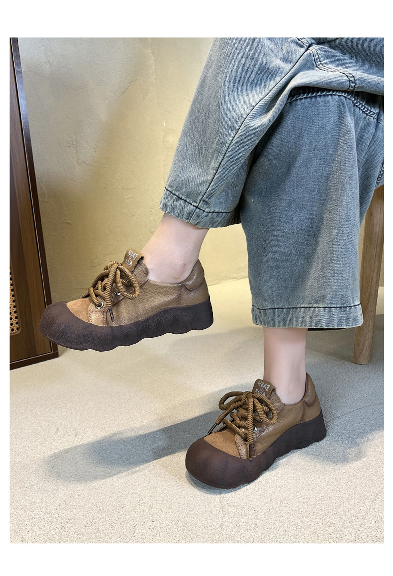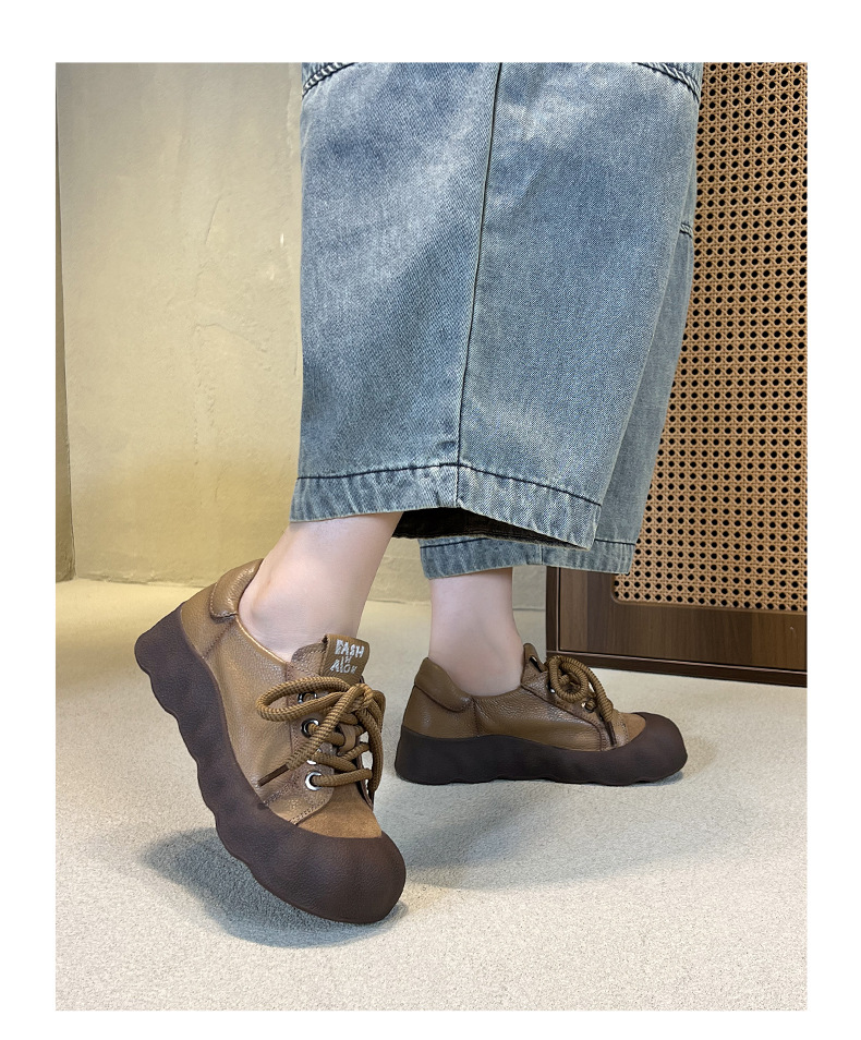 빈티지 캐주얼 가죽 여성 신발 미드 힐 레이스 업 발가락 캐주얼 스니커즈 2025 봄 탑 레이어 Cowhide 딥 입 싱글 레이어 신발스토어 가기