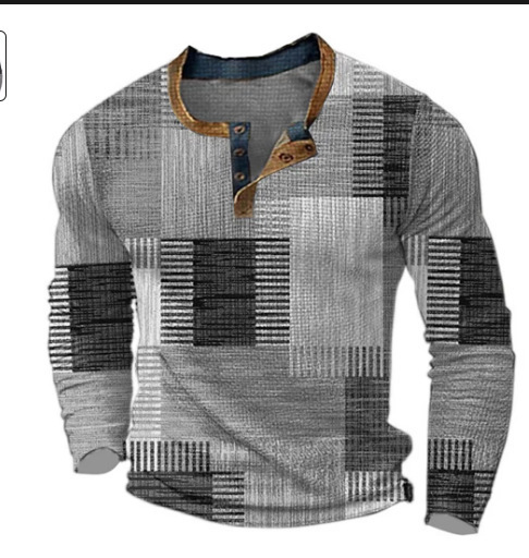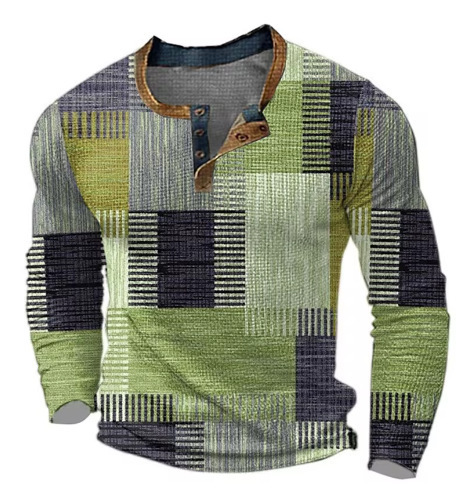 2025 유럽과 미국의 대외 무역 남자의 새로운 긴 소매 티셔츠 3D 인쇄 모자이크 컬러 캐주얼 패션 오픈 플래켓 3 버튼 티셔츠