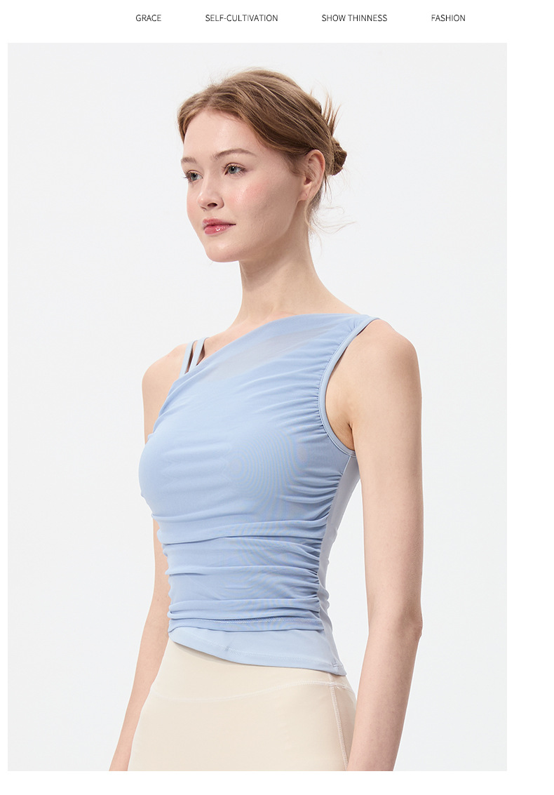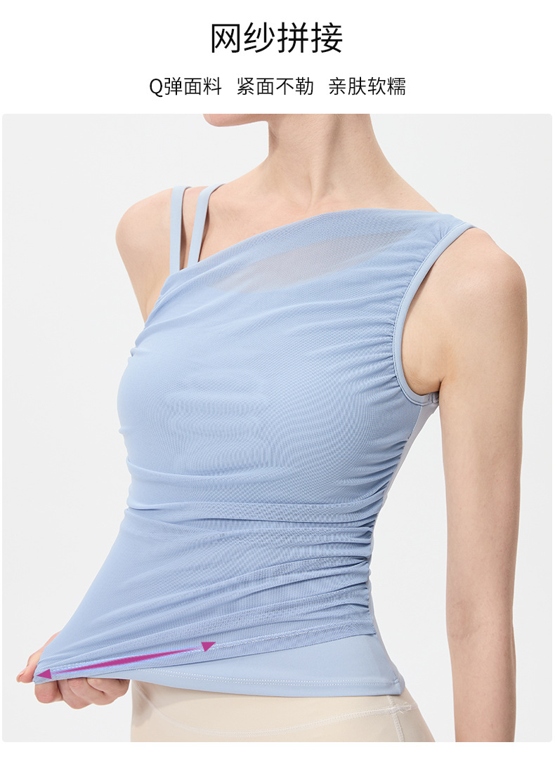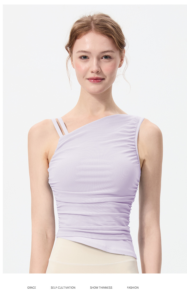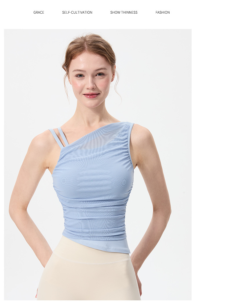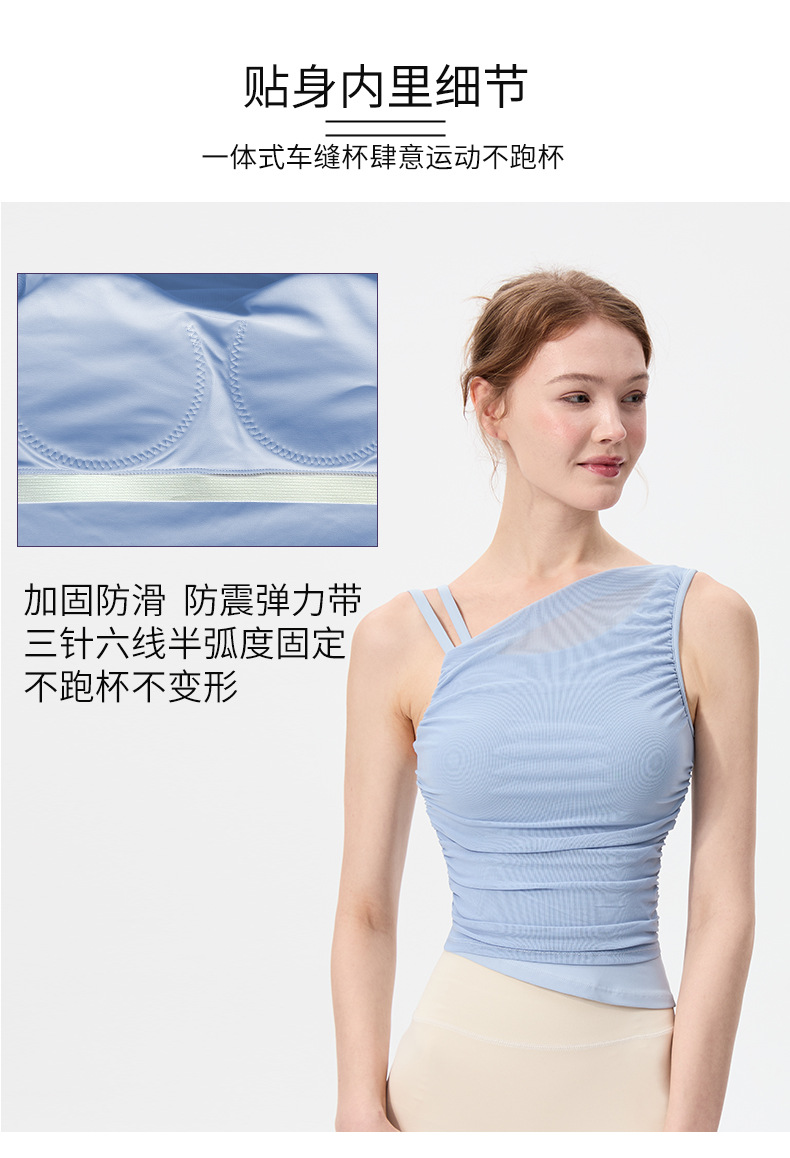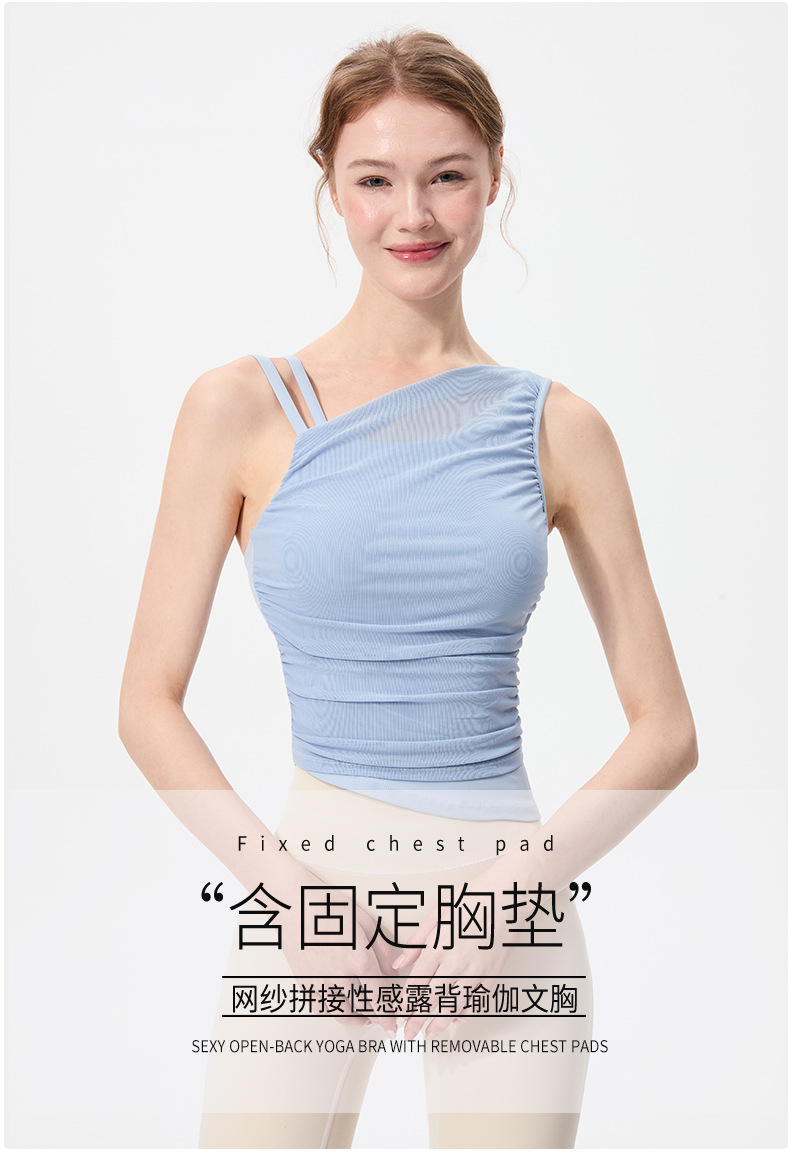 2025 새로운 불규칙한 고정 컵 경사 어깨 조끼 높은 감각 메쉬 스티칭 스포츠 최고 충격 방지 요가 옷