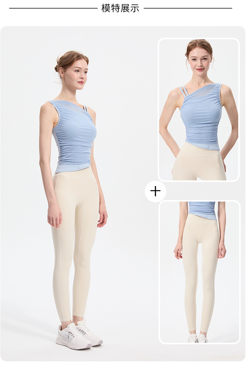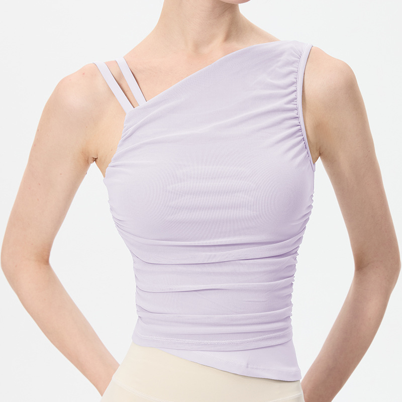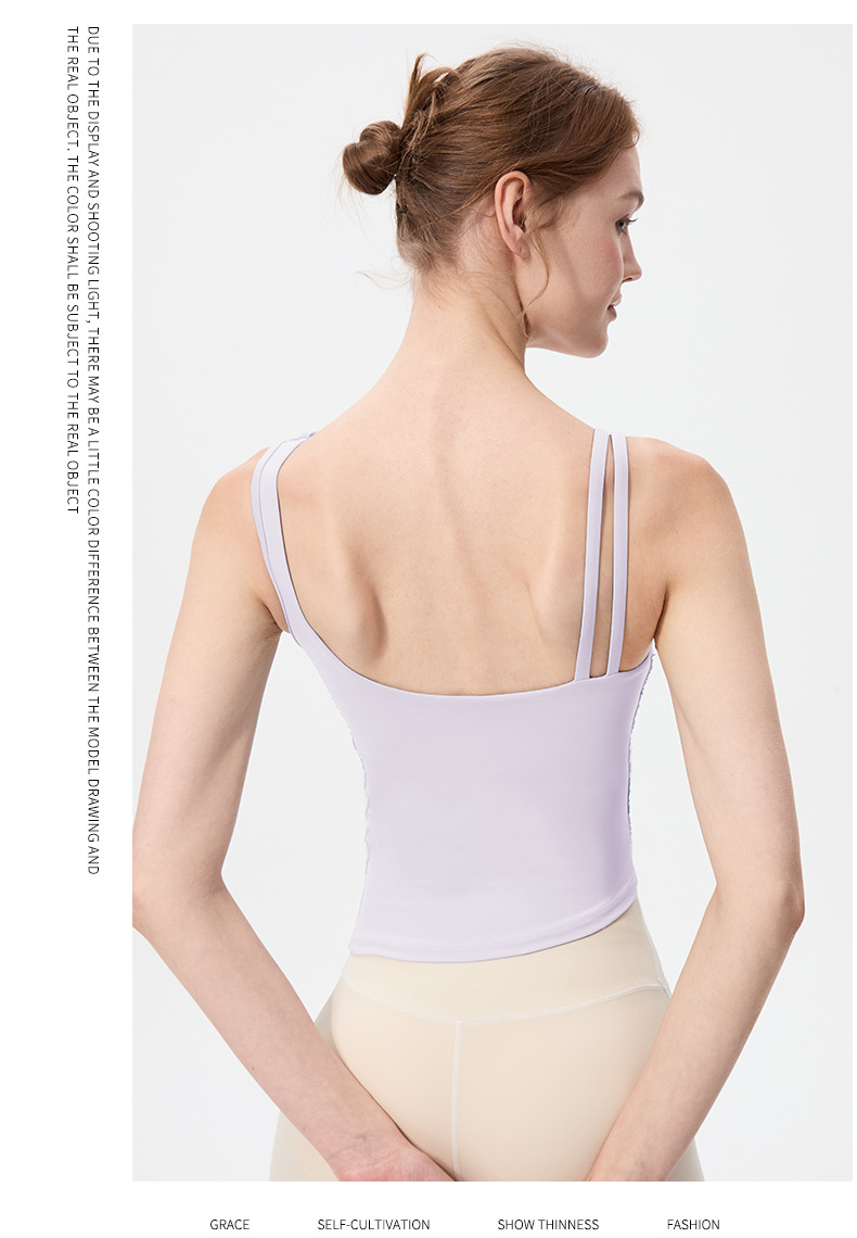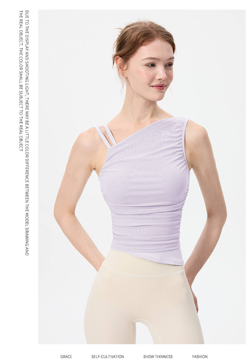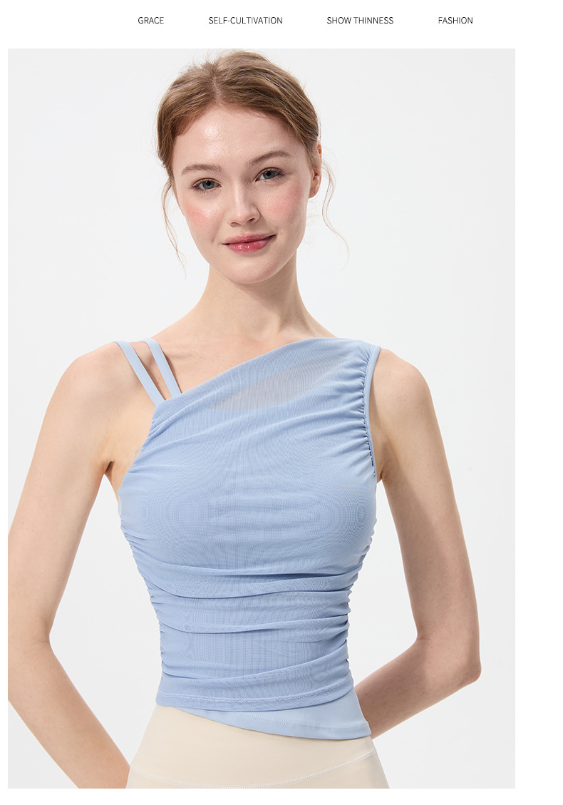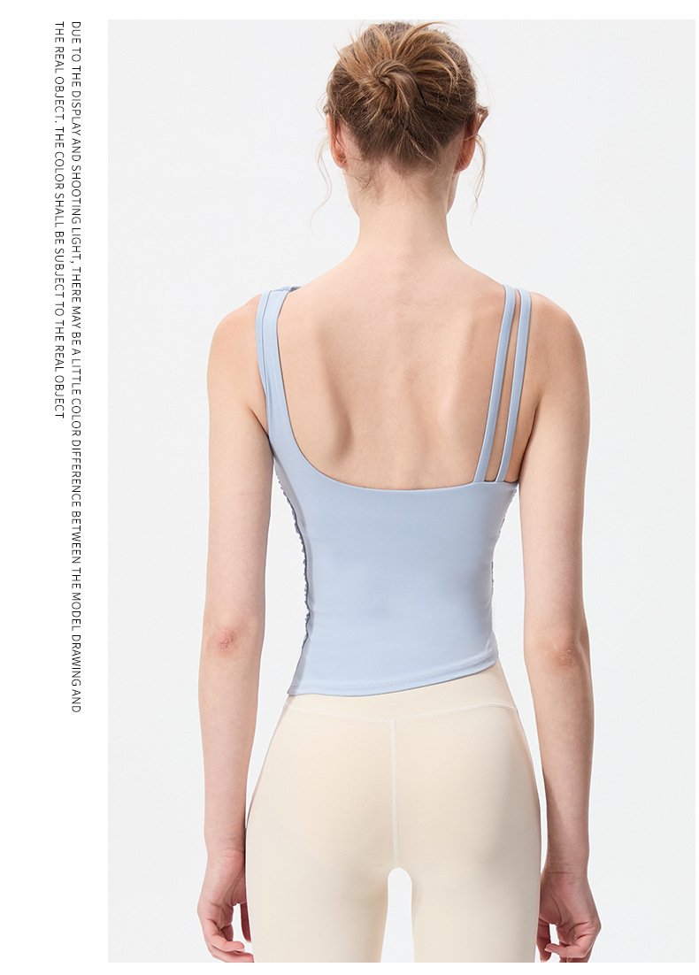 2025 새로운 불규칙한 고정 컵 경사 어깨 조끼 높은 감각 메쉬 스티칭 스포츠 최고 충격 방지 요가 옷