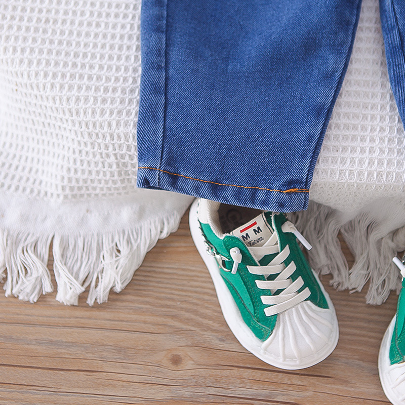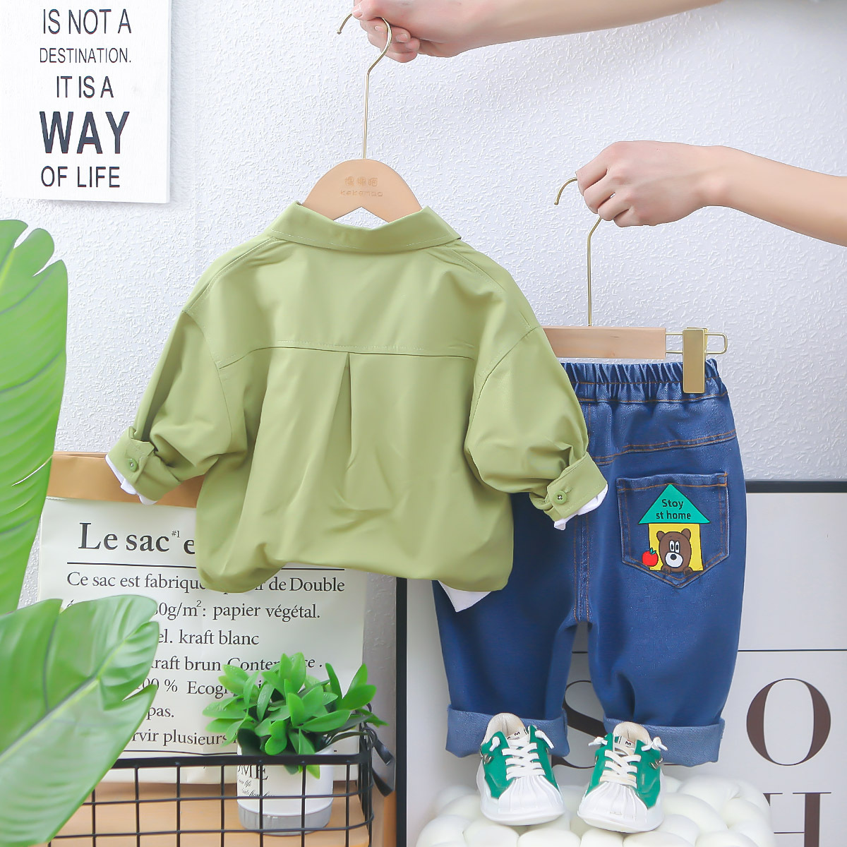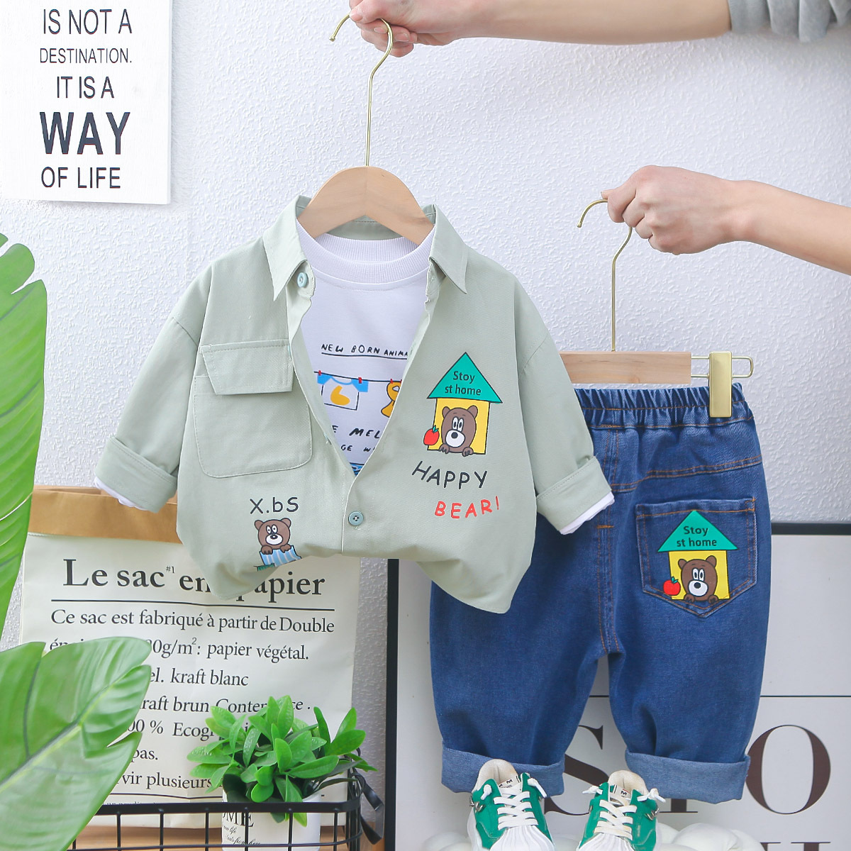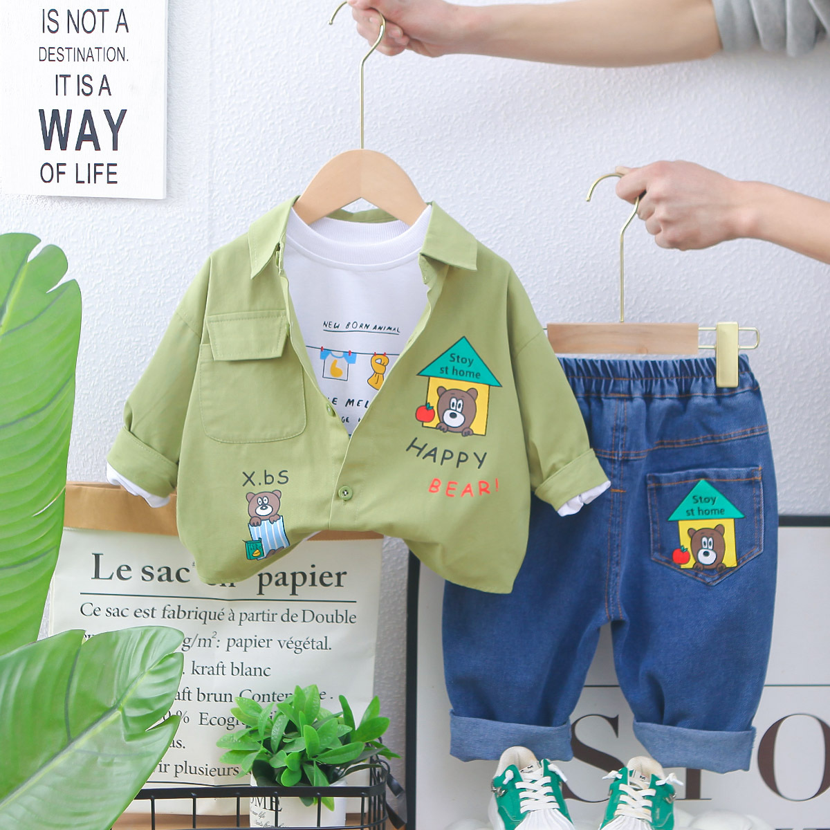 남자들의 봄 패션 셔츠 세트 2025 봄과 가을 새 소년 아기 한국식 셔츠 코트 3 피스 세트 트렌디스토어 가기