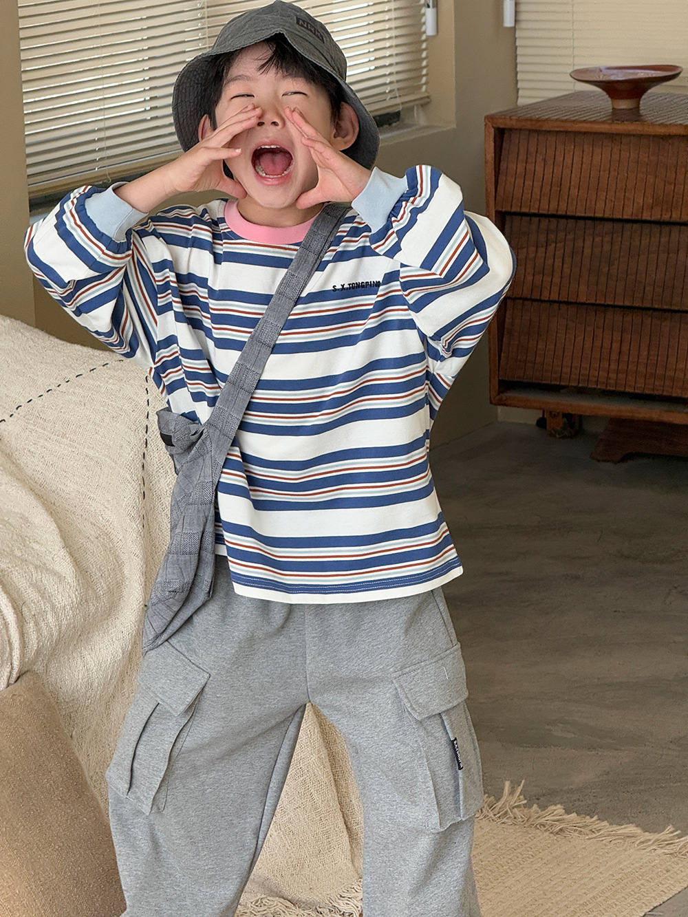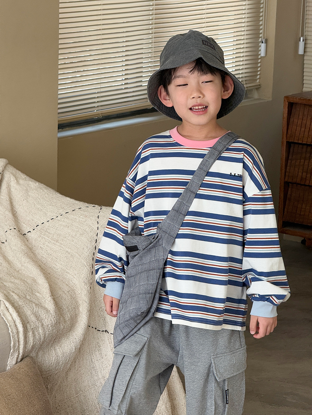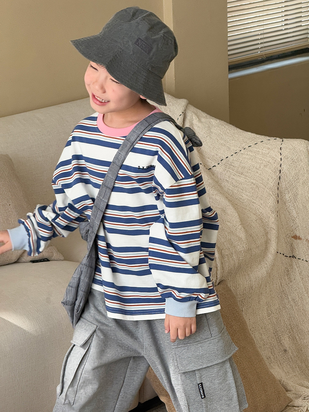 남자들의 긴 소매 티셔츠 봄 2024 새로운 아동복 어린이 여성 아기 줄무늬 느슨한 탑 외부 착용베이스 셔츠 T