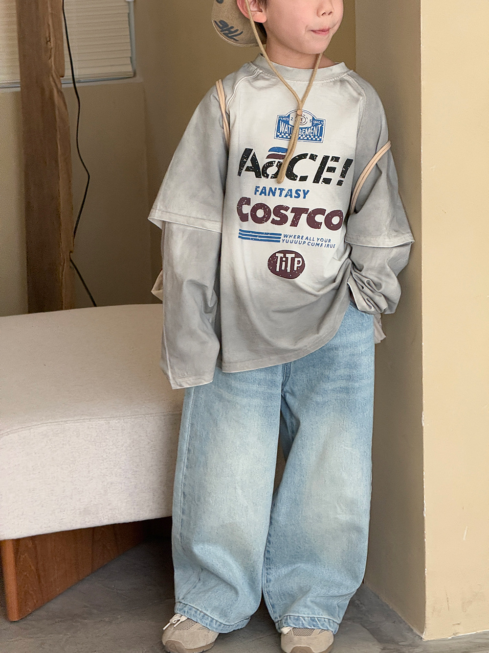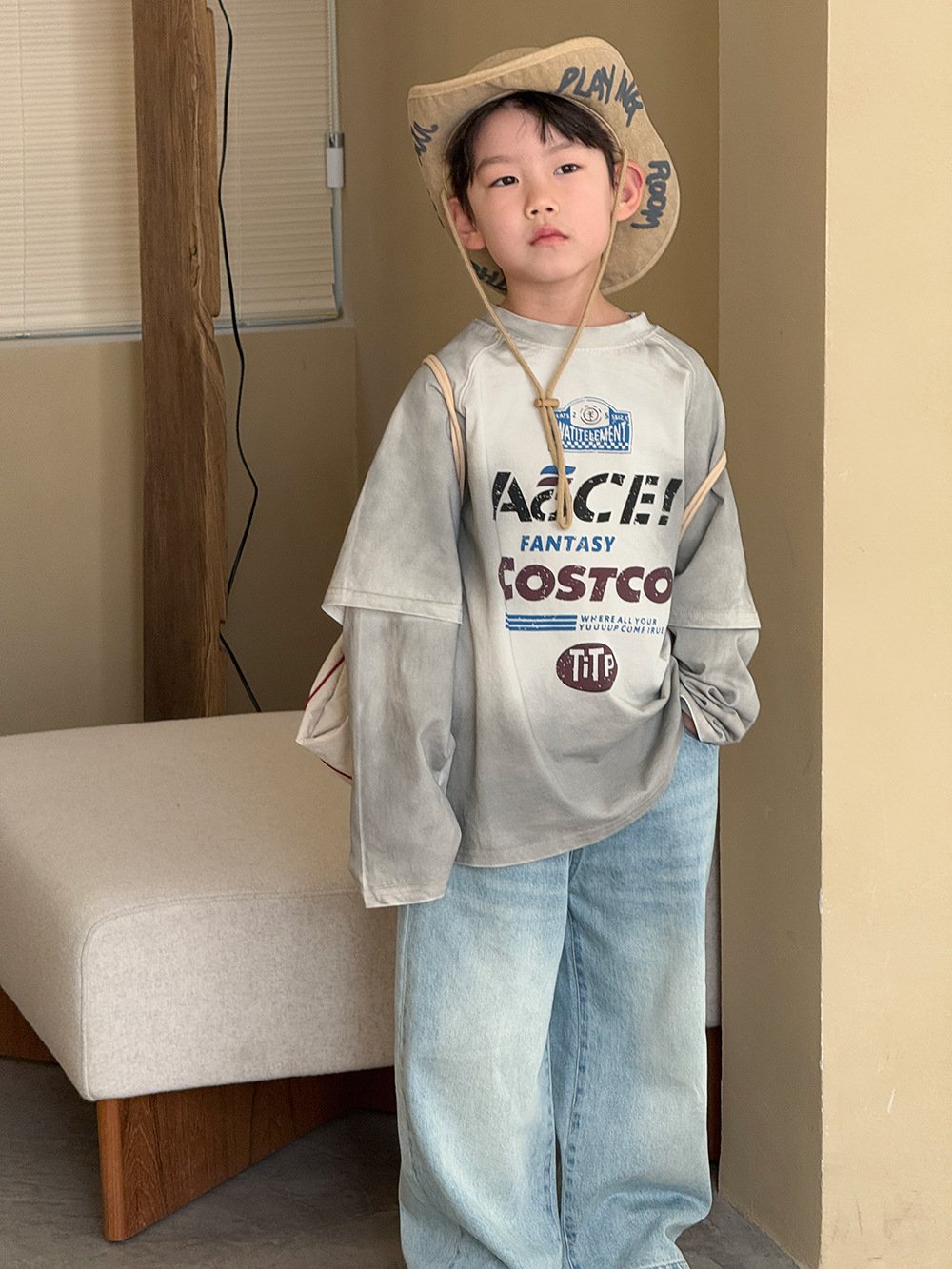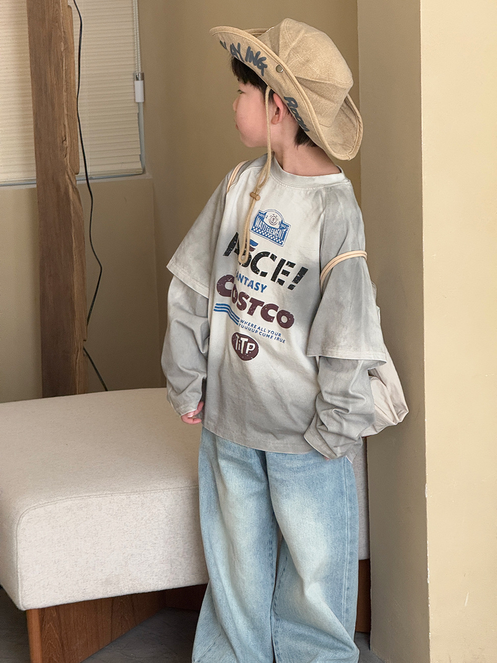 남학생 긴팔 티셔츠 2025 년 봄과 가을 새 가짜 투피스 소년 최고 서양식 편지 봄 아동베이스 셔츠 T스토어 가기