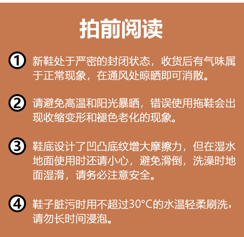 我们发货前都会检查仔细,万一有落网之鱼,请及时联系客服,把有问题的拖鞋拍照留底提交给我们,我们会妥善处理,由于生产过程中鞋处于密封包装,少许新鞋气味,放置通风出些许时间即可散发,产品生产均处于严格管控中,无毒无害放心使用!希望我们的全心全意跟努力能换回你们的5星好评!