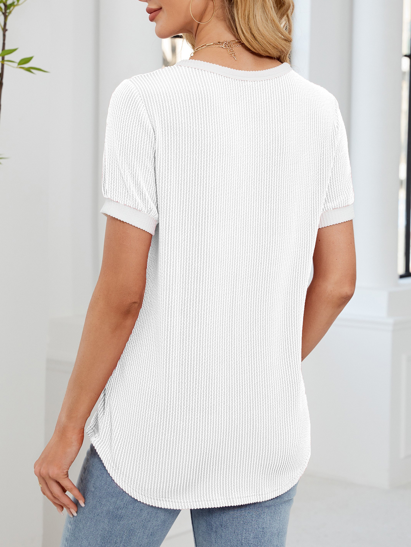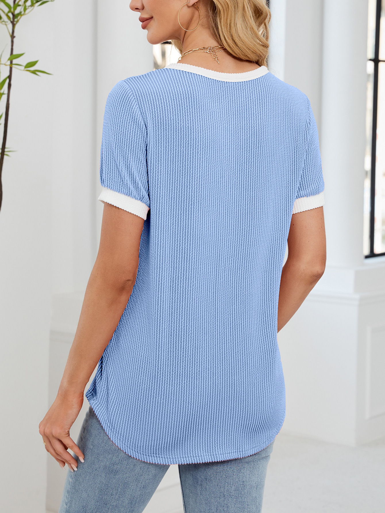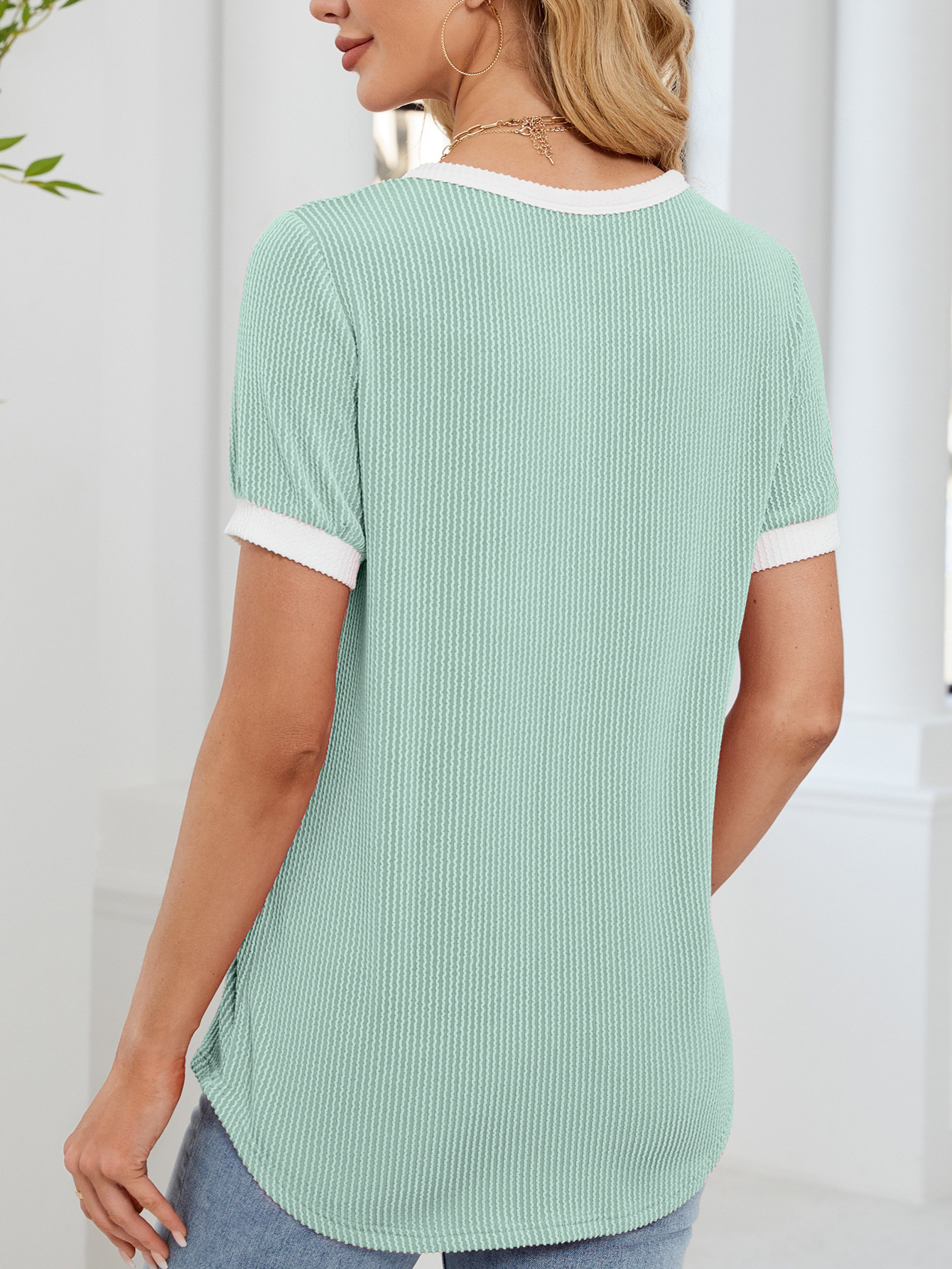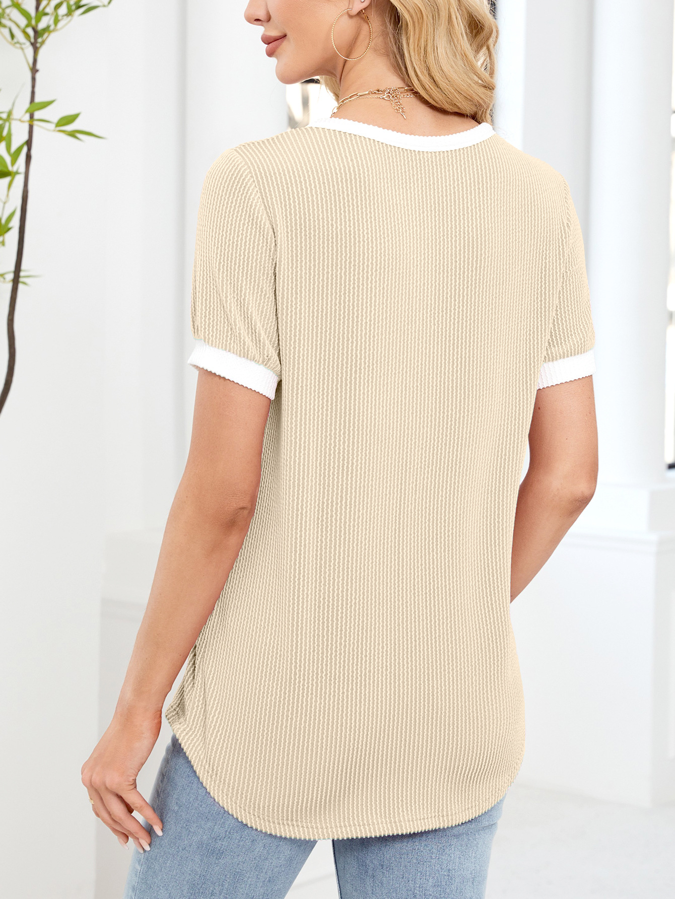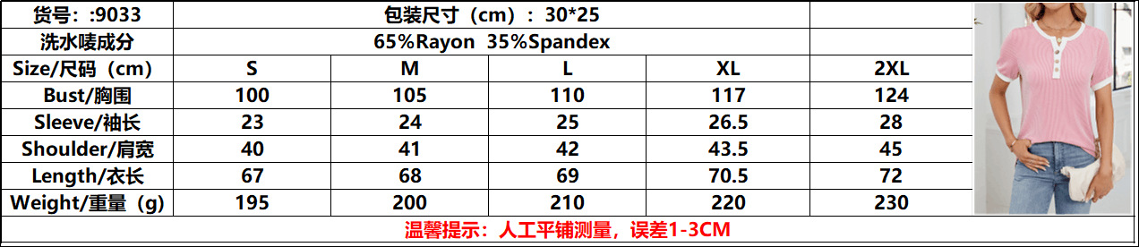 봄과 여름 2025 아마존 새로운 국경 대외 무역 유럽과 미국 여성의 와플 V 넥 짧은 소매 단색 티셔츠 탑스토어 가기
