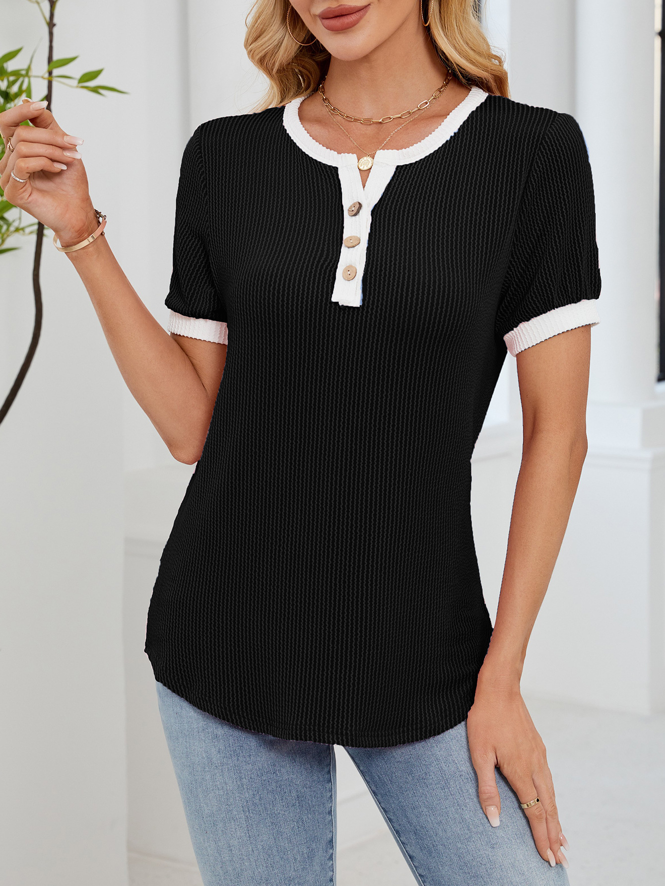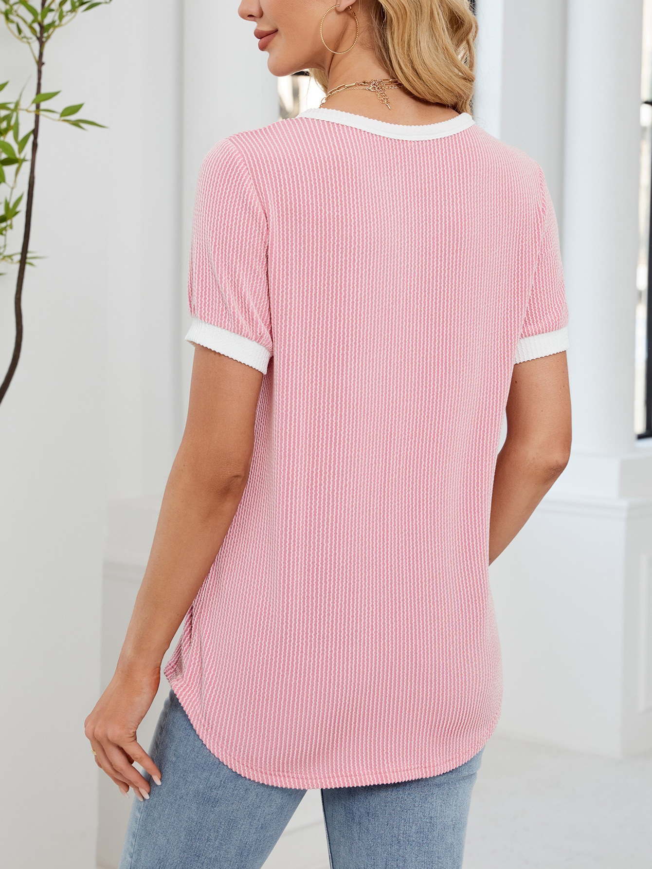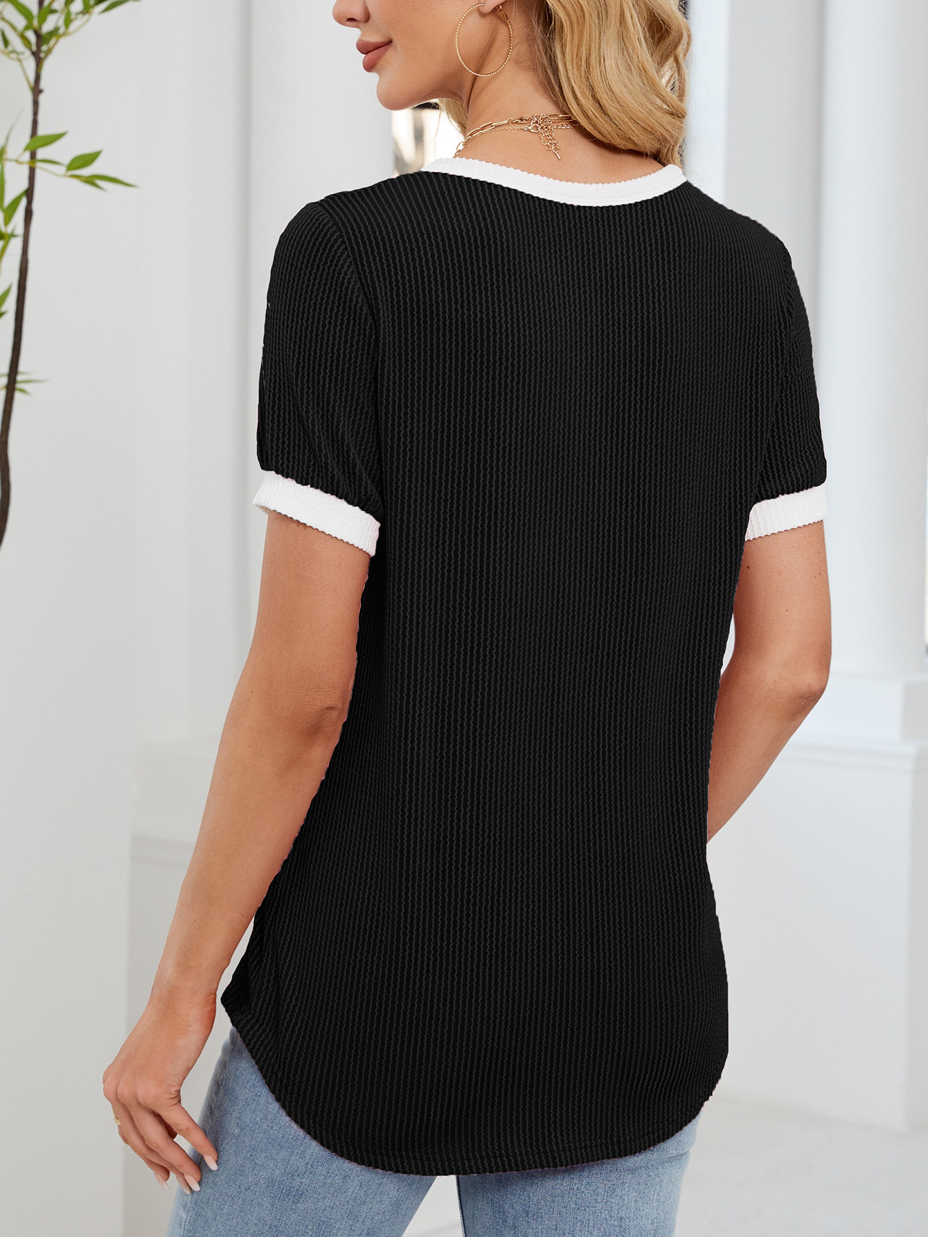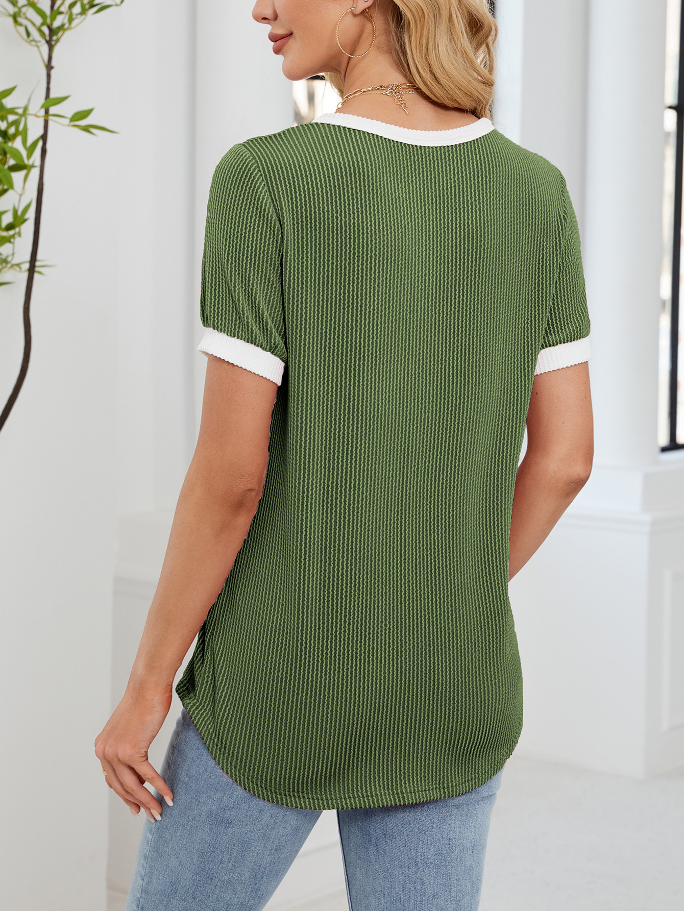 봄과 여름 2025 아마존 새로운 국경 대외 무역 유럽과 미국 여성의 와플 V 넥 짧은 소매 단색 티셔츠 탑스토어 가기