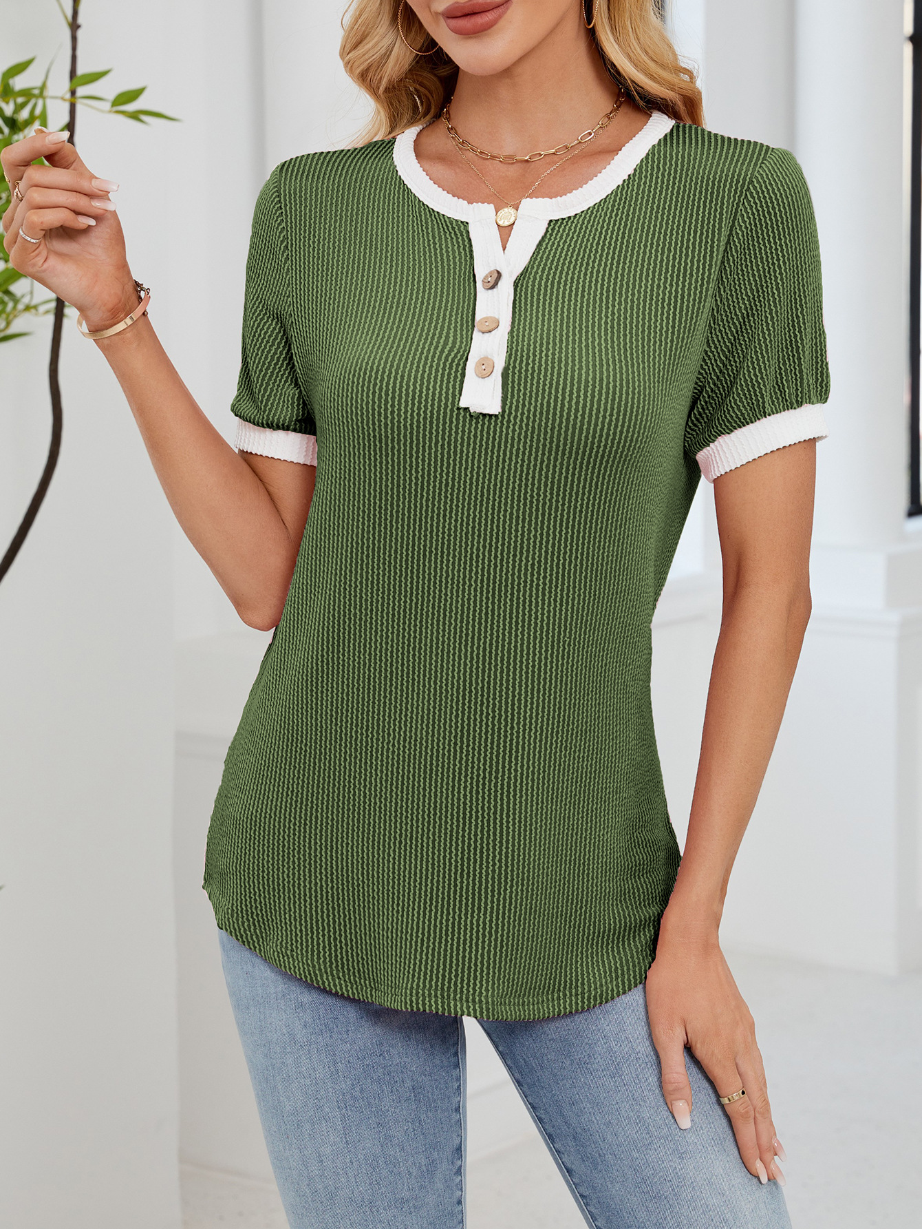 봄과 여름 2025 아마존 새로운 국경 대외 무역 유럽과 미국 여성의 와플 V 넥 짧은 소매 단색 티셔츠 탑