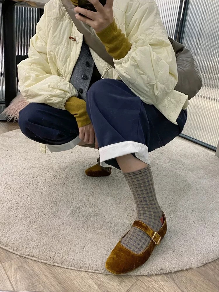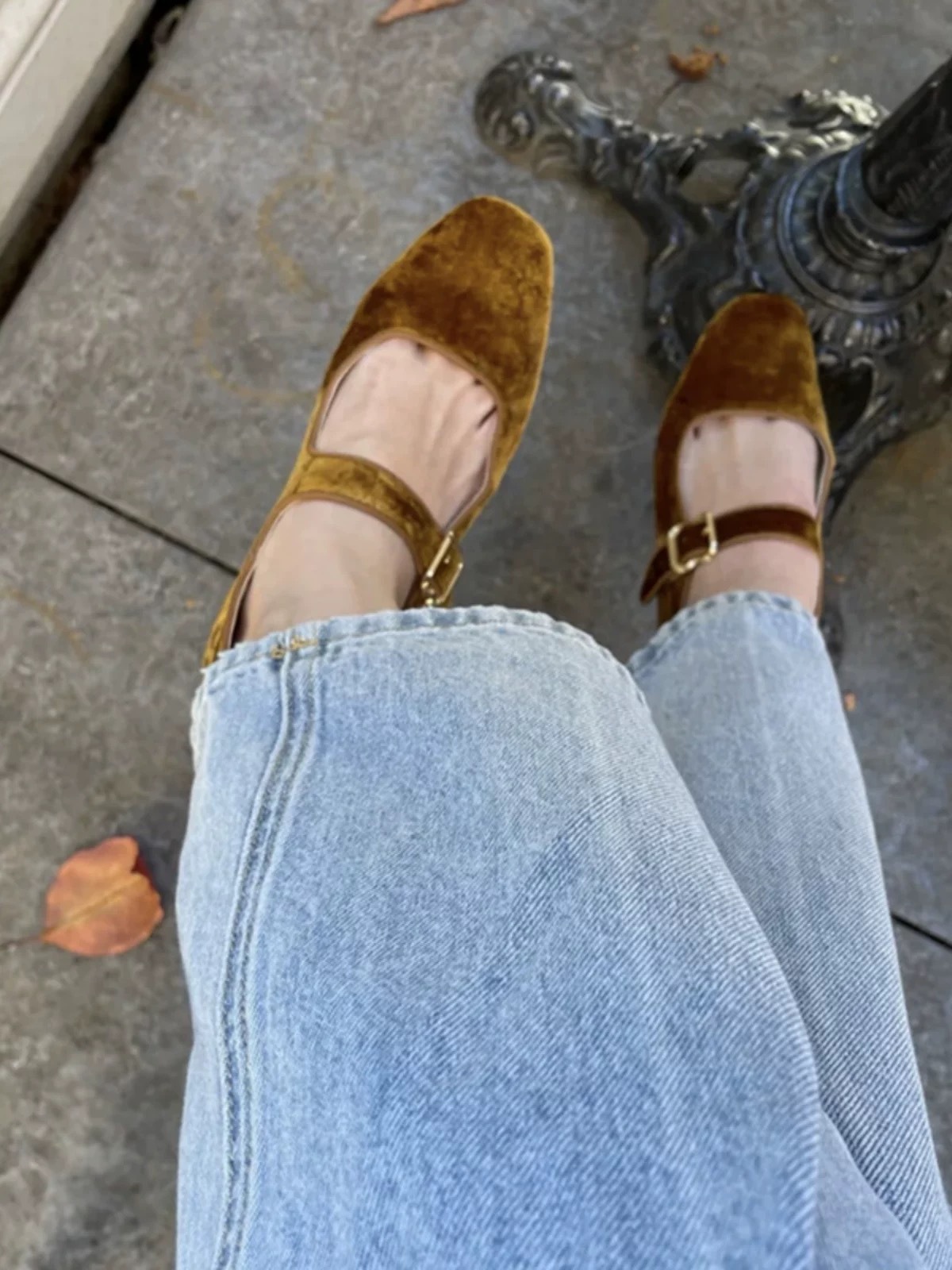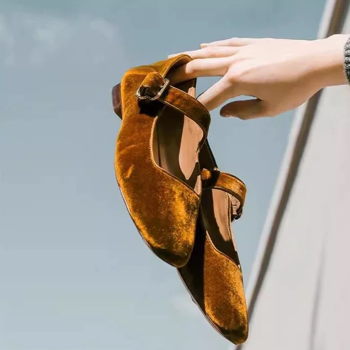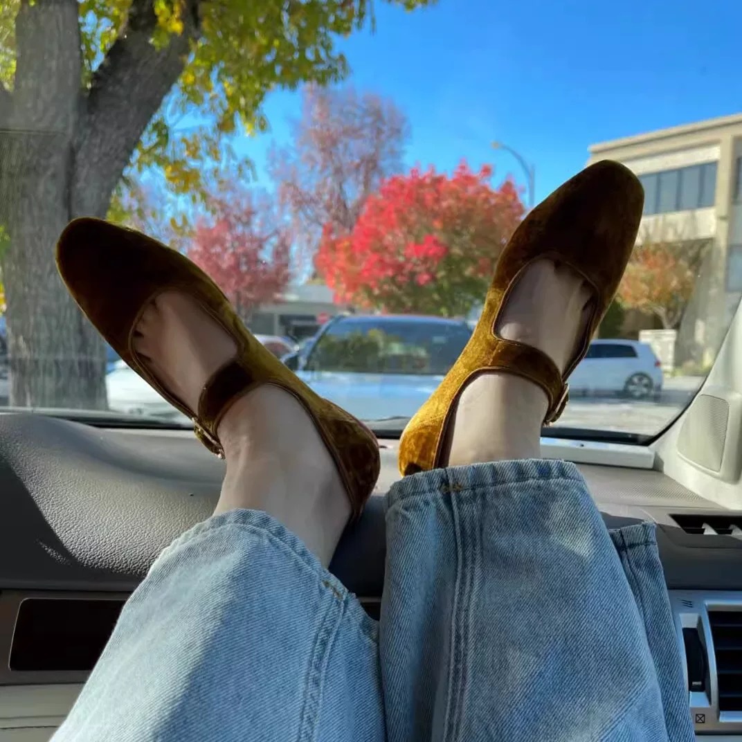 정품 가죽 벨벳 한국 인 플랫 싱글 레이어 신발 여성 2025 봄 올 매치 스퀘어 토 얕은 입 신발 메리 제인 신발스토어 가기