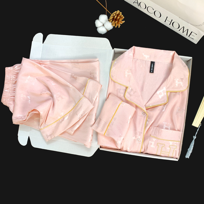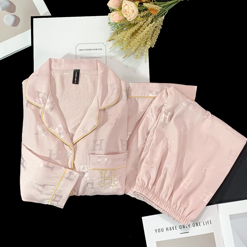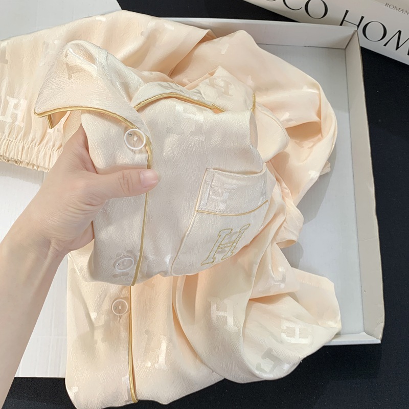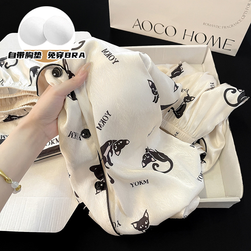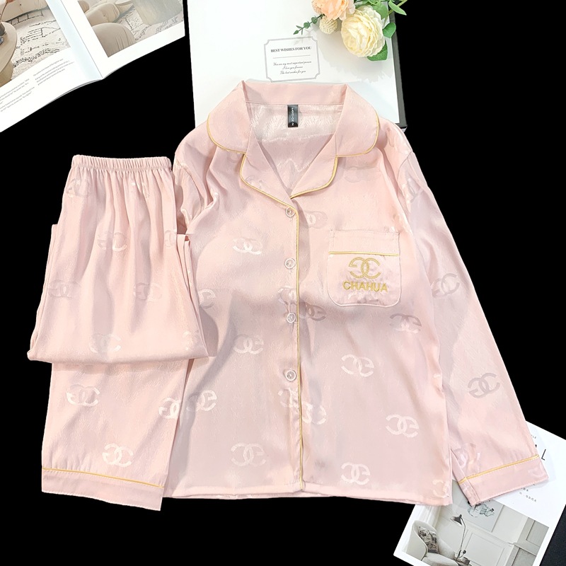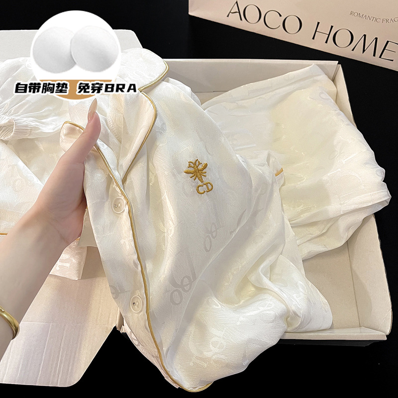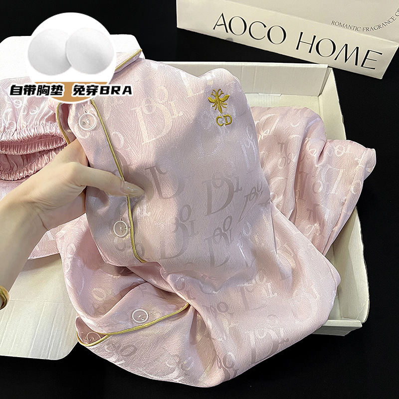 고급 핑크 아이스 실크 리본 패드 잠옷 여성의 봄과 가을 2025 새로운 여성의 실크 홈 의류 세트스토어 가기