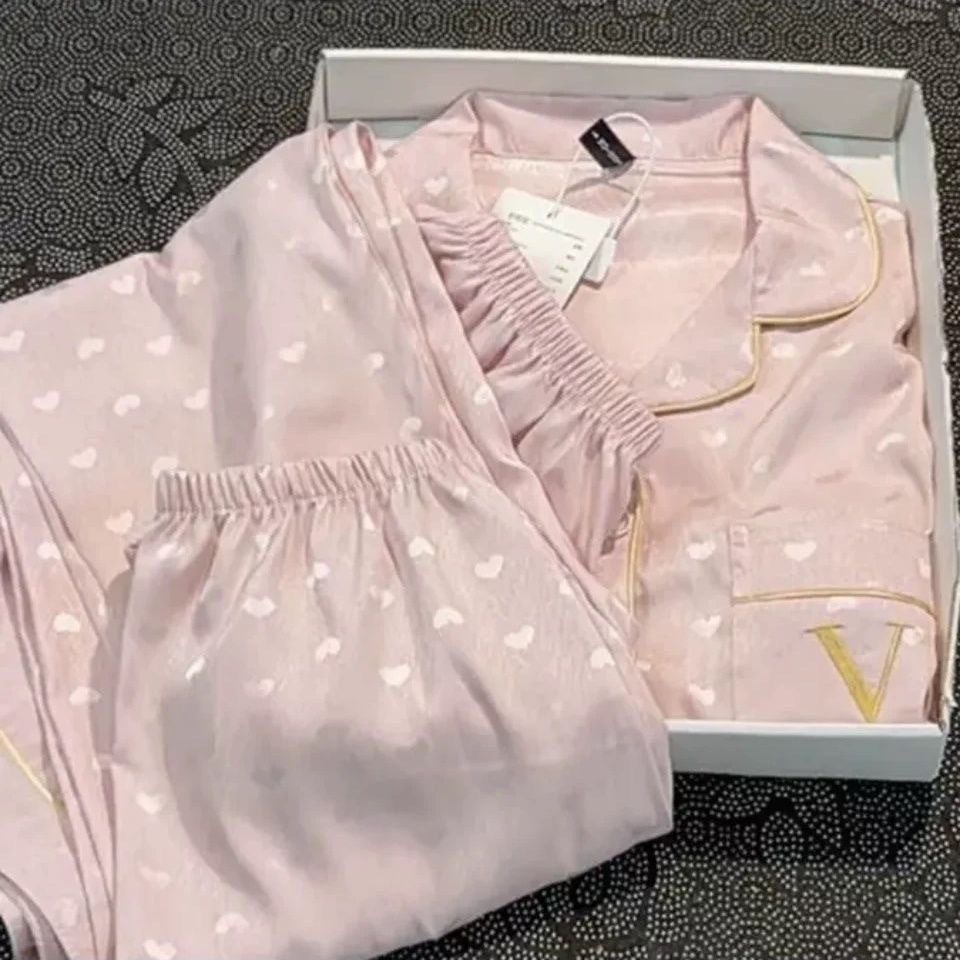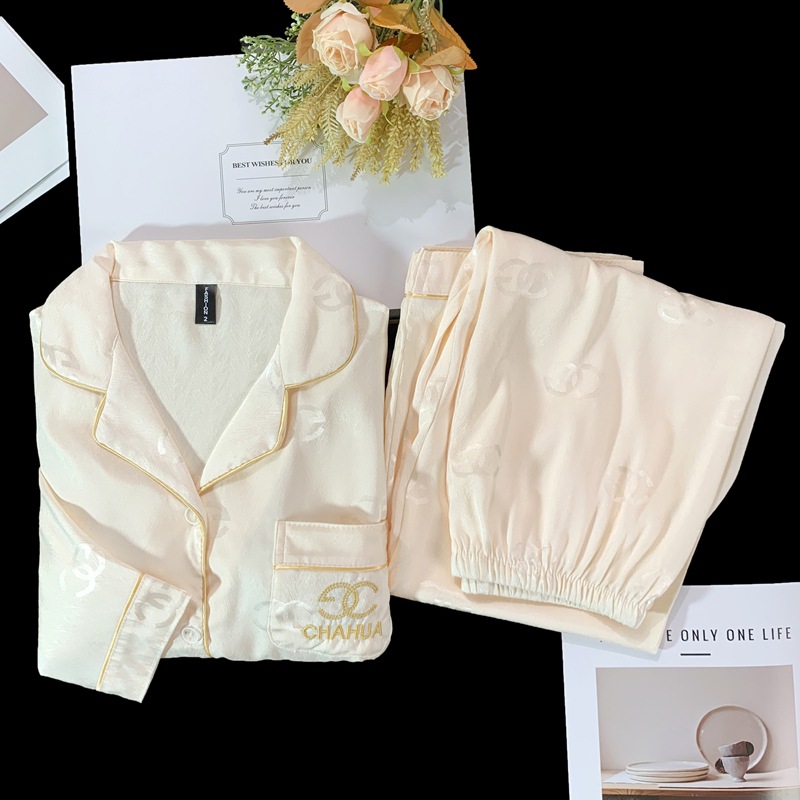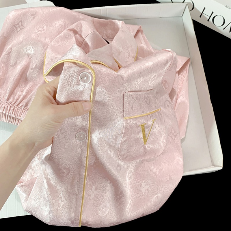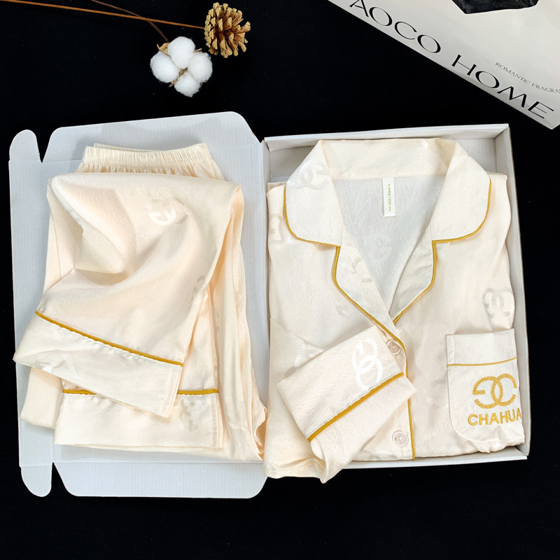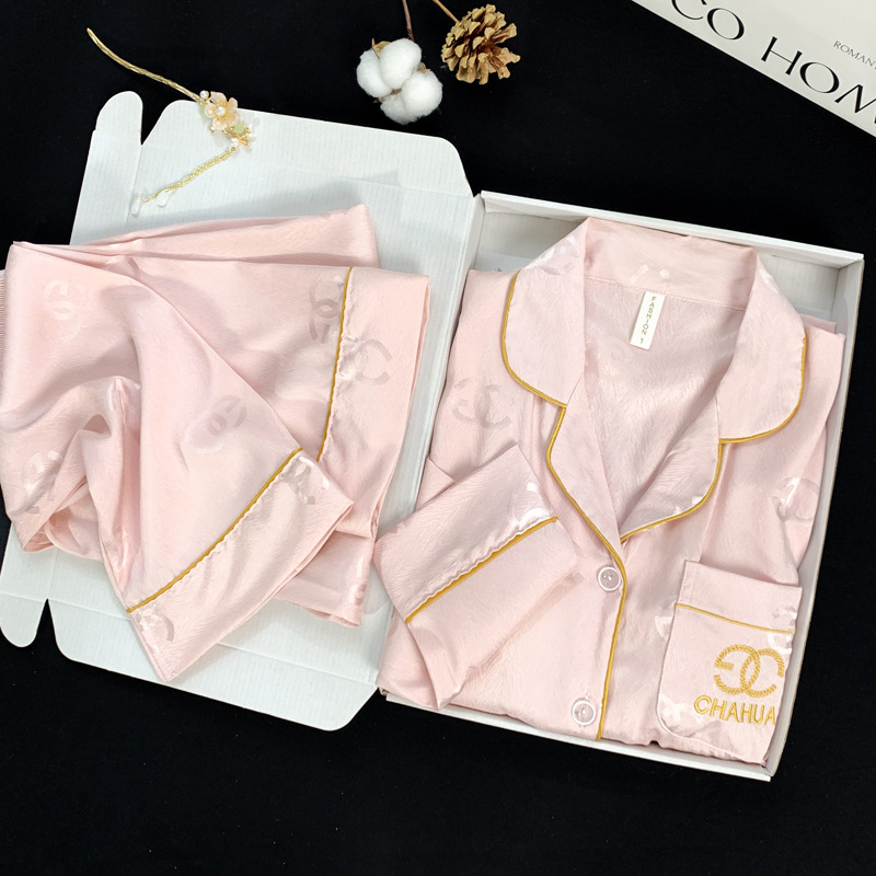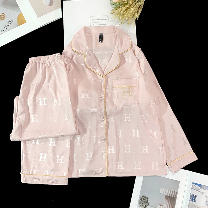 고급 핑크 아이스 실크 리본 패드 잠옷 여성의 봄과 가을 2025 새로운 여성의 실크 홈 의류 세트스토어 가기