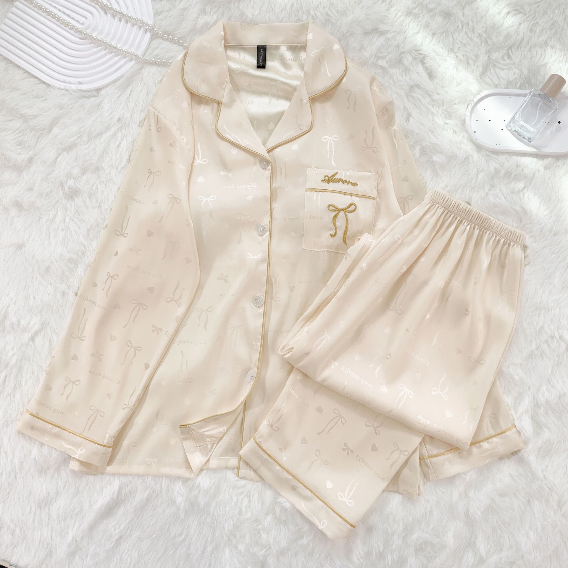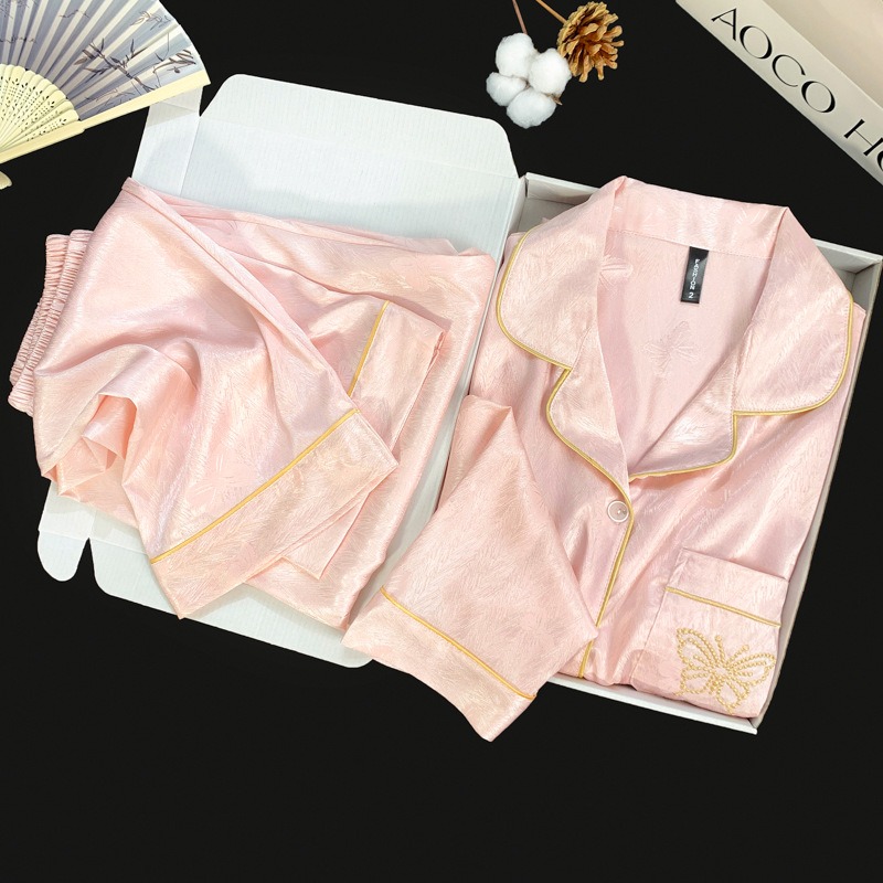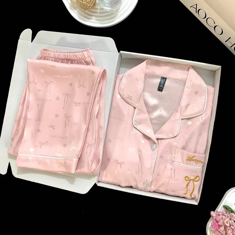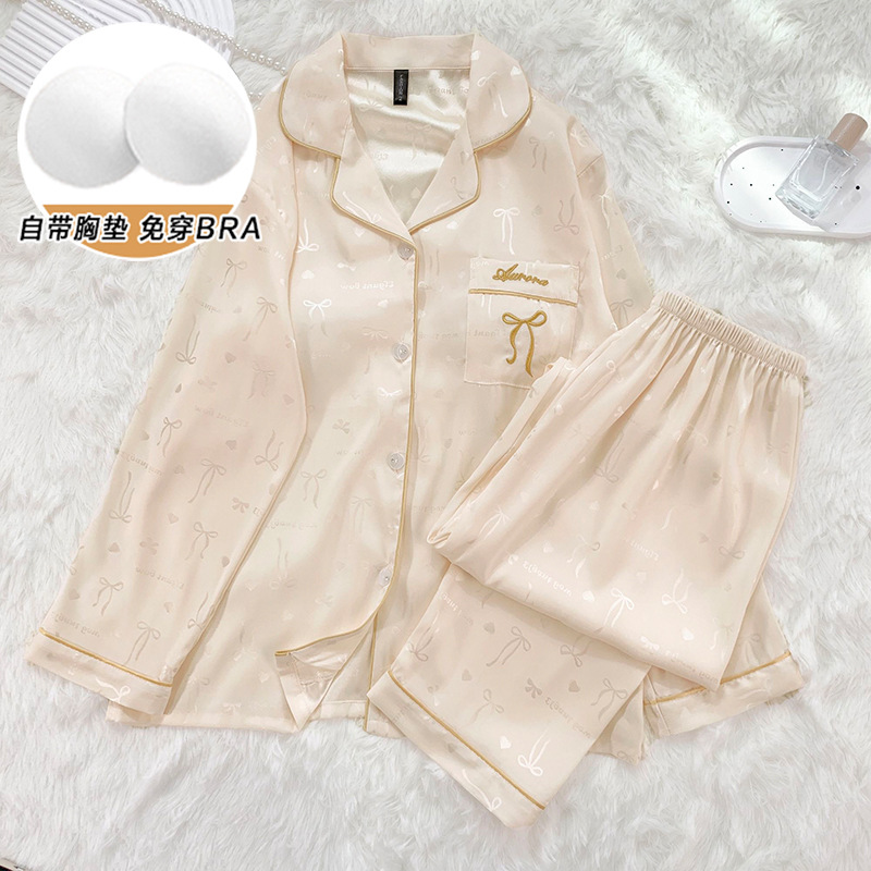 고급 핑크 아이스 실크 리본 패드 잠옷 여성의 봄과 가을 2025 새로운 여성의 실크 홈 의류 세트