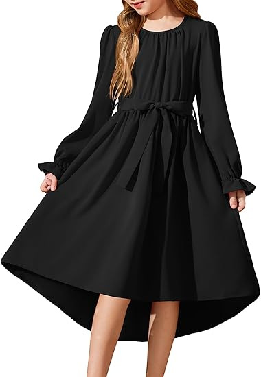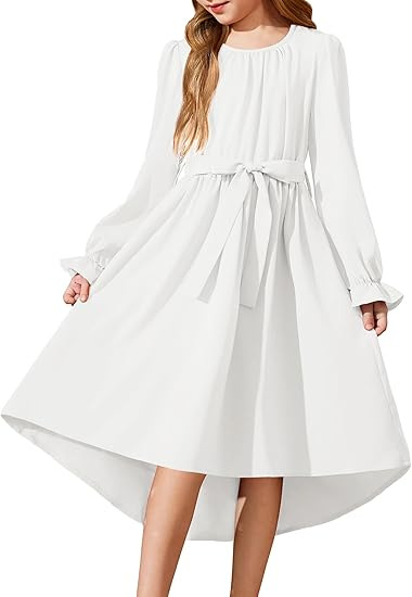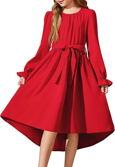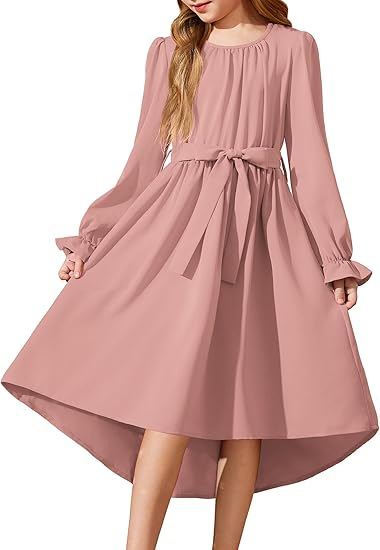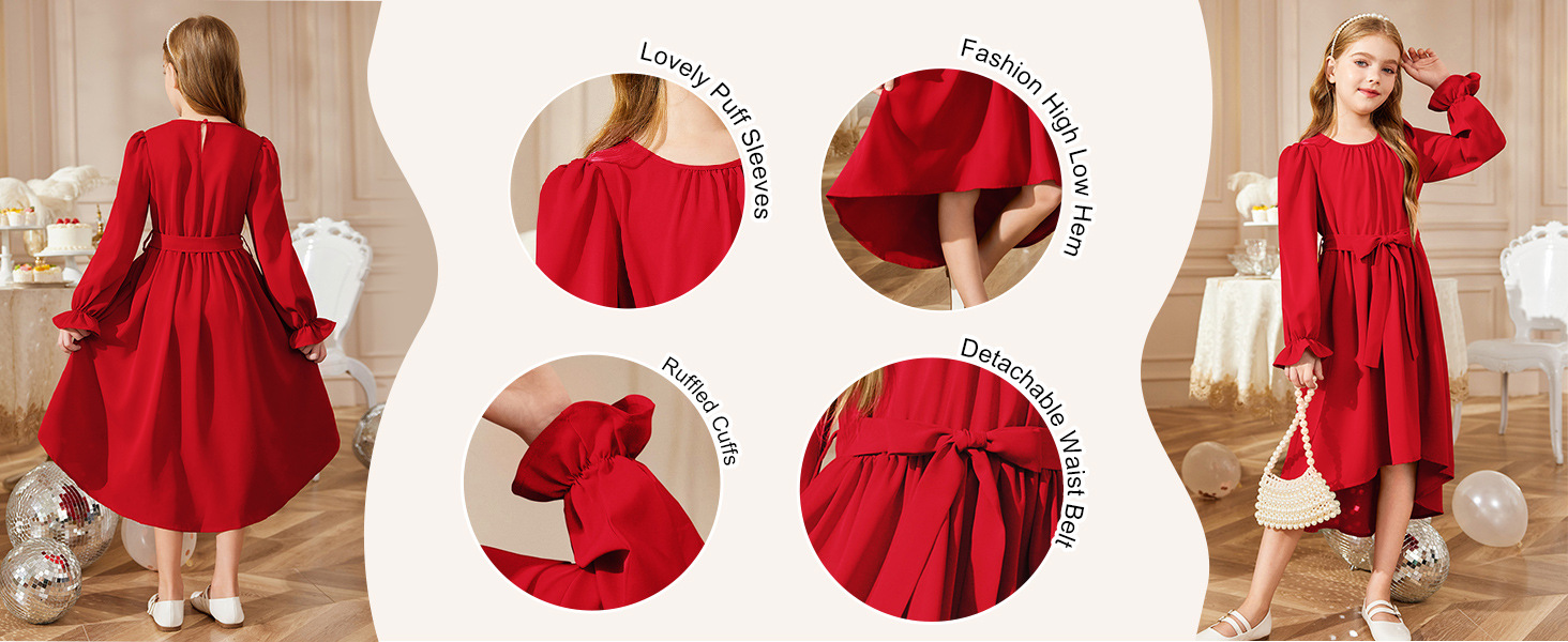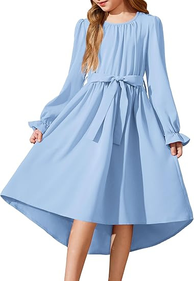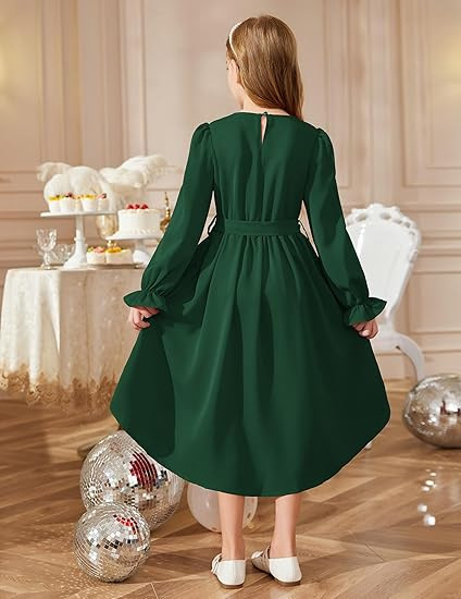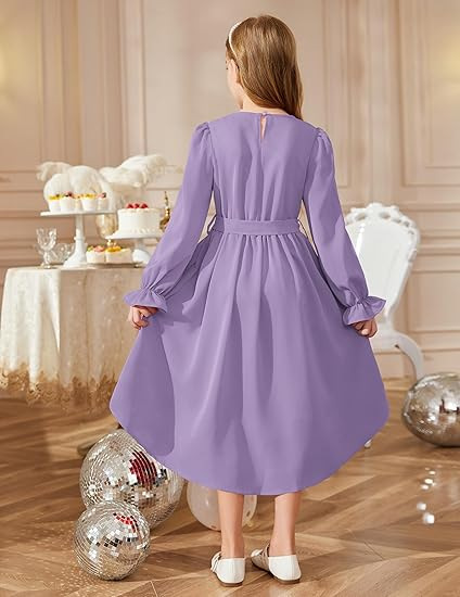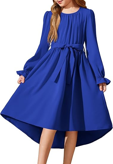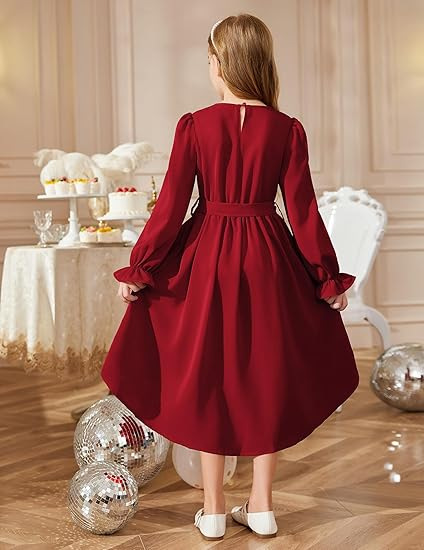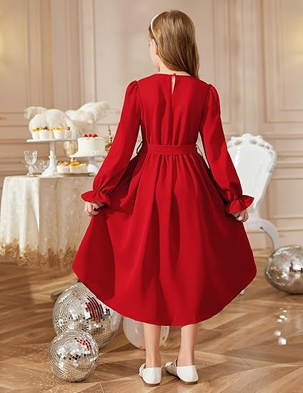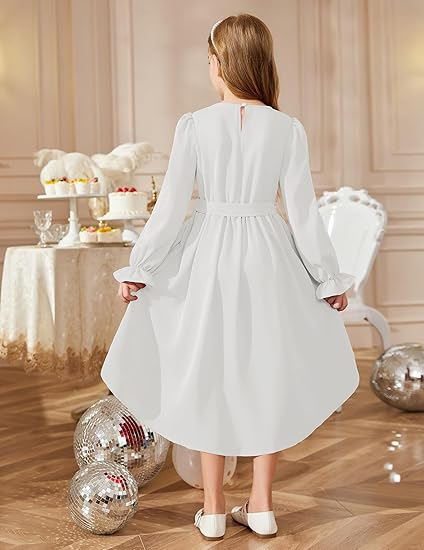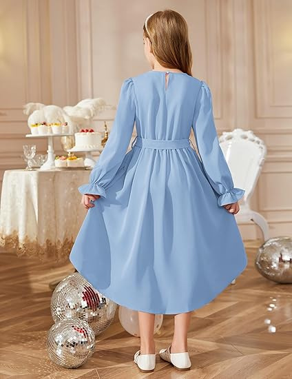 국경을 넘는 스타일의 라운드넥, 넓은 밑단의 여아용 긴팔 패셔너블하고 우아한 파티 드레스, 벨트 포함 원피스 5011스토어 가기
