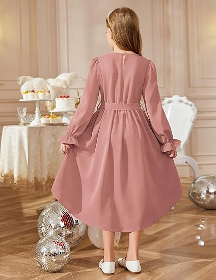 국경을 넘는 스타일의 라운드넥, 넓은 밑단의 여아용 긴팔 패셔너블하고 우아한 파티 드레스, 벨트 포함 원피스 5011