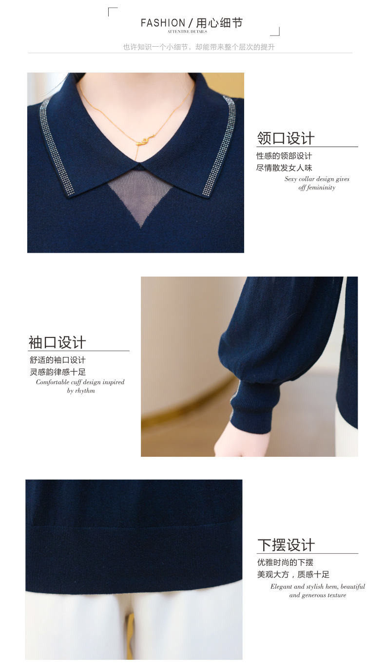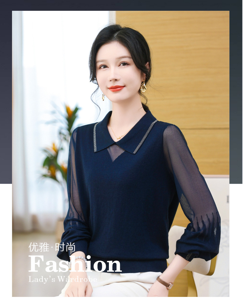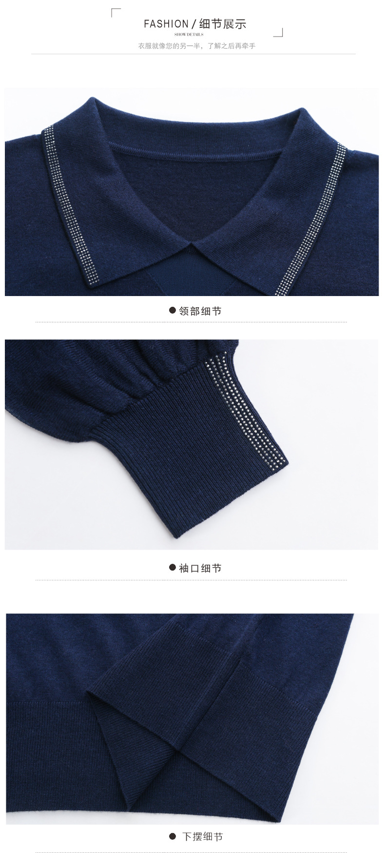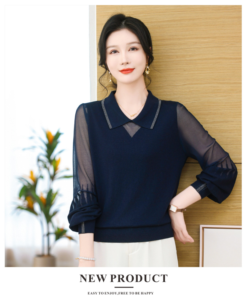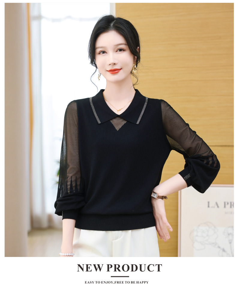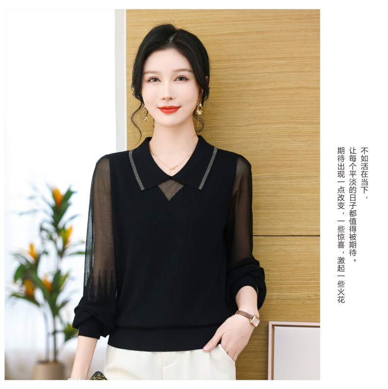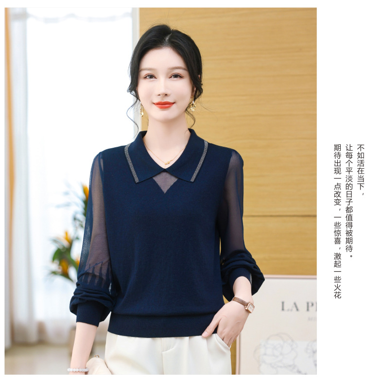 봄과 가을 신상 아이스 실크 다이아몬드 장식 티셔츠, 쉬폰 소매 여성용 봄 스타일 인형 폴로 칼라 루즈핏 니트 베이스 셔츠스토어 가기