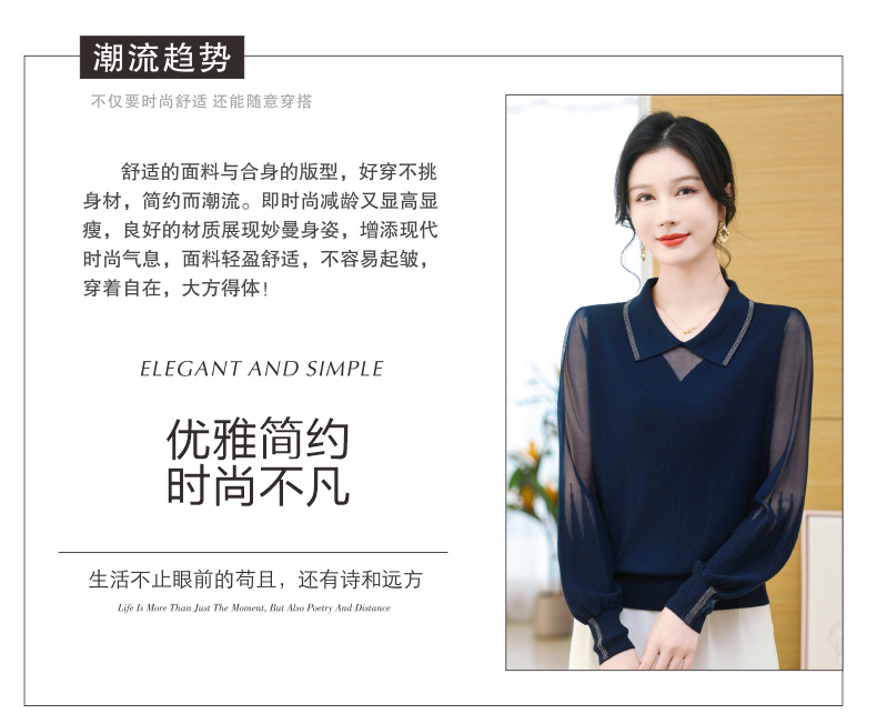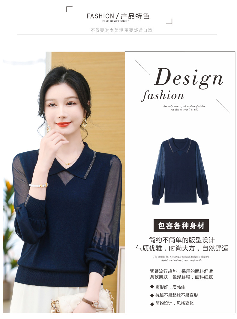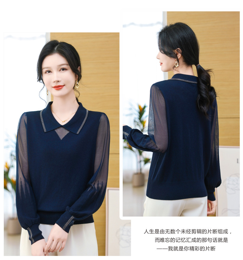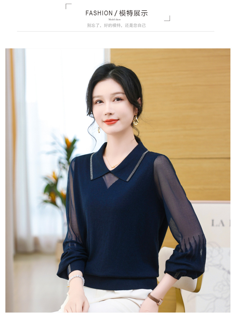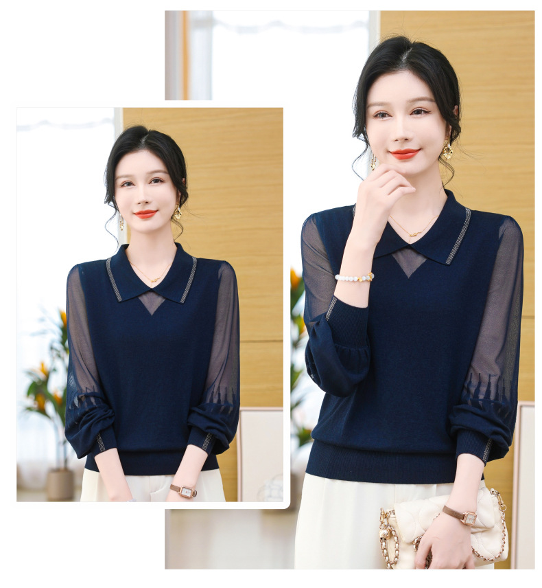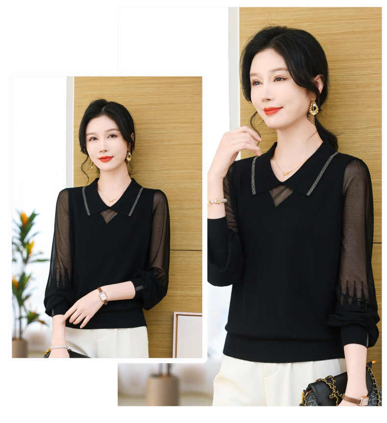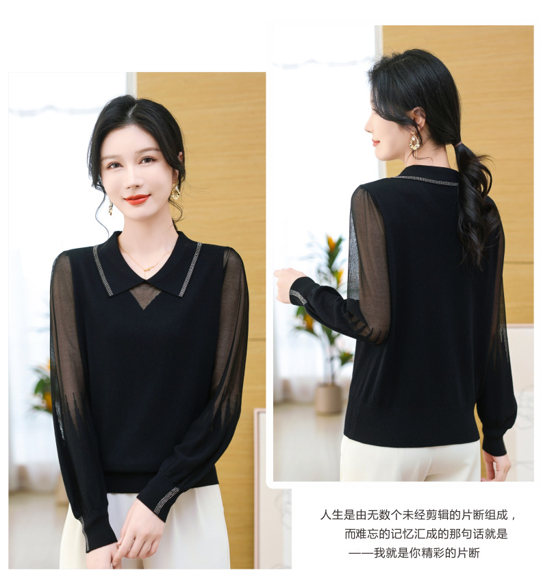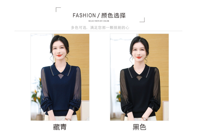 봄과 가을 신상 아이스 실크 다이아몬드 장식 티셔츠, 쉬폰 소매 여성용 봄 스타일 인형 폴로 칼라 루즈핏 니트 베이스 셔츠스토어 가기