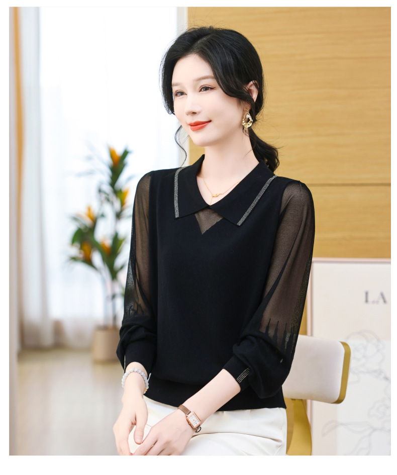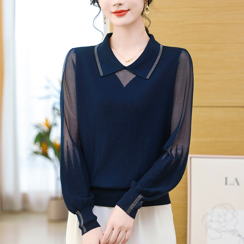봄과 가을 신상 아이스 실크 다이아몬드 장식 티셔츠, 쉬폰 소매 여성용 봄 스타일 인형 폴로 칼라 루즈핏 니트 베이스 셔츠