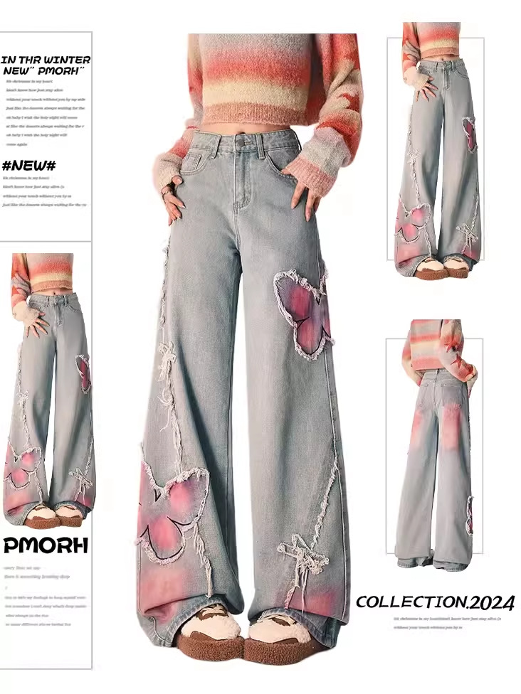 검은 달콤한 시원한 청바지 여성의 봄 새로운 씻은 오래 된 모직 넓은 다리 바지 나비 패턴 디자인 센스 바지스토어 가기