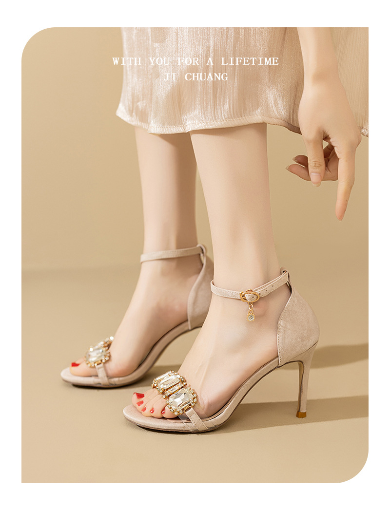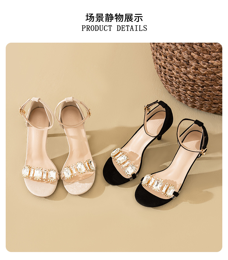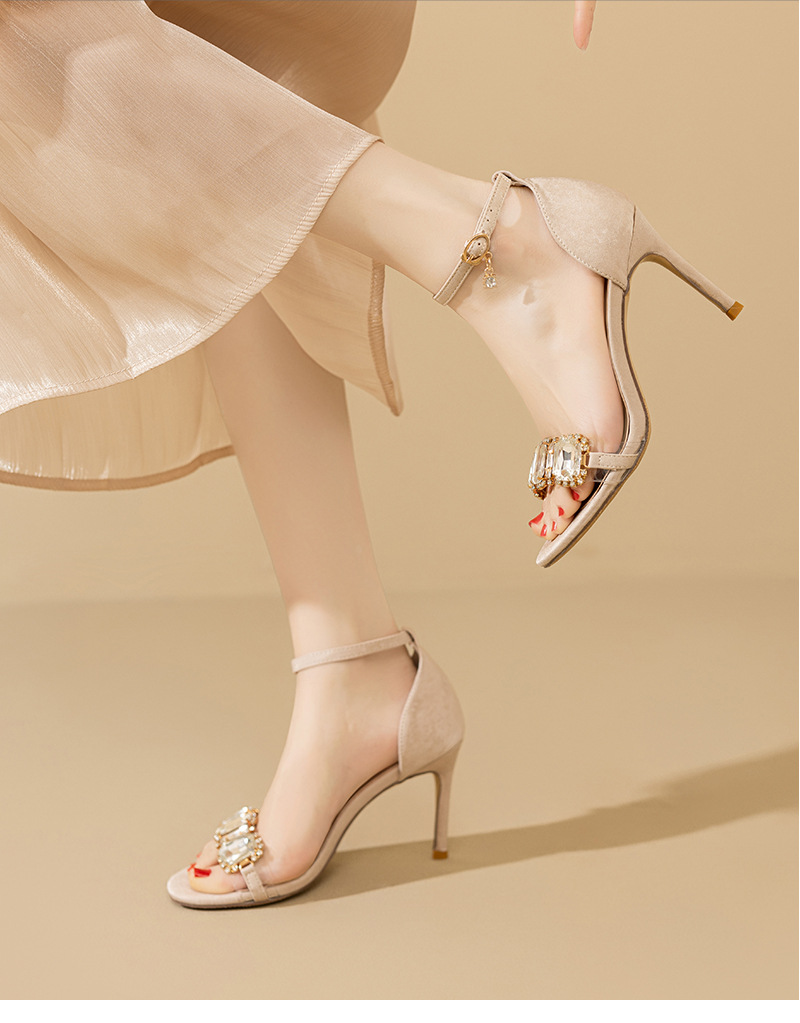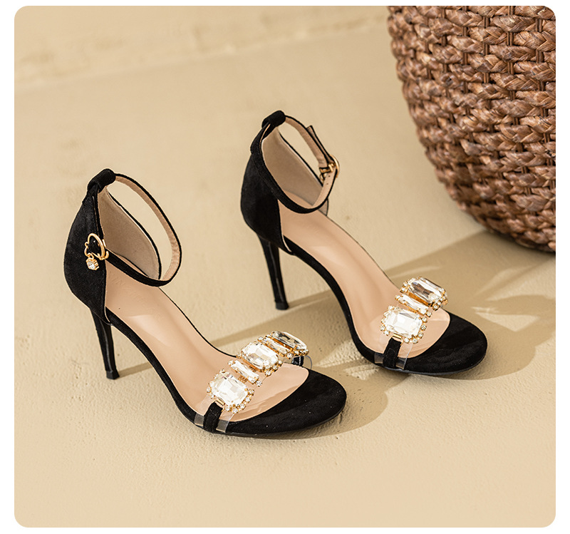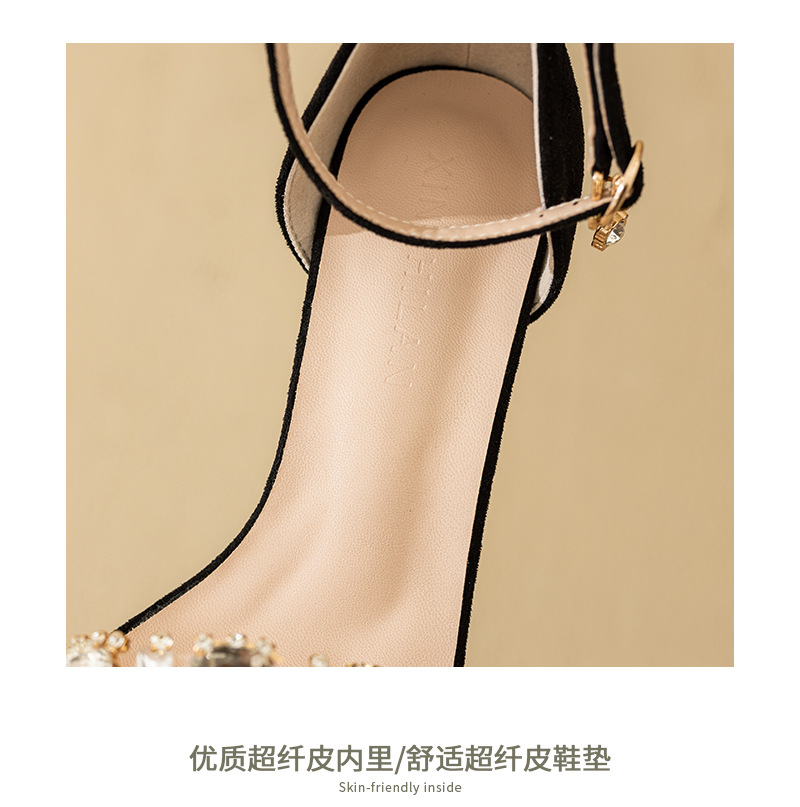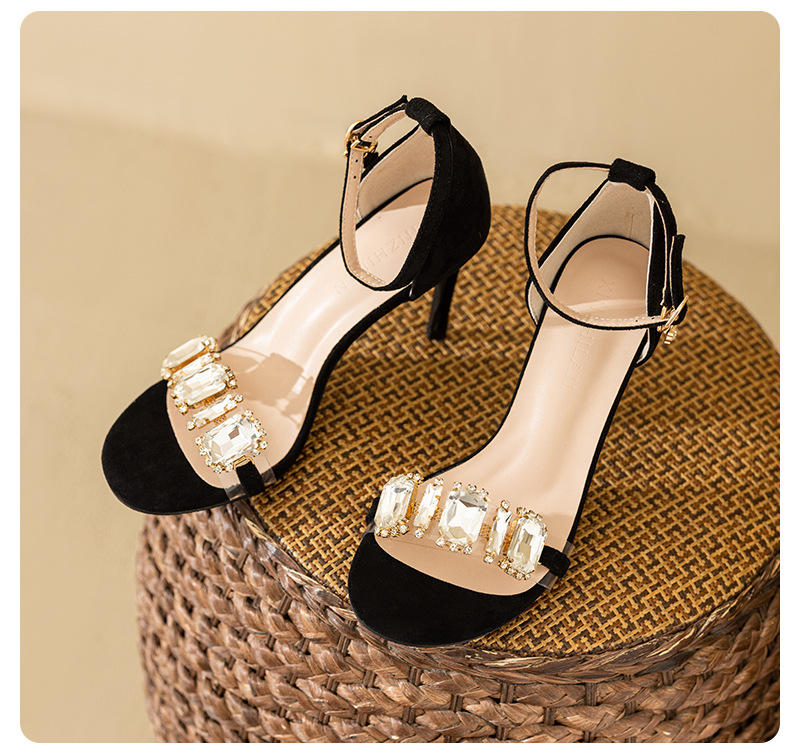 2025 새로운 봄 하이힐 샌들 여자 한 단어 버클 오픈 발가락 얇은 힐 레트로 브라이트 블랙 라인스톤 하이힐스토어 가기