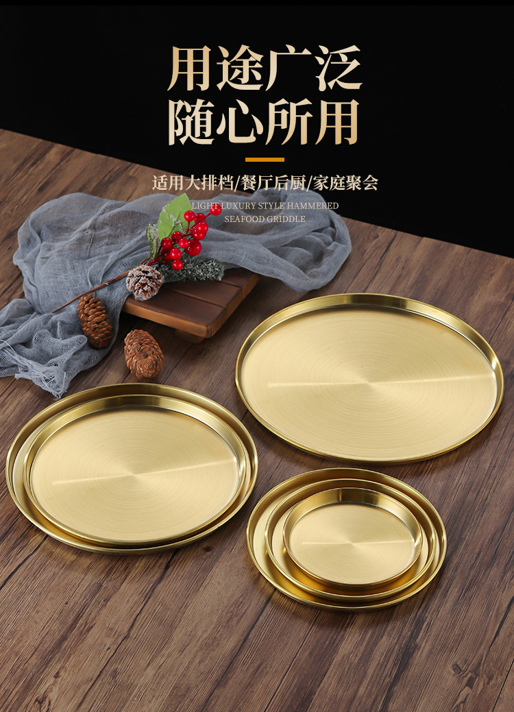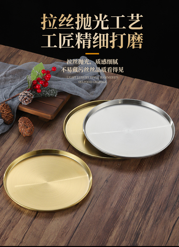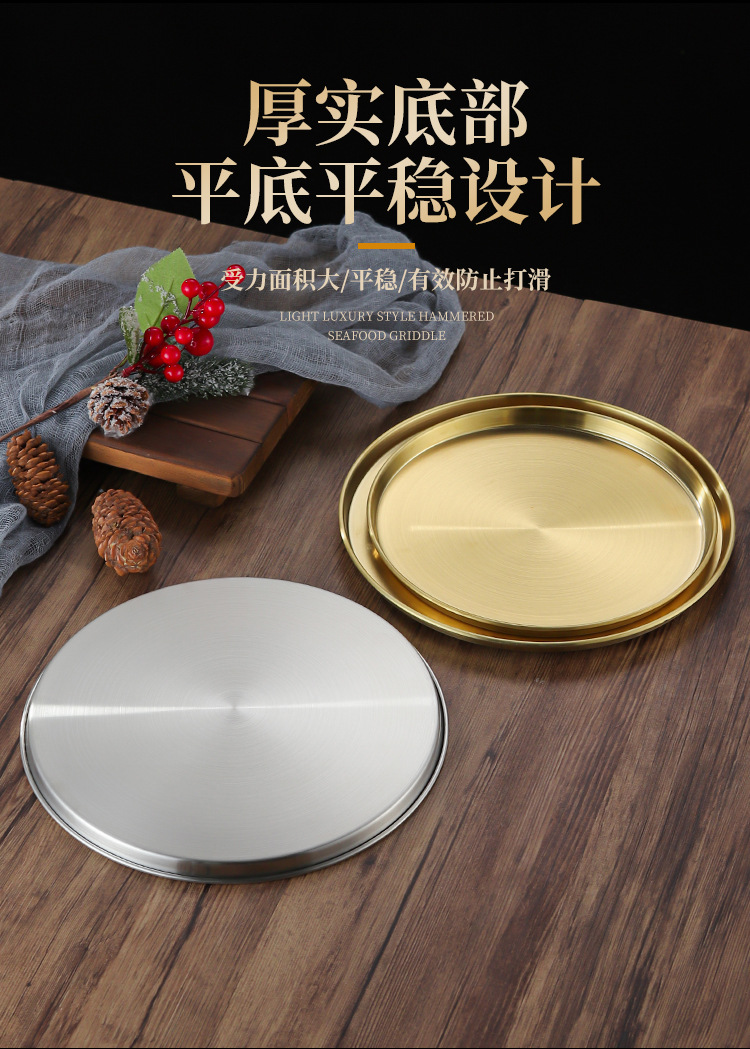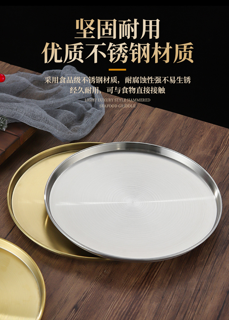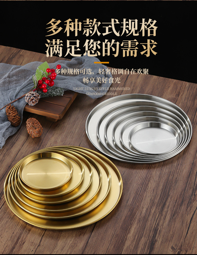 스테인레스 스틸 컬링 디스크 황금 일본 바베큐 플레이트 라운드 요리 피자 플레이트 과일 트레이 두꺼운 대형 디스크