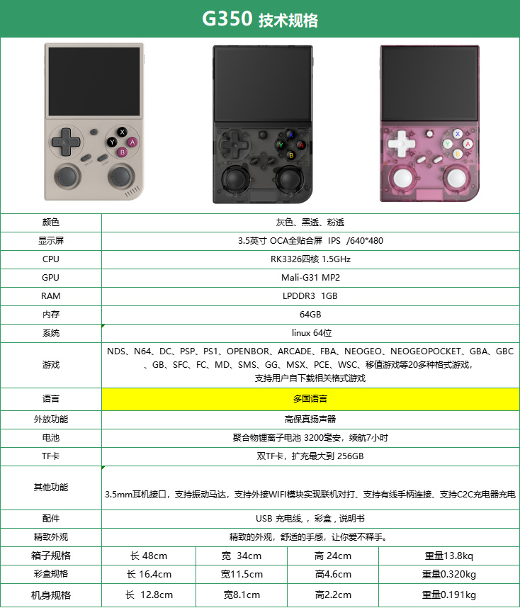 G350 오픈 소스 휴대용 게임기 3.5 "휴대용 레트로 더블 로커 아케이드 외부 WIFI 국경 독점스토어 가기