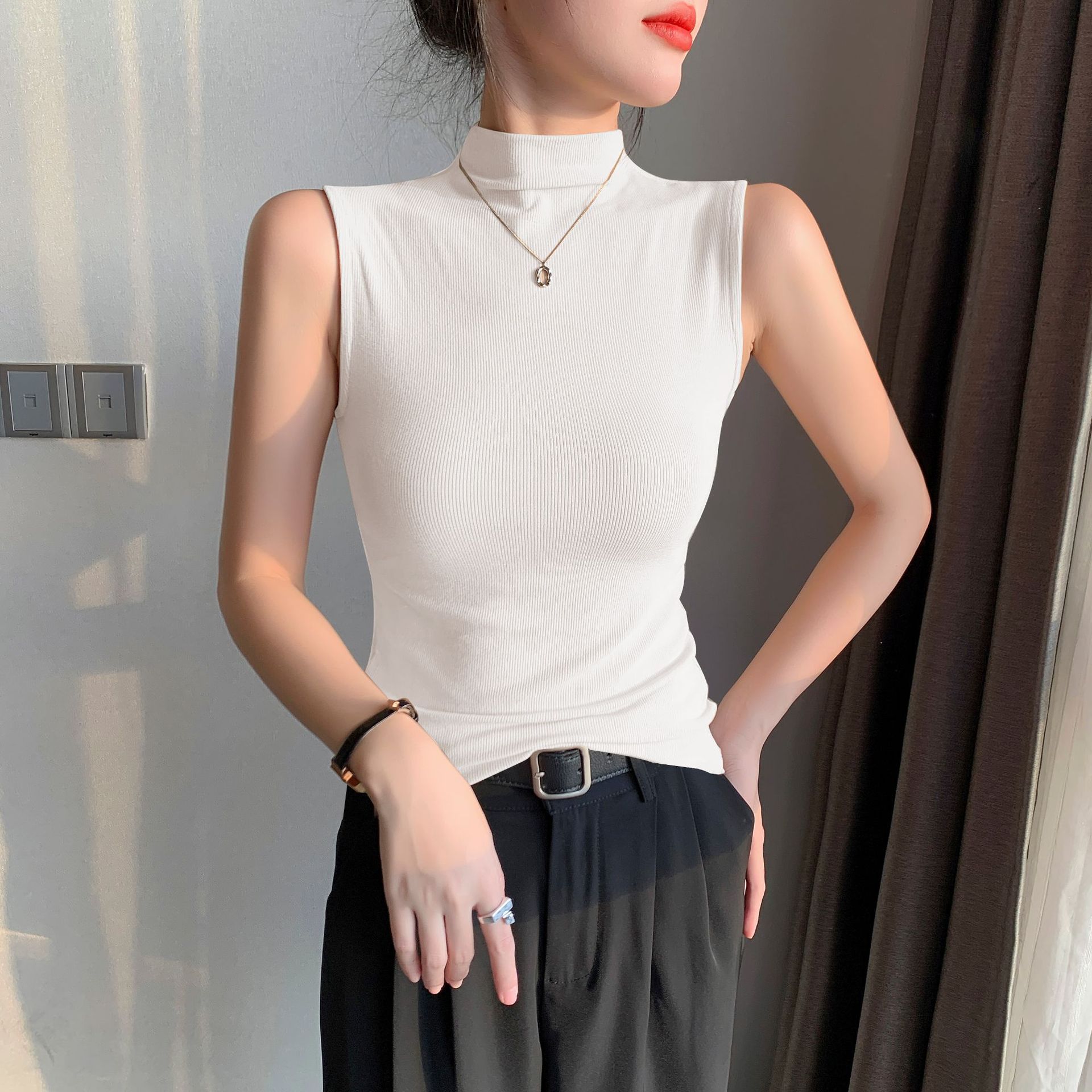 여자 하프 하이 칼라 조끼 2025 년 봄과 여름 새로운 블랙 모달 어깨 슬림-여성을위한 올 매치 민소매 탑스토어 가기