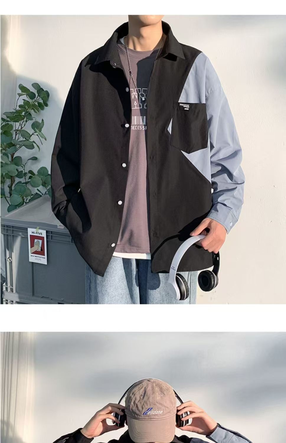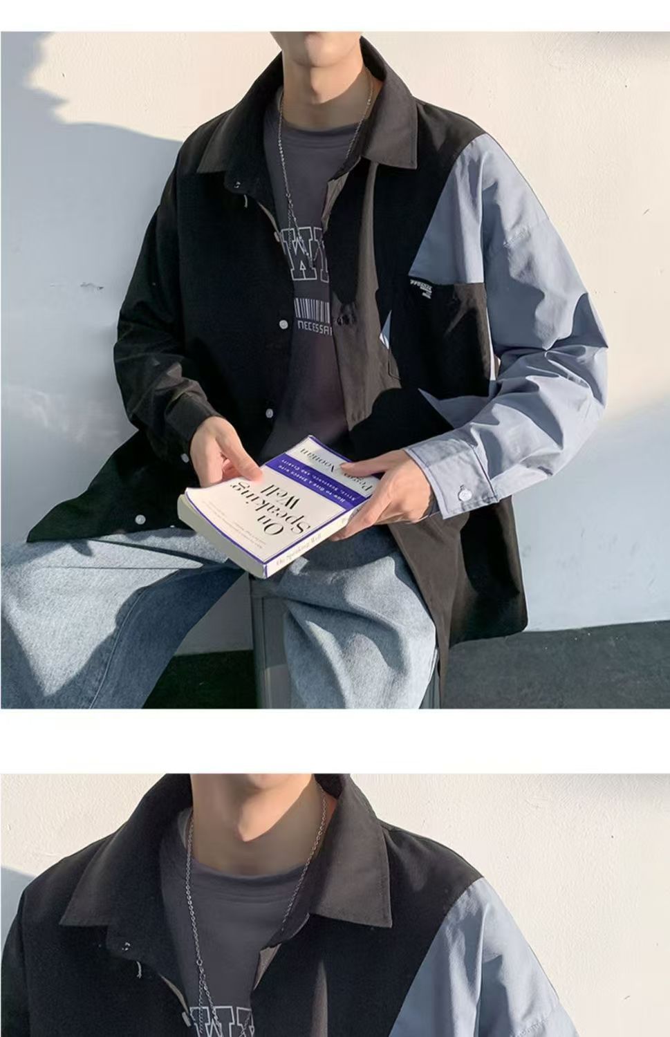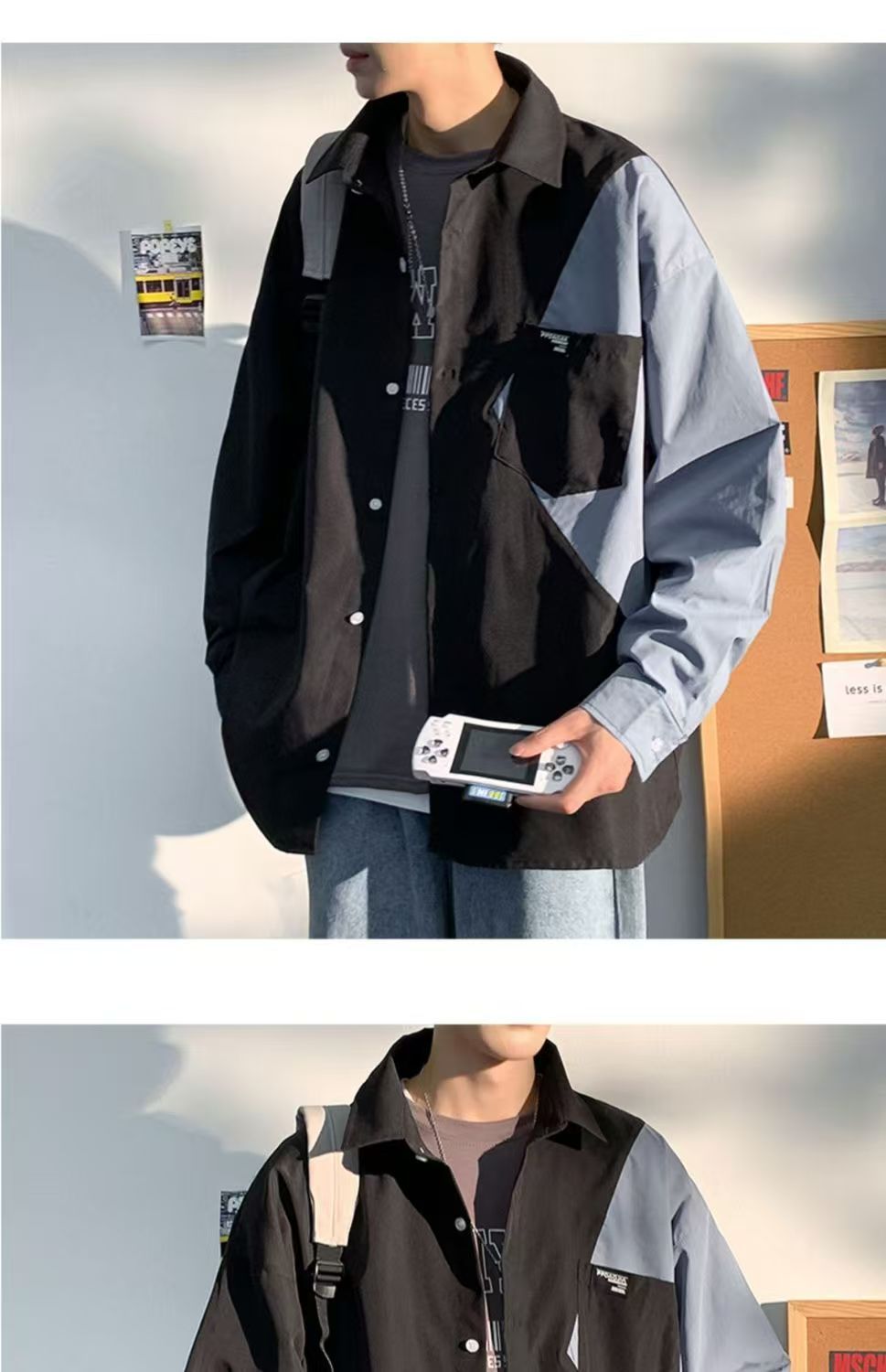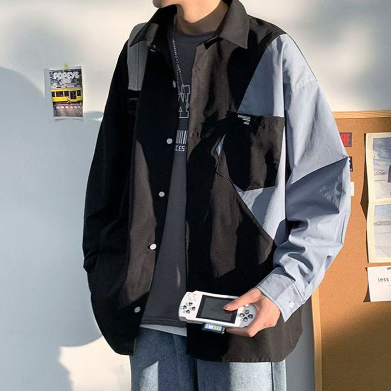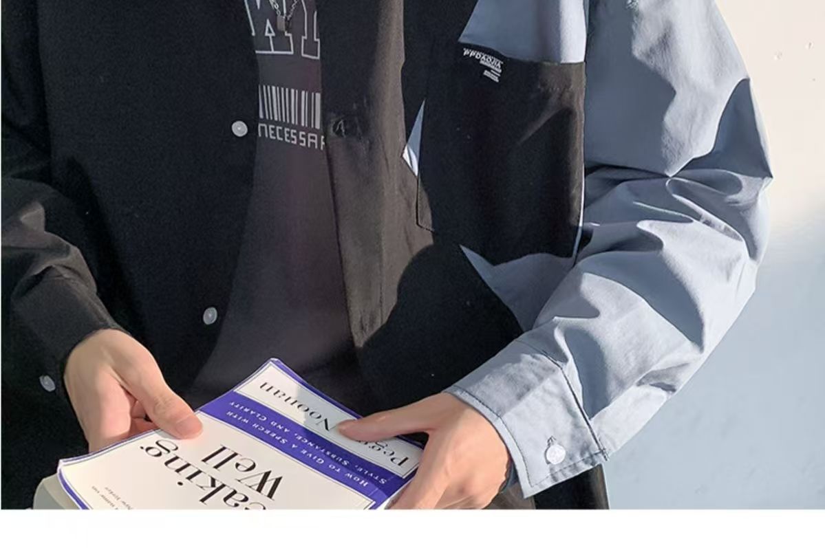 봄과 가을 홍콩 스타일 바느질 셔츠 남성용 긴팔 올매치 느슨한 디자인 센스 트렌디 브랜드 일본 스타일 셔츠 재킷 남성용 단색