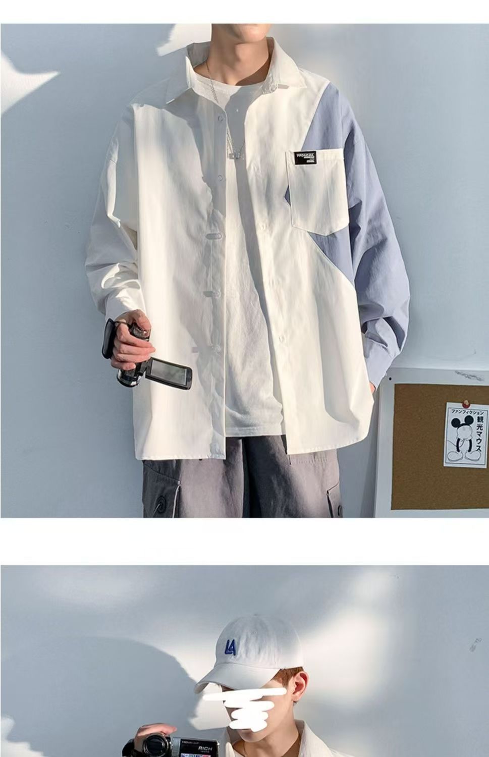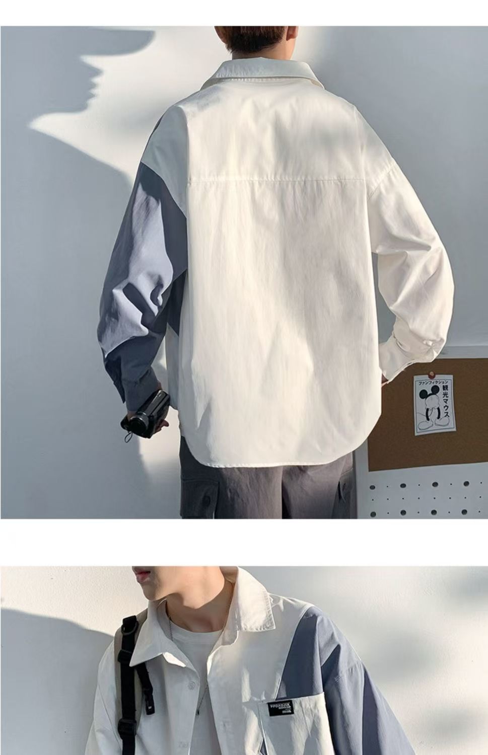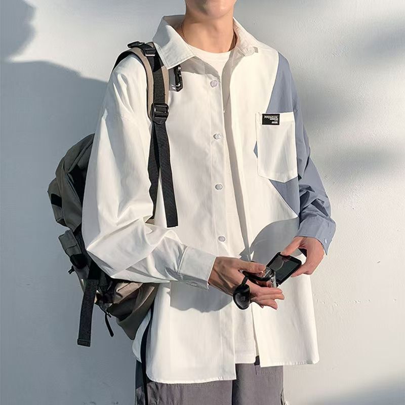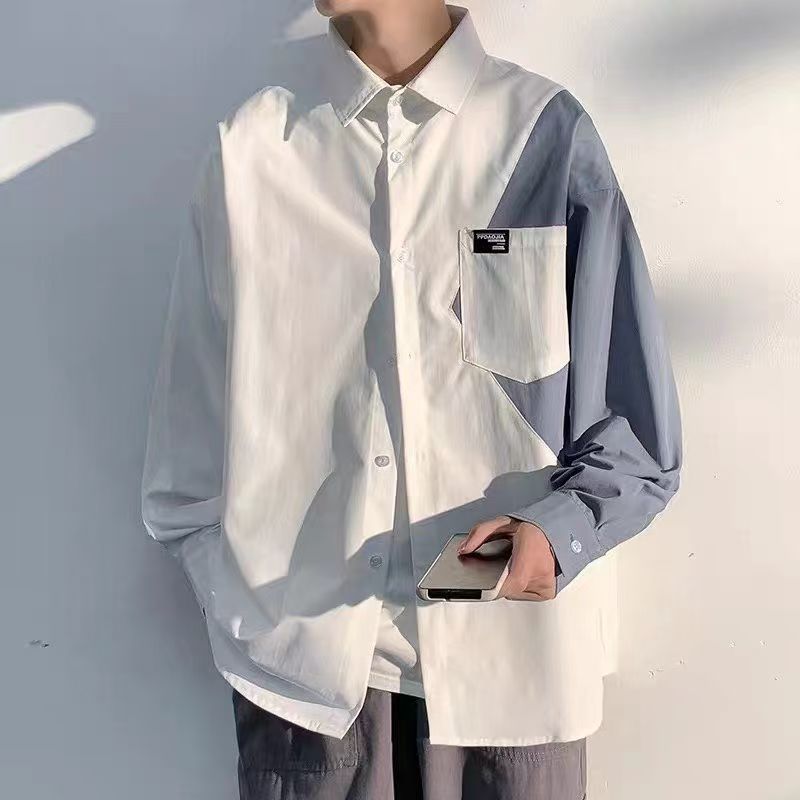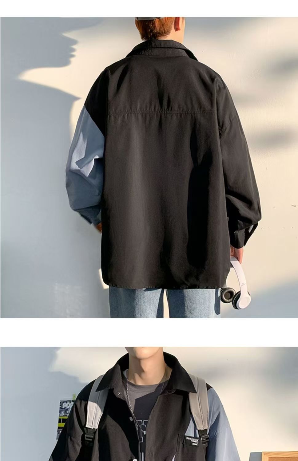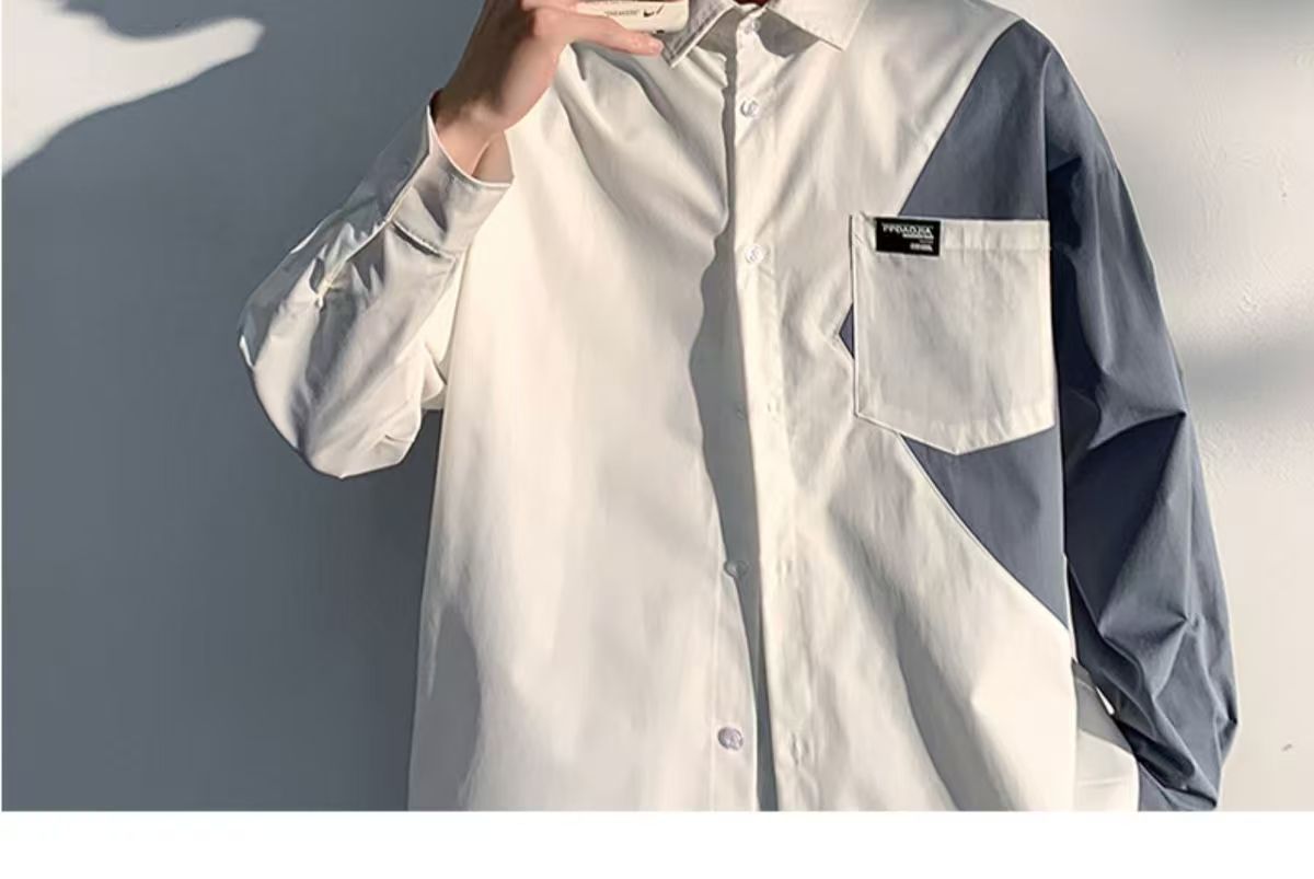 봄과 가을 홍콩 스타일 바느질 셔츠 남성용 긴팔 올매치 느슨한 디자인 센스 트렌디 브랜드 일본 스타일 셔츠 재킷 남성용 단색