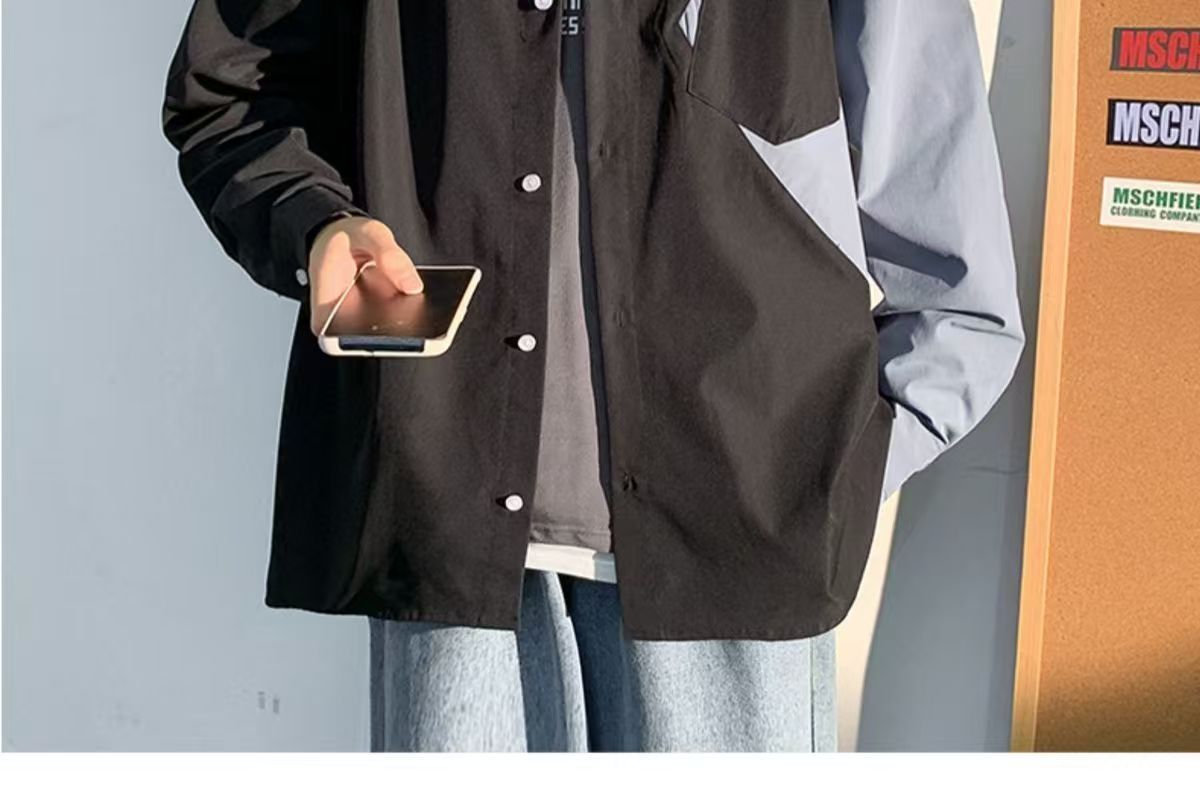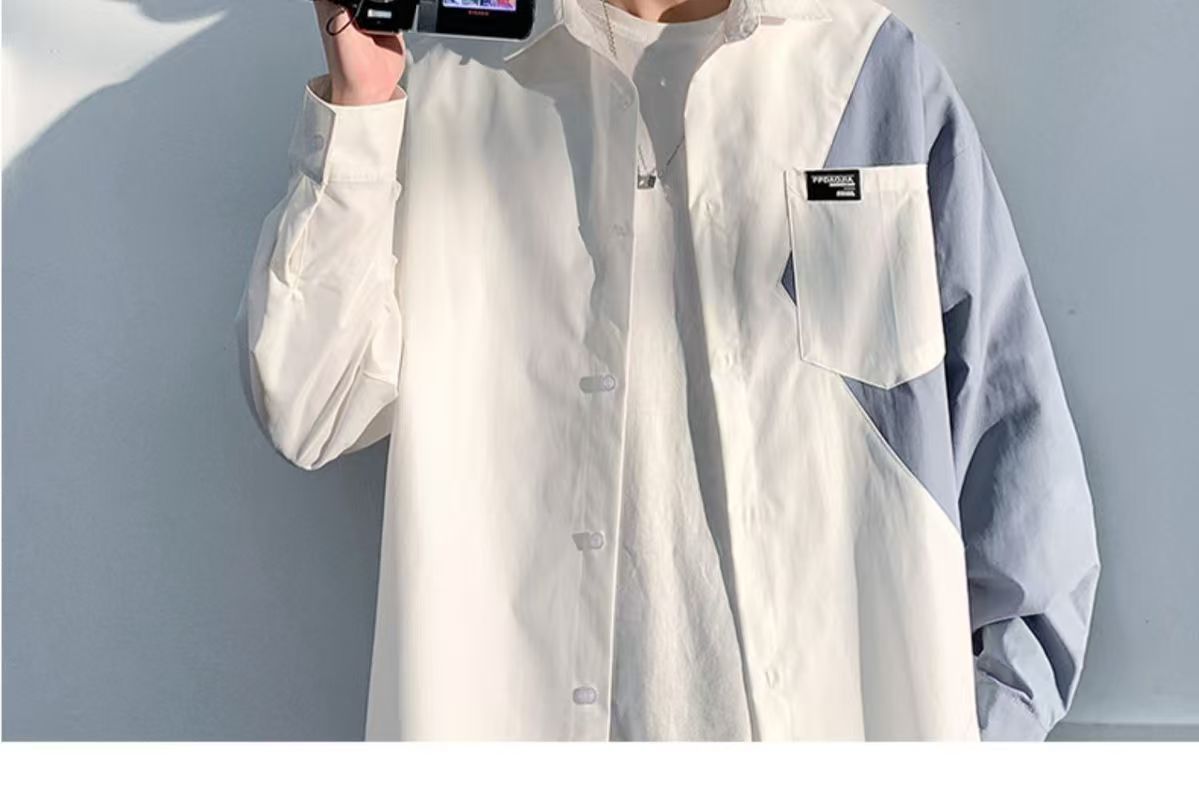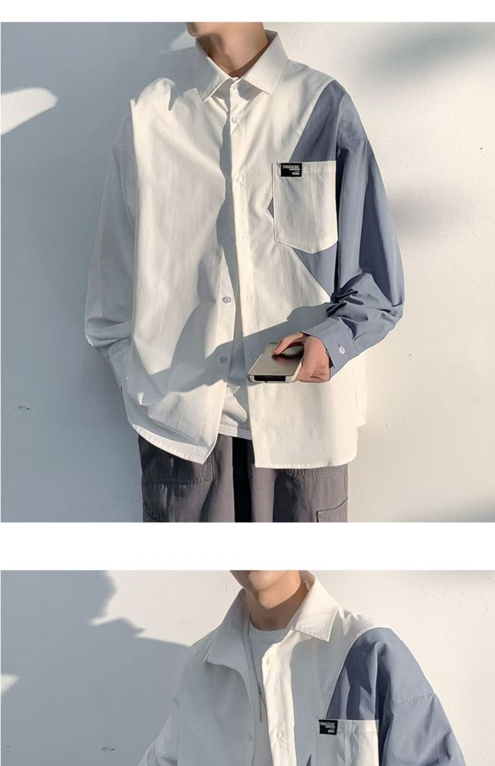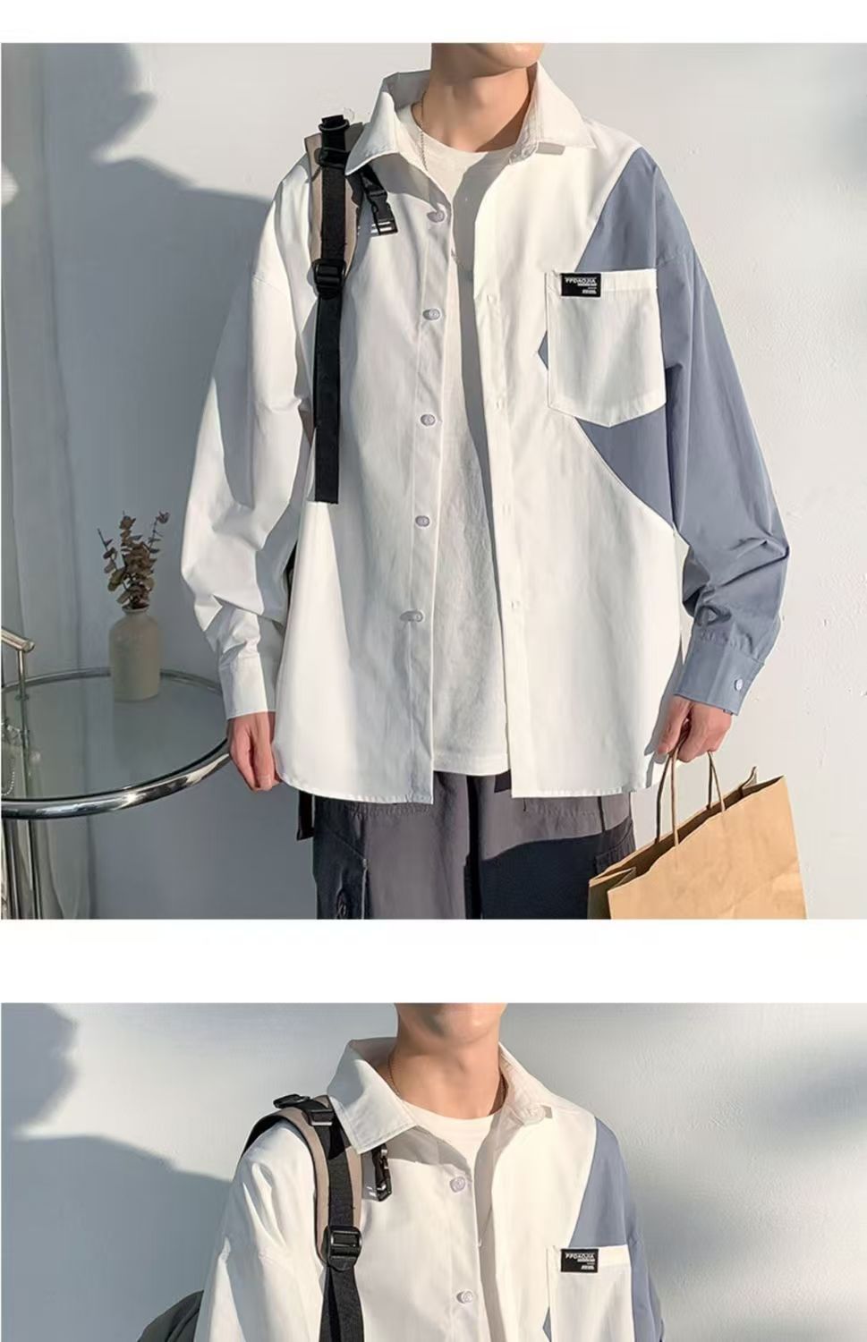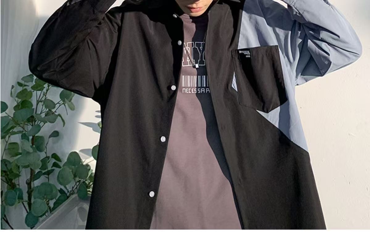 봄과 가을 홍콩 스타일 바느질 셔츠 남성용 긴팔 올매치 느슨한 디자인 센스 트렌디 브랜드 일본 스타일 셔츠 재킷 남성용 단색