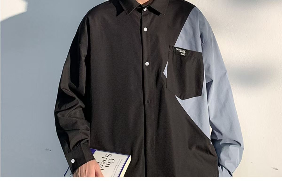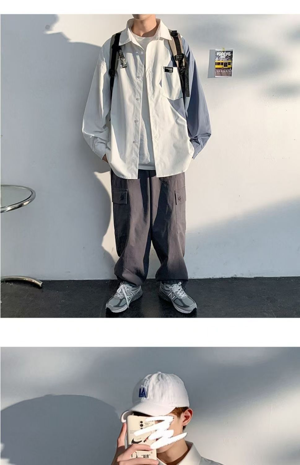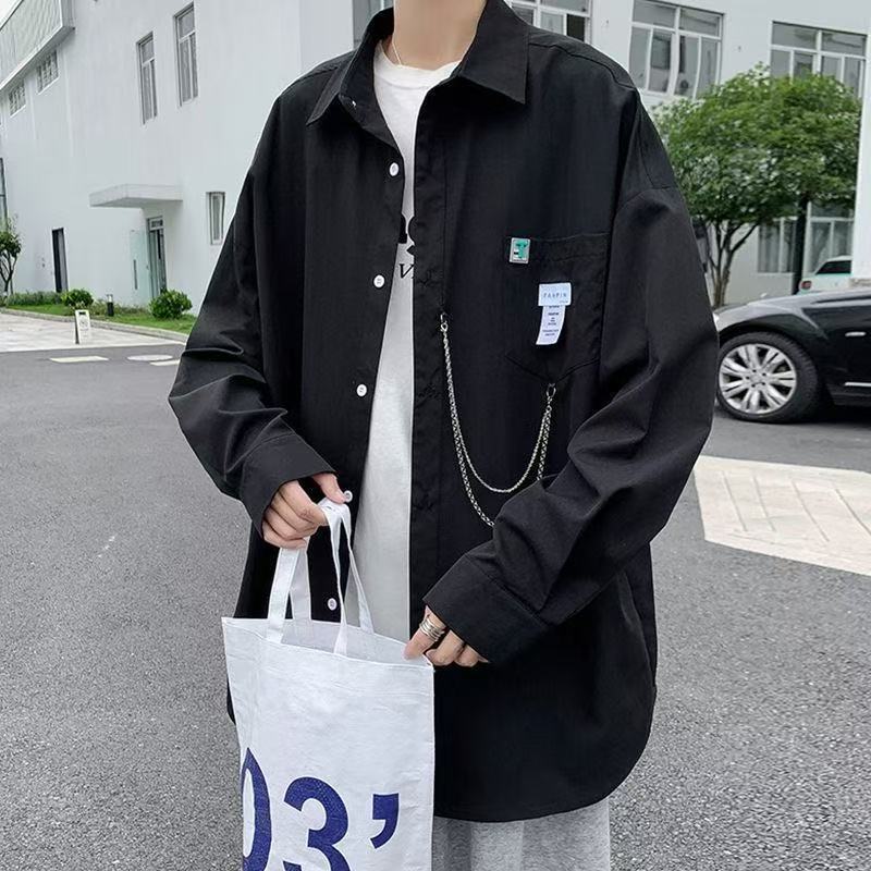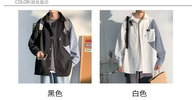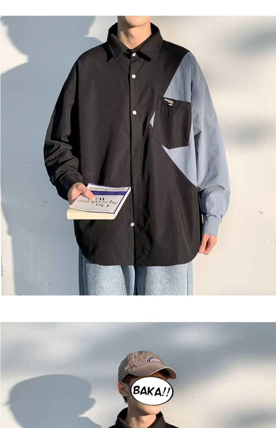 봄과 가을 홍콩 스타일 바느질 셔츠 남성용 긴팔 올매치 느슨한 디자인 센스 트렌디 브랜드 일본 스타일 셔츠 재킷 남성용 단색스토어 가기