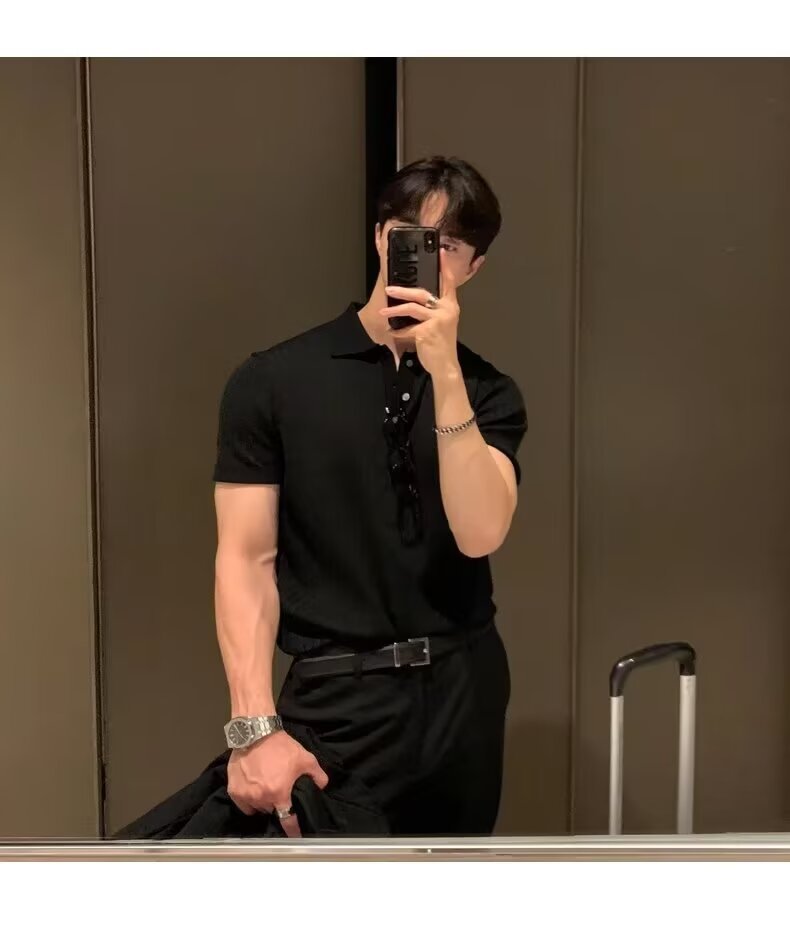 니트 반팔 티셔츠 남성용 폴로 셔츠 여름 트렌디 브랜드 하이 엔드 캐주얼 탑 패션 심플 라르 한국 티셔츠