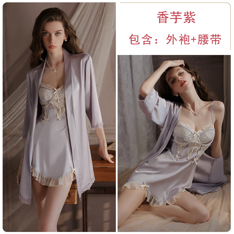 DZ Guiruo 달콤한 자수 레이스 플러스 가슴 패드 깊은 V 유혹 새틴 나이트 드레스 가운 여성의 홈 세트 4240