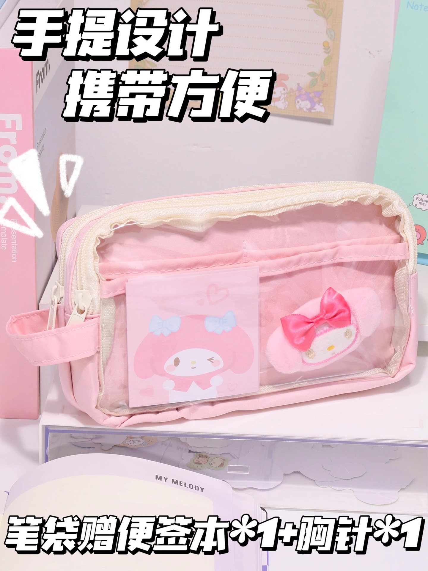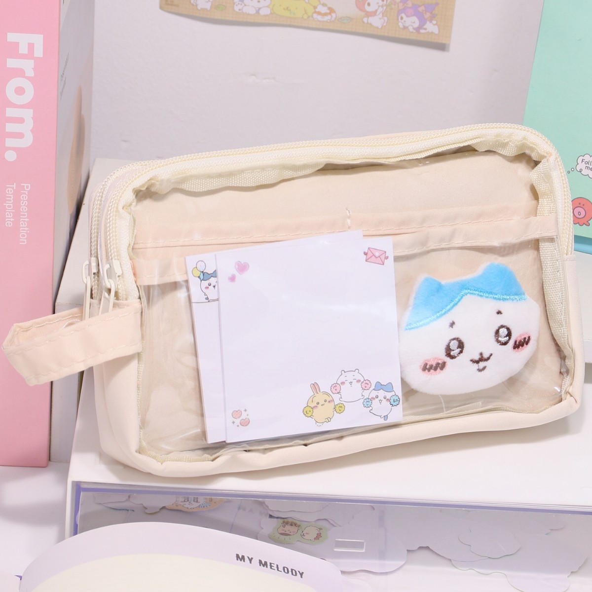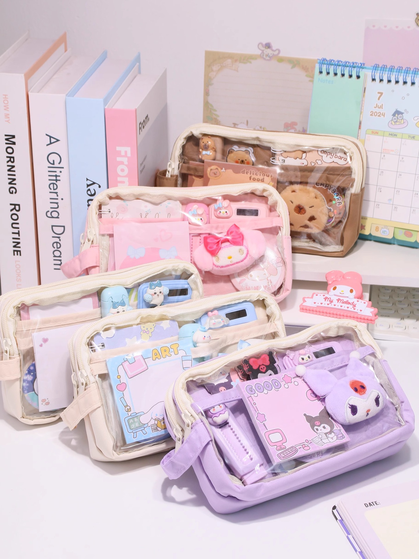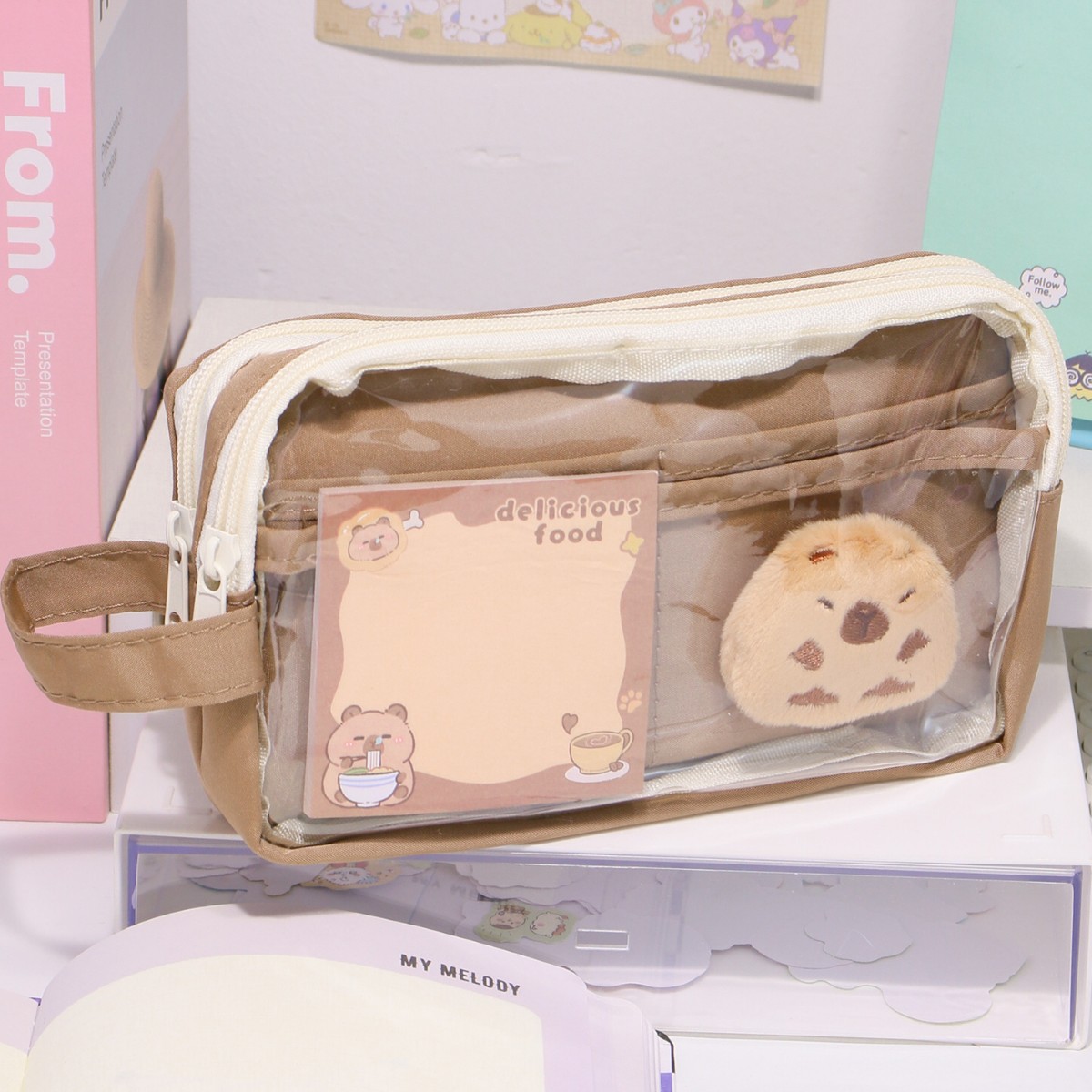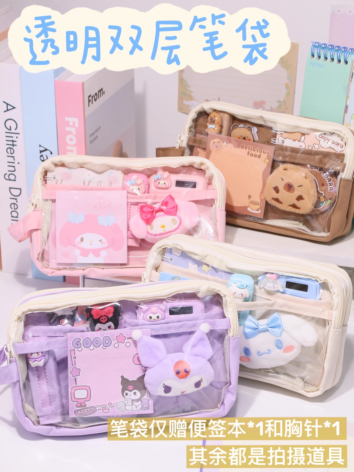 소녀스러운 투명 대용량 필통, 메모지와 브로치 포함, 다기능 수납 학생용 문구 필통
