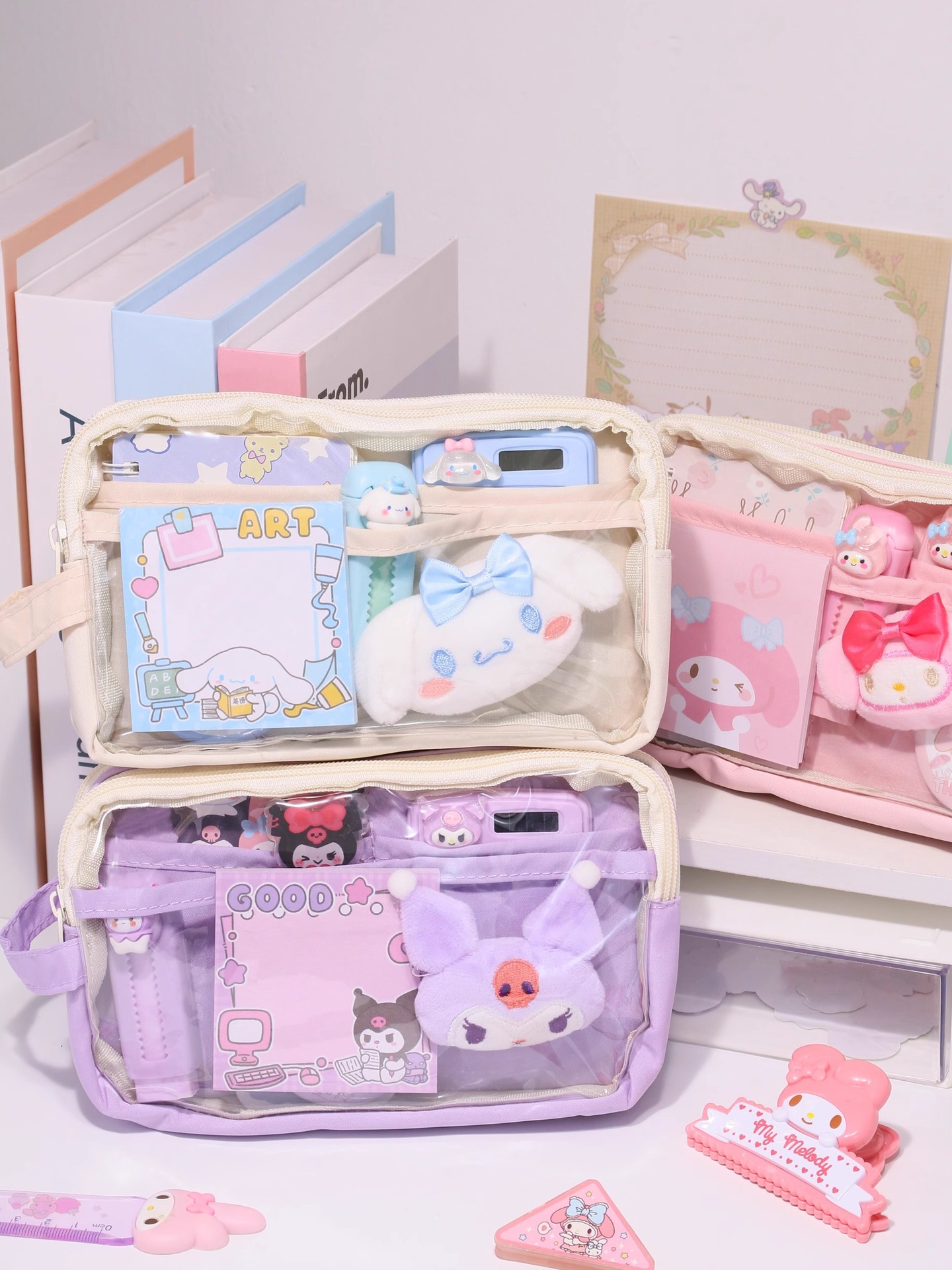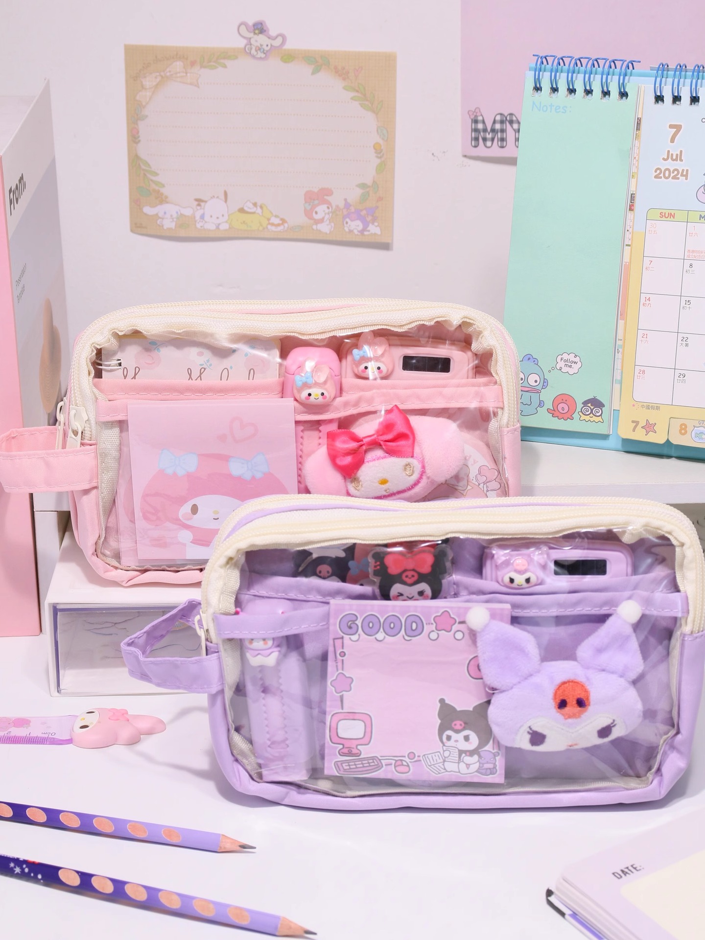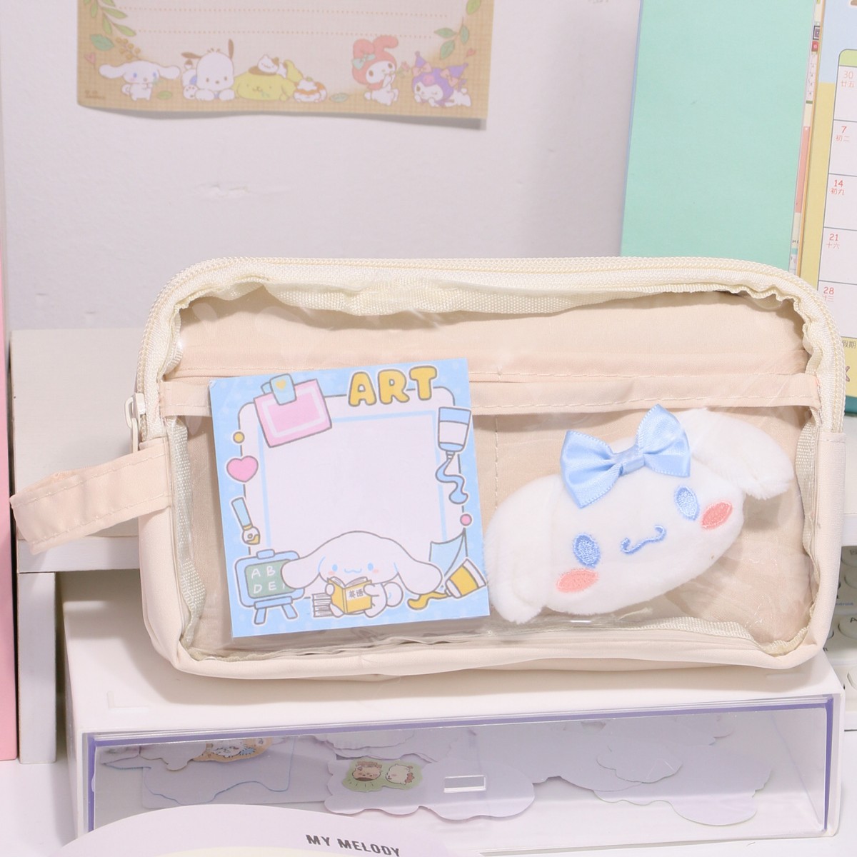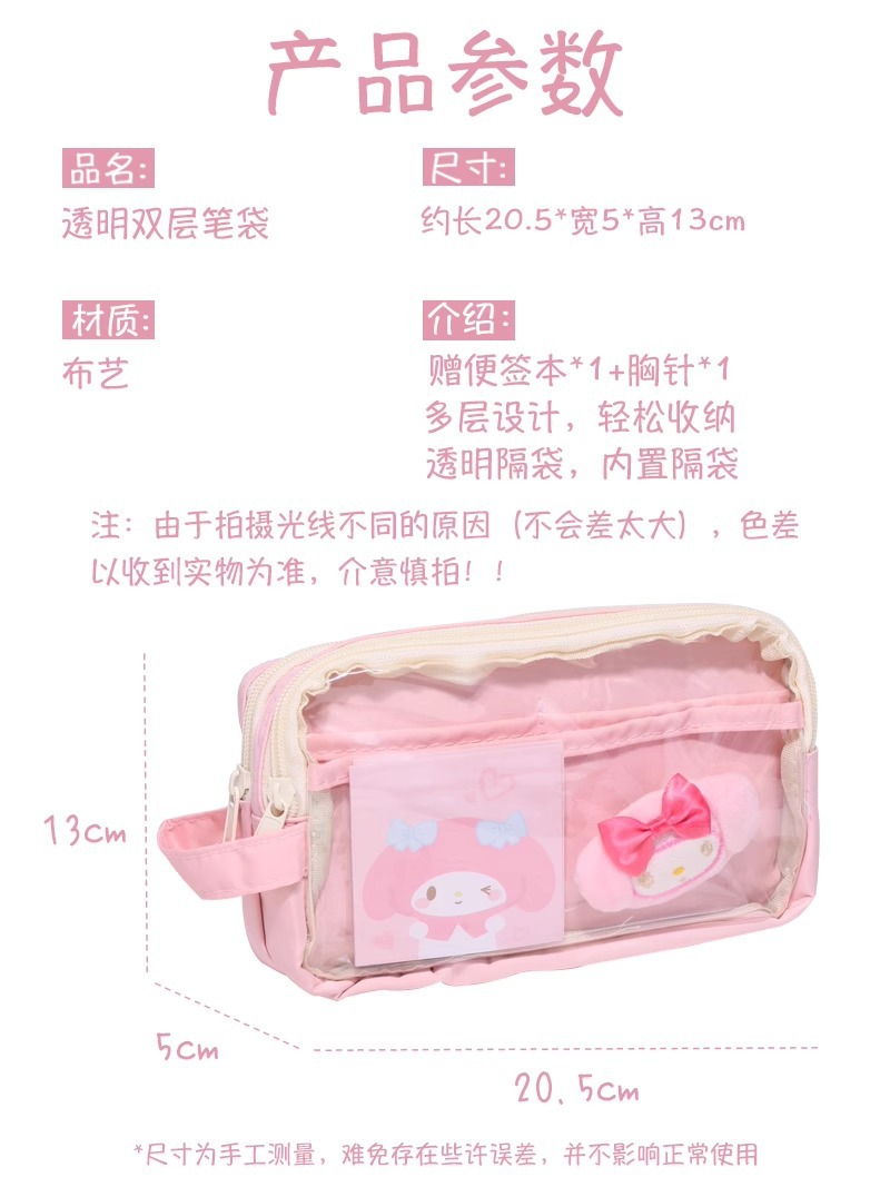 소녀스러운 투명 대용량 필통, 메모지와 브로치 포함, 다기능 수납 학생용 문구 필통