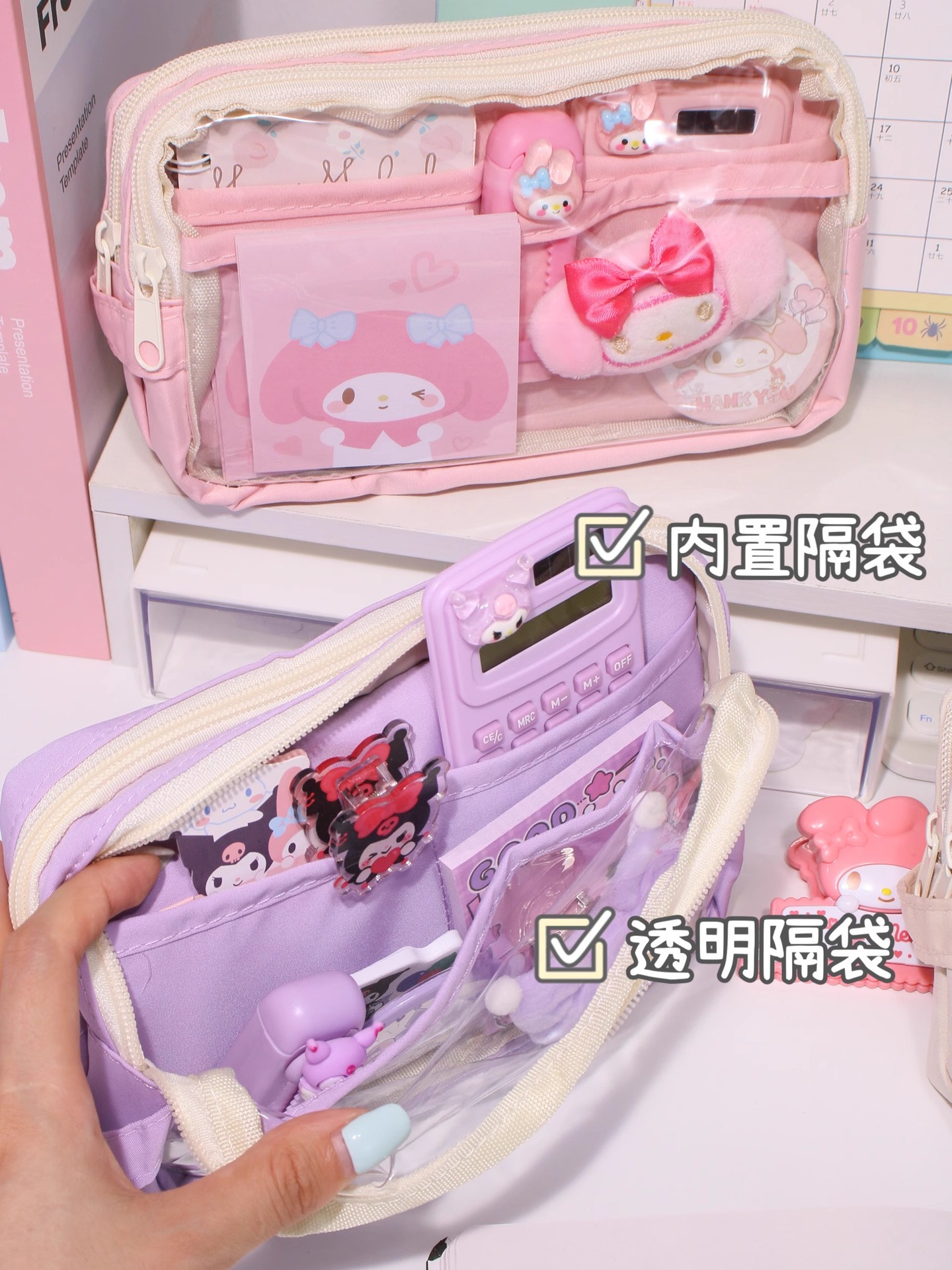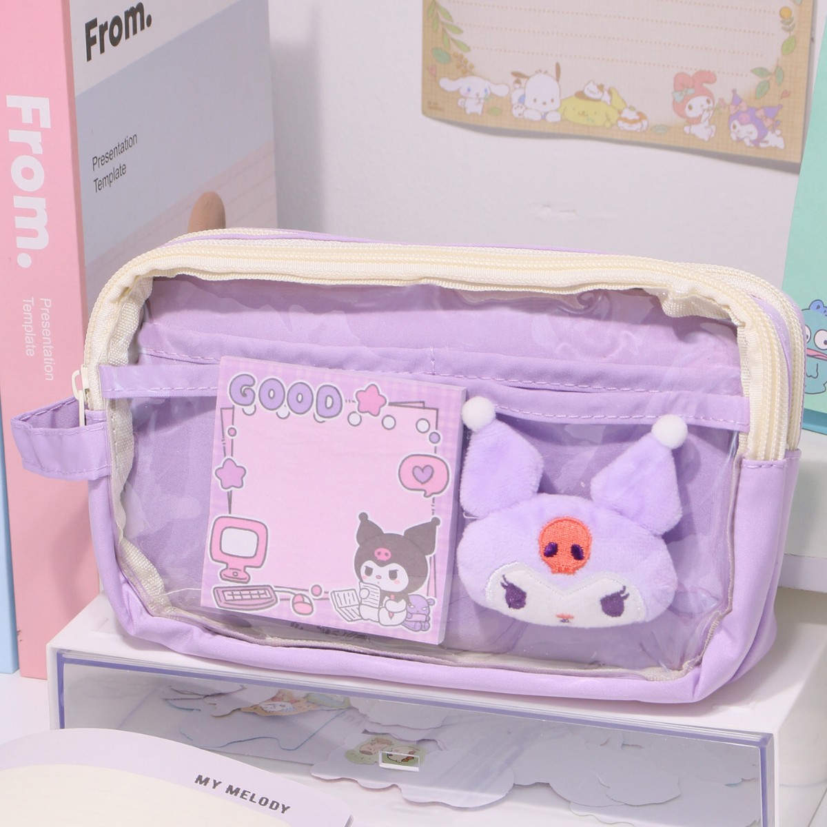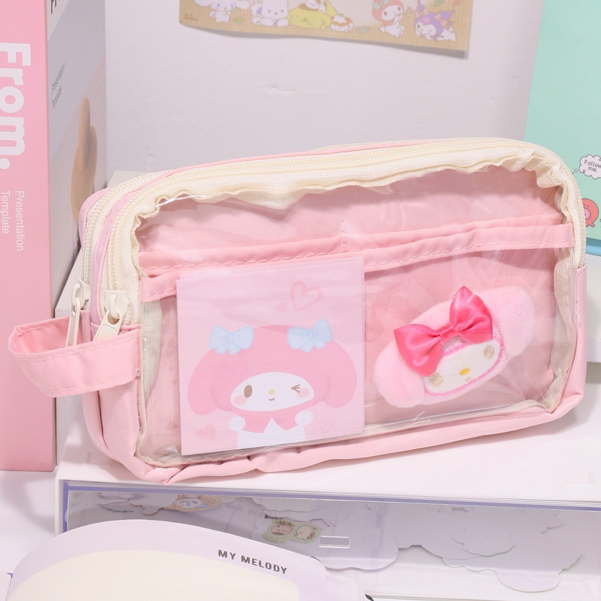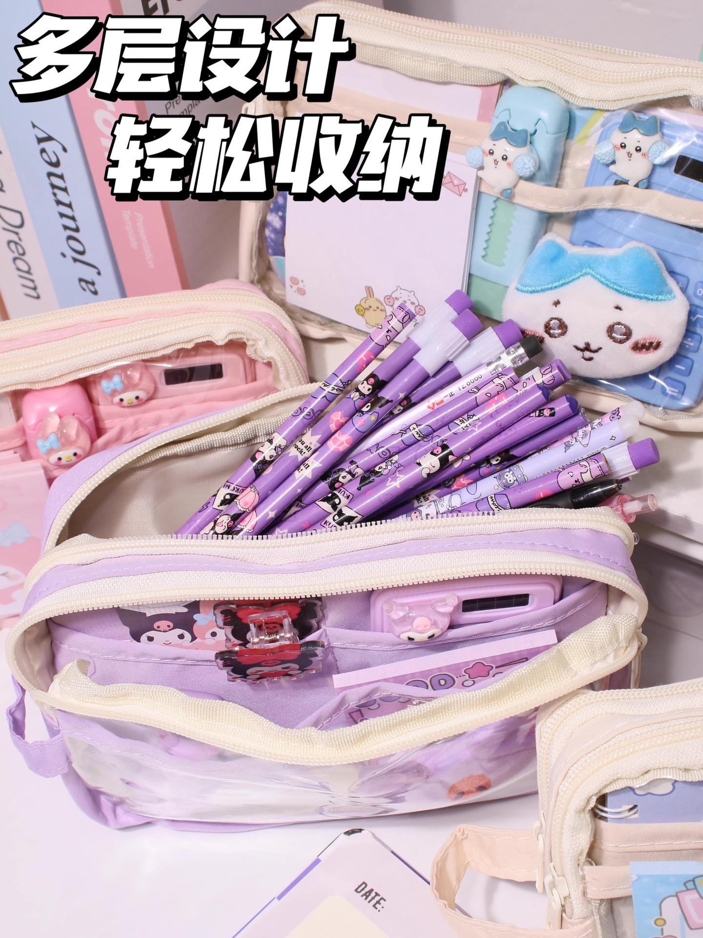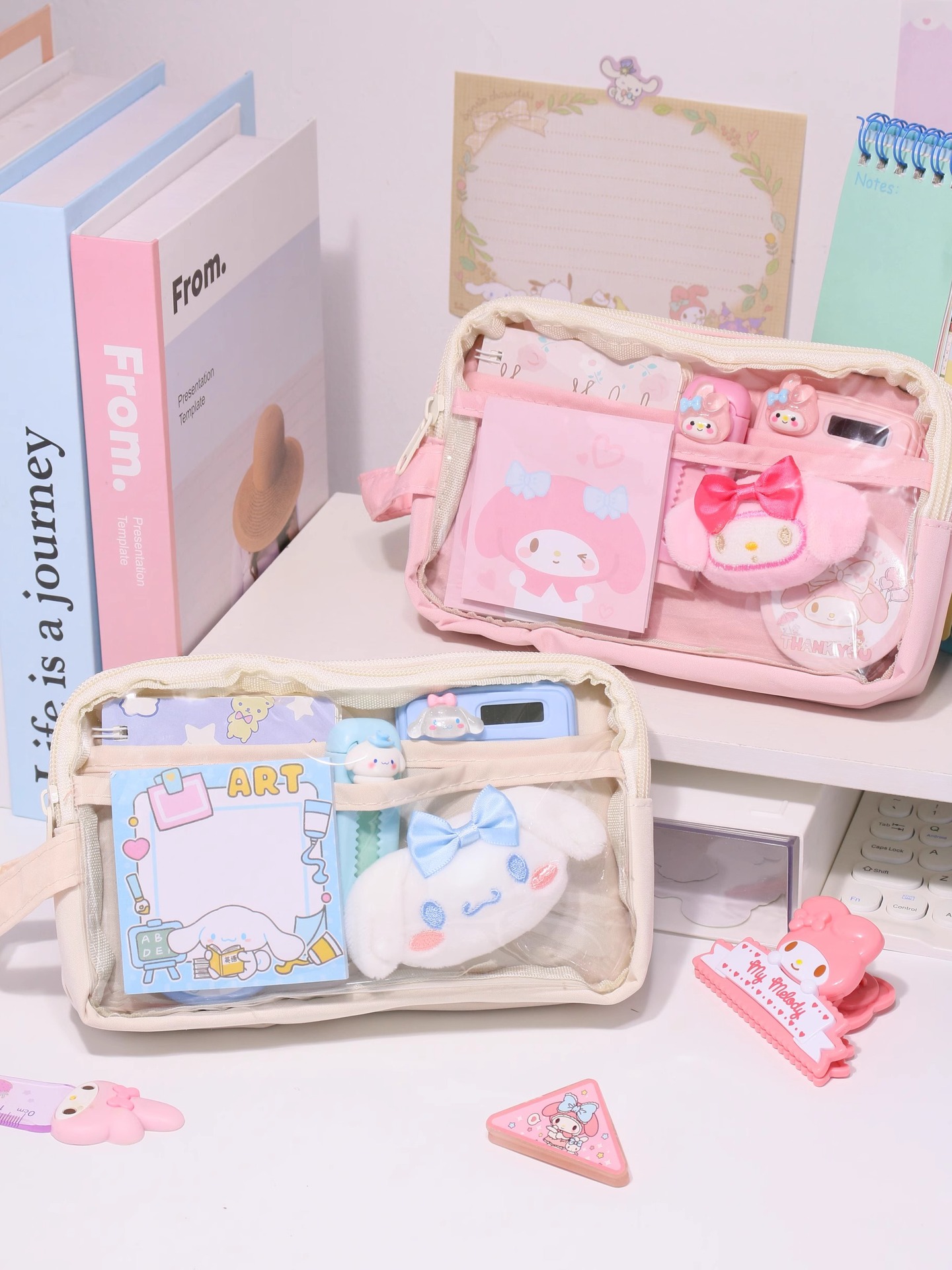 소녀스러운 투명 대용량 필통, 메모지와 브로치 포함, 다기능 수납 학생용 문구 필통