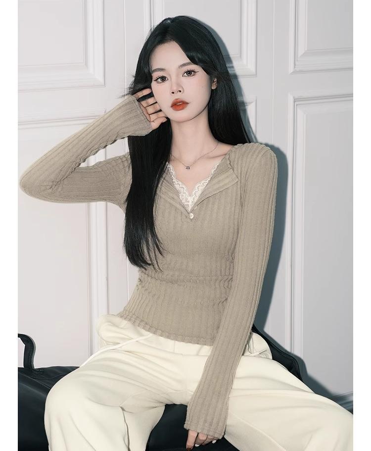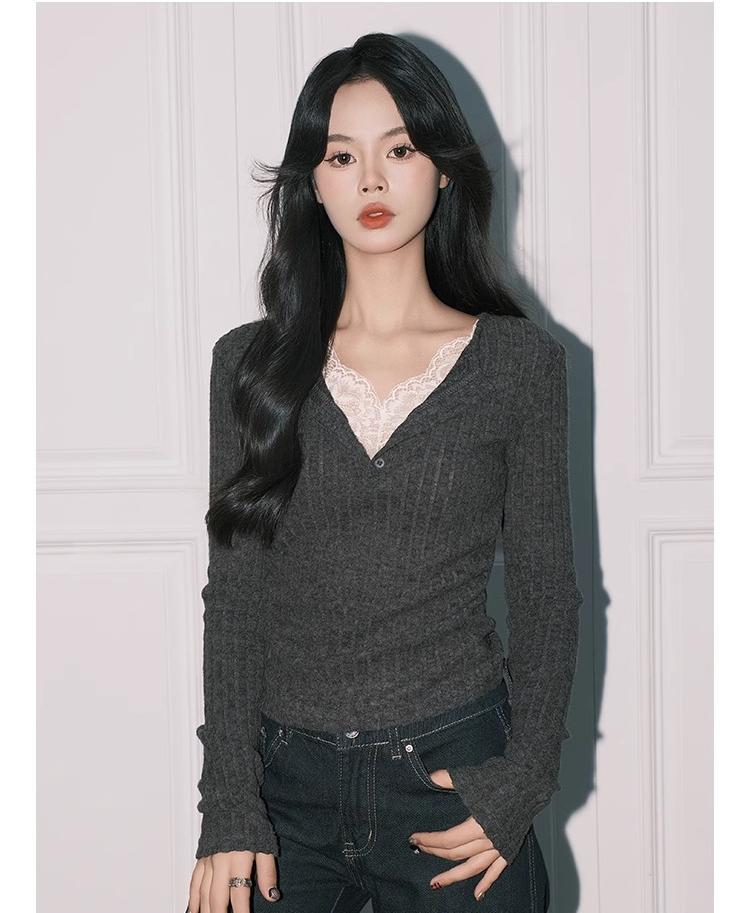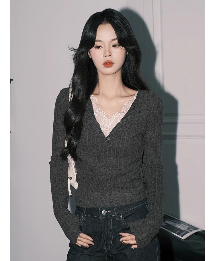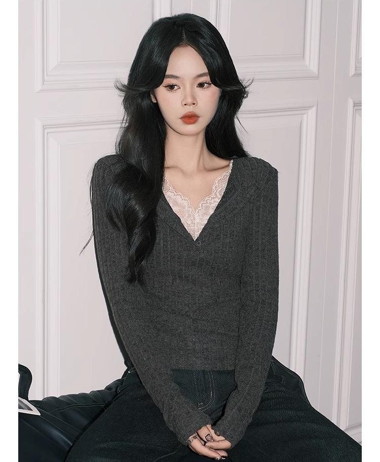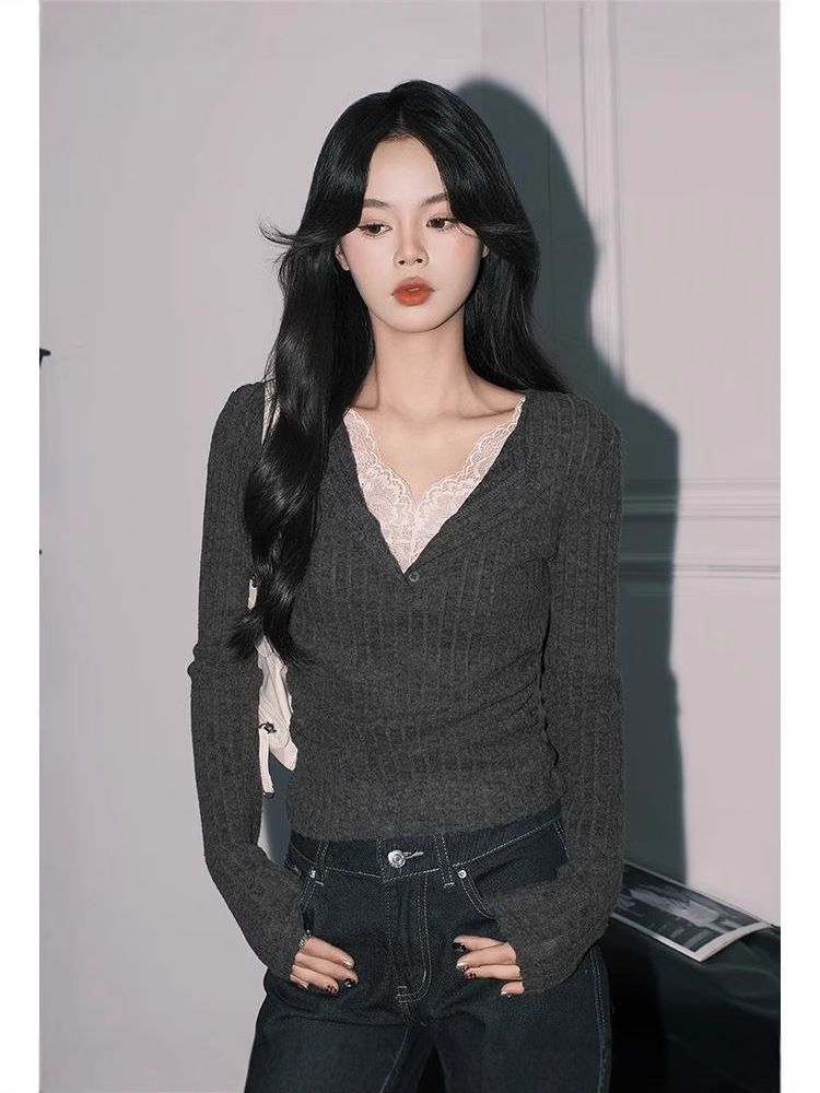 우아한 그레이 레이스 페이크 투피스 V 넥 니트 작은 셔츠 여성용 순수 슬림 핏 긴팔 베이스 탑스토어 가기