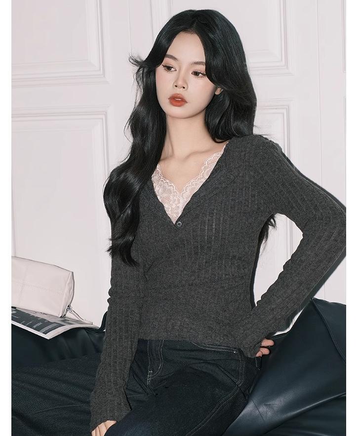 우아한 그레이 레이스 페이크 투피스 V 넥 니트 작은 셔츠 여성용 순수 슬림 핏 긴팔 베이스 탑