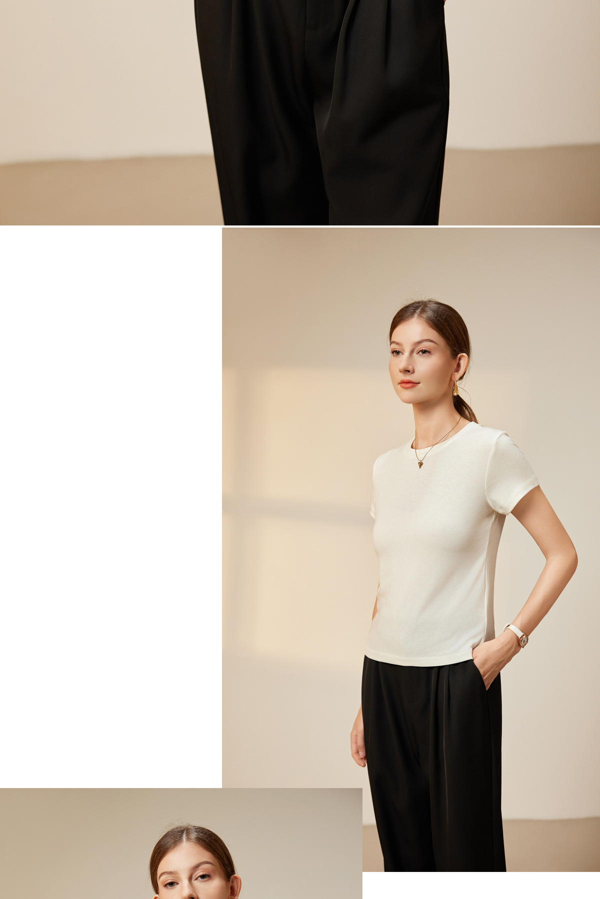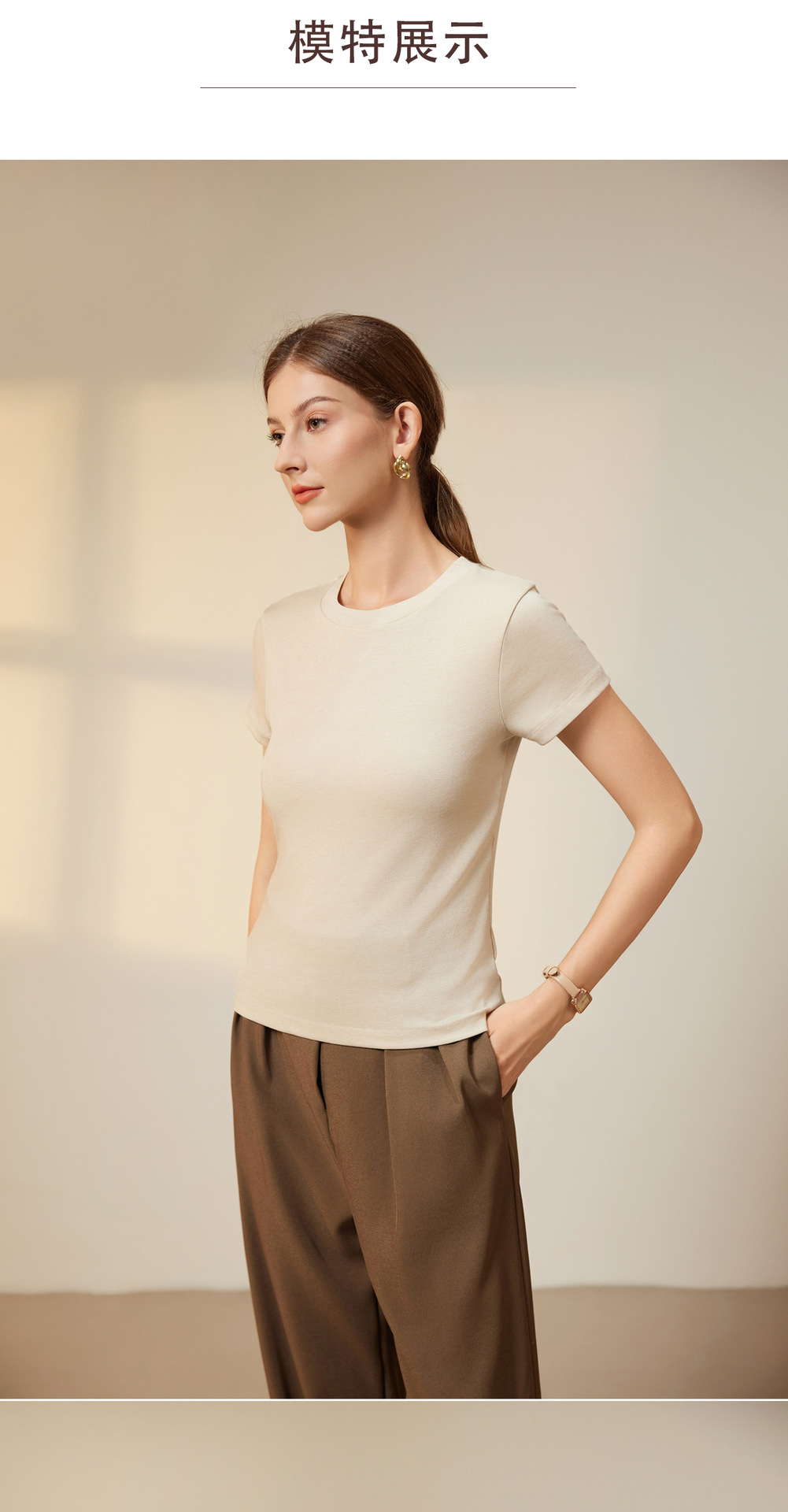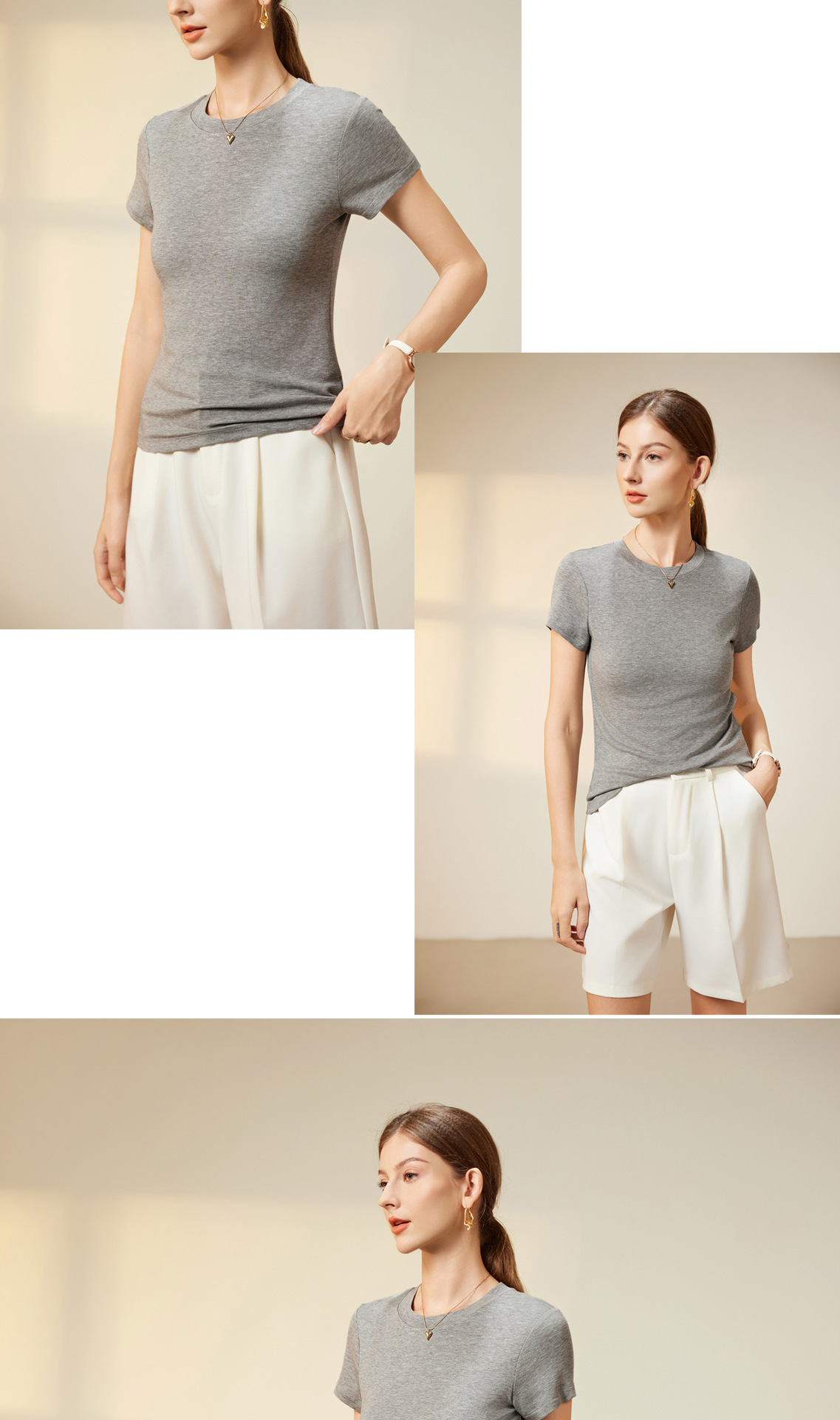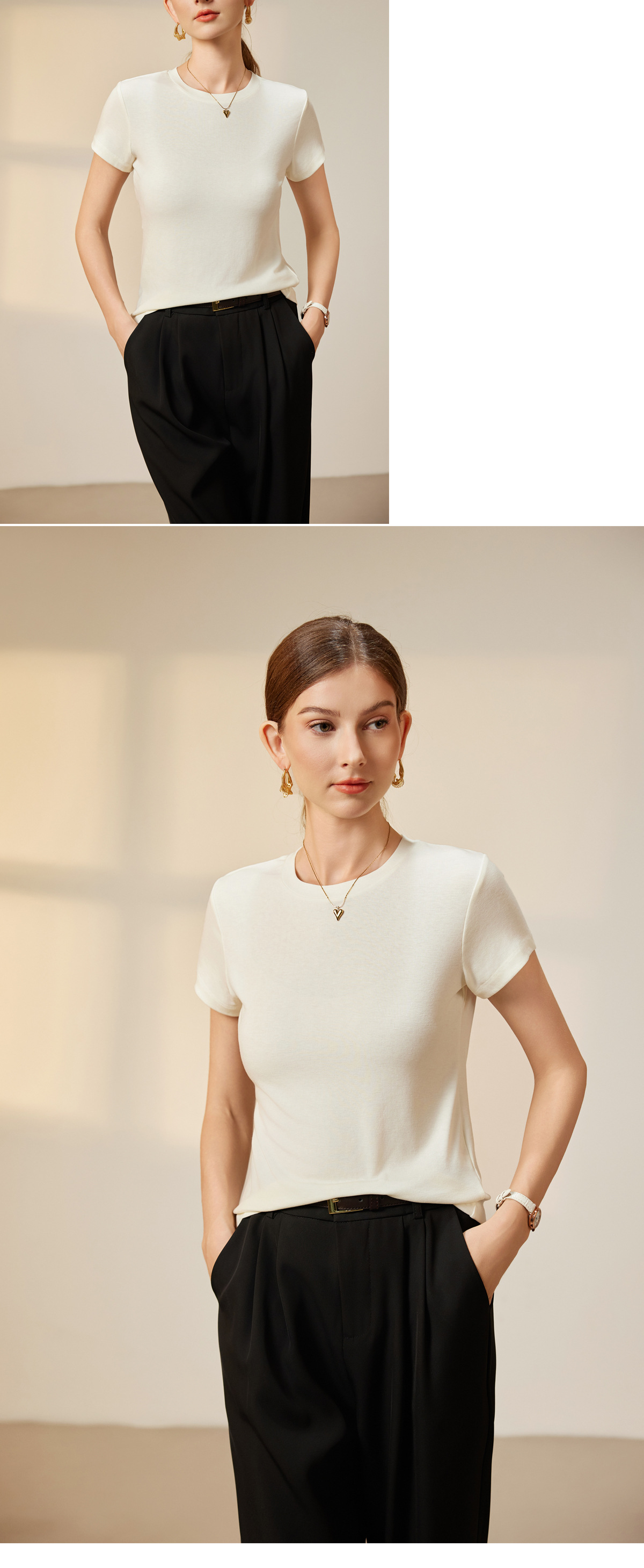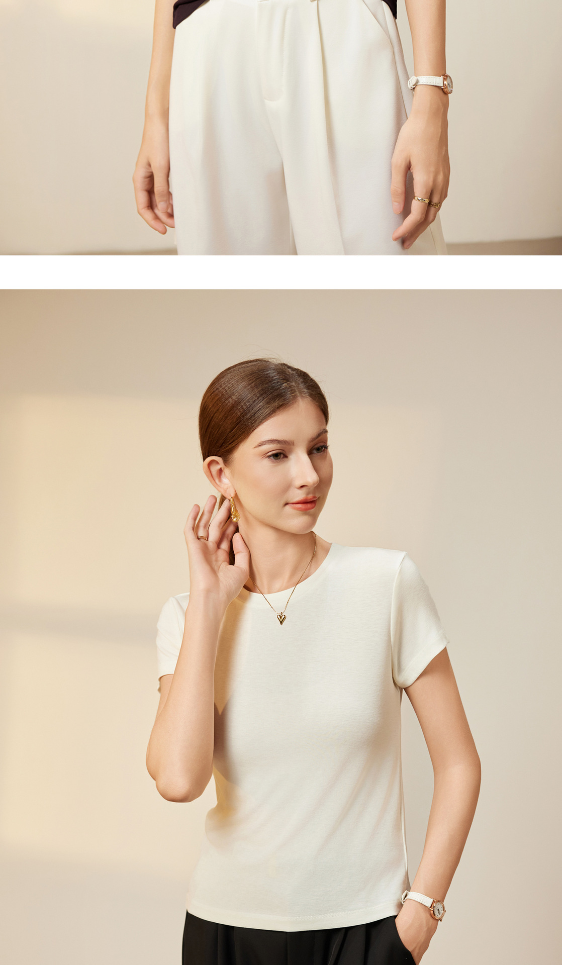 새로운! 여성용 자이언트 소프트 스몰 라운드 넥 탑 2025 봄 여름 여성용 리오셀 + 아세테이트 + 울 티셔츠스토어 가기