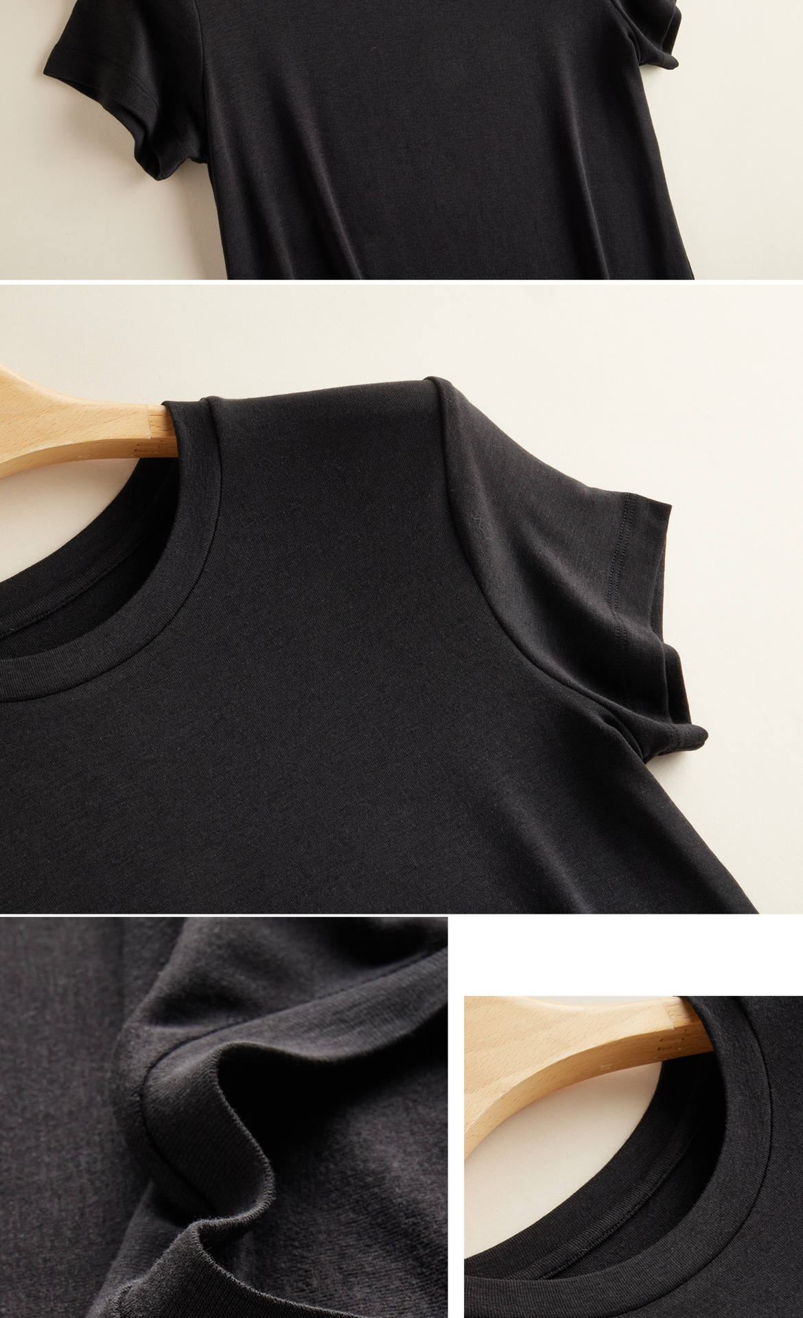 새로운! 여성용 자이언트 소프트 스몰 라운드 넥 탑 2025 봄 여름 여성용 리오셀 + 아세테이트 + 울 티셔츠