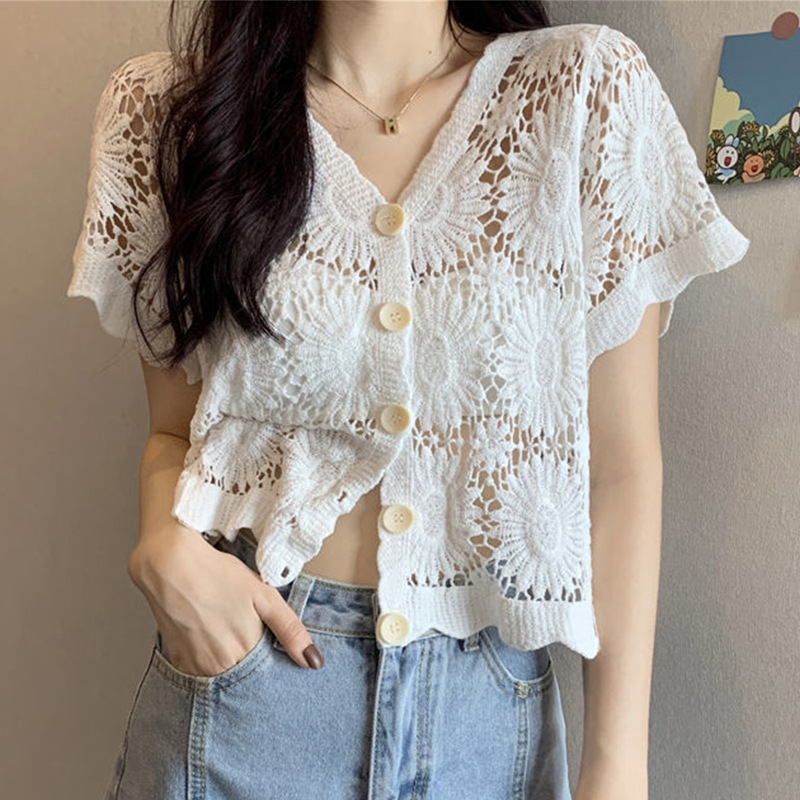 공장 직접 공급 새로운 한국 스타일 중공 크로 셰 스웨터 여성 올 매치 게으른 스타일 나이 감소 얇은 카디건 탑스토어 가기